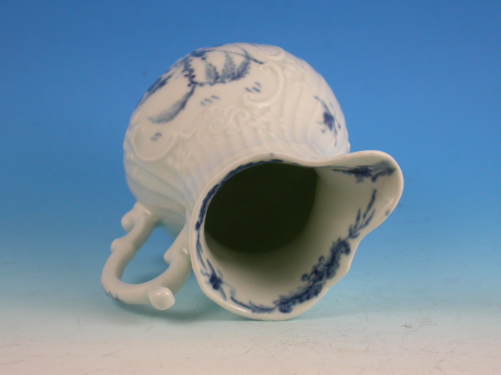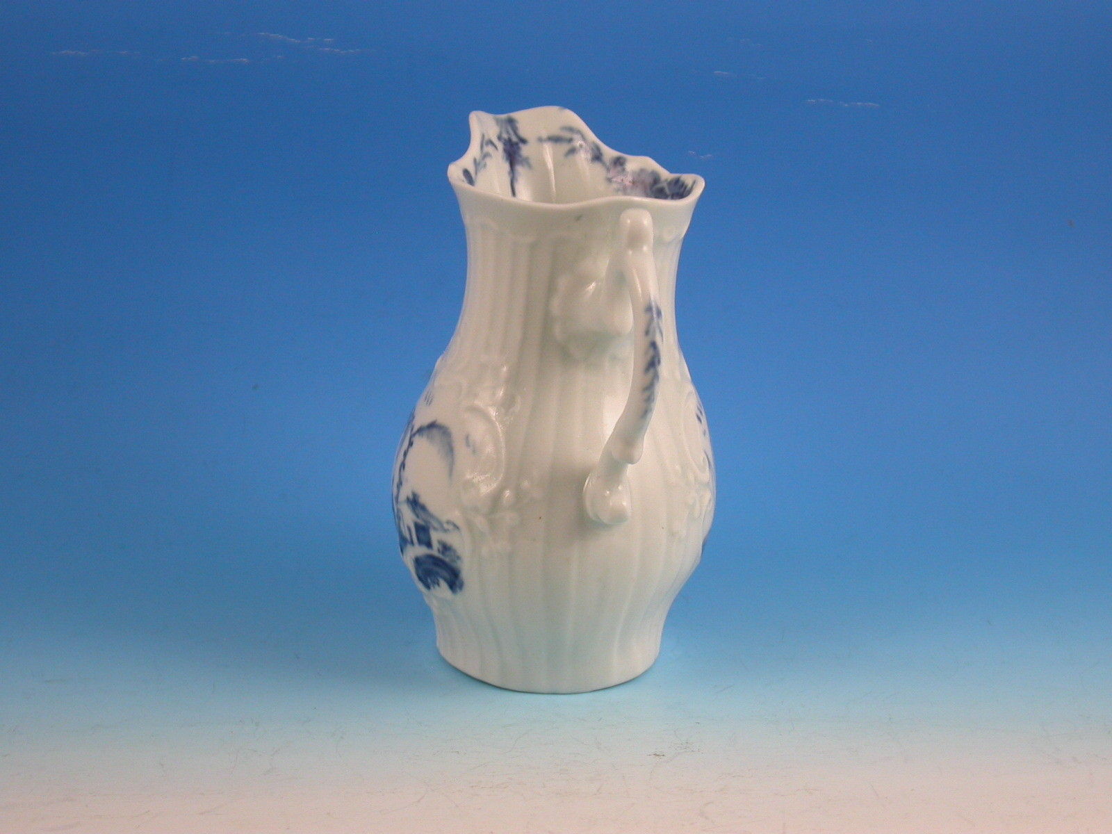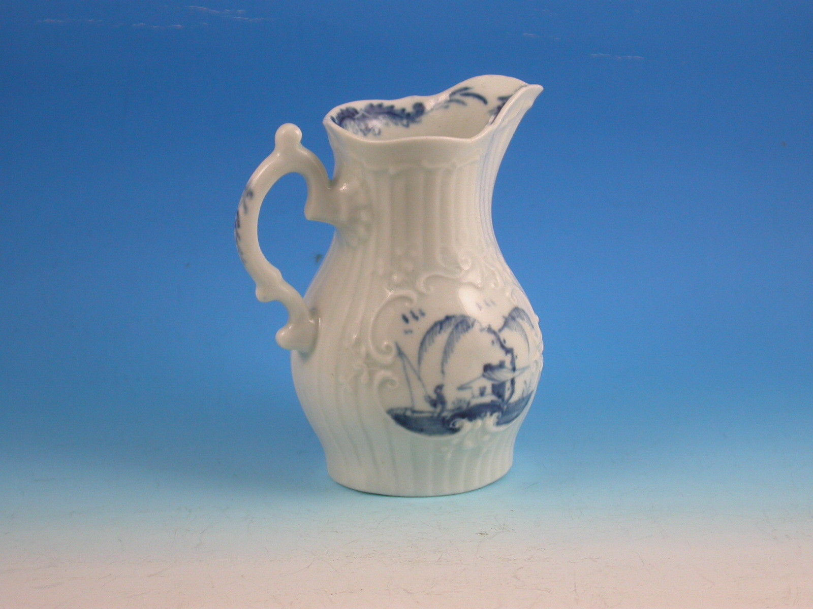 A good early Worcester spiral moulded Cream Jug of small size with scrolled handle and thumb piece, painted in the mirror shaped reserves with the ""Fisherman and Willow Pavilion pattern"", depicting a fisherman seated under a willow tree and a house to the side, the interior border with a leaf garland.