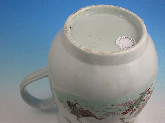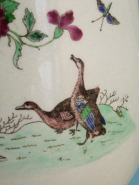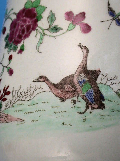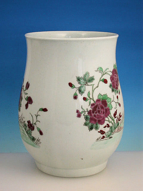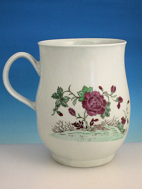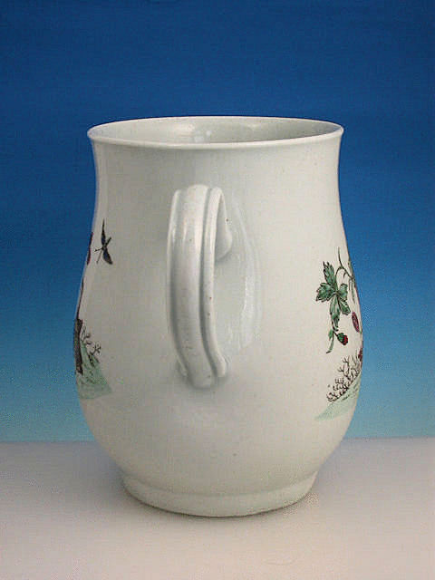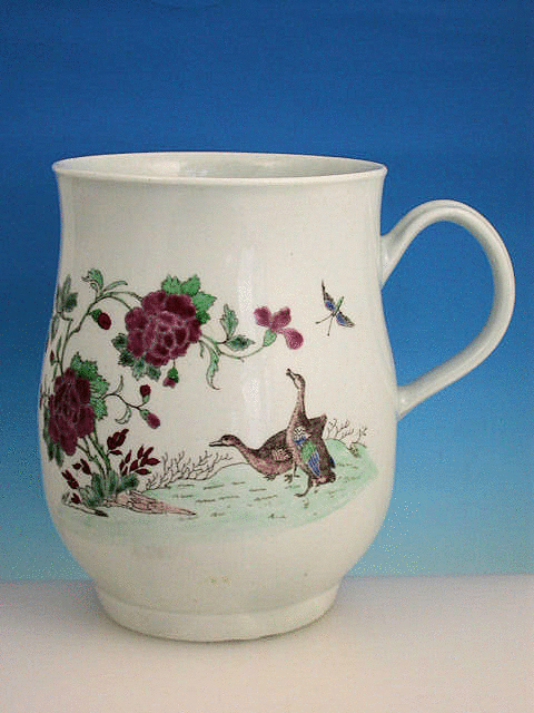 A very rare Early Worcester bell shaped Mug of large size with grooved strap handle, printed in black outline and painted in famille rose colours with two geese standing by a flowering Peony plant and flying insects, a smaller group of flowering plants to the reverse.