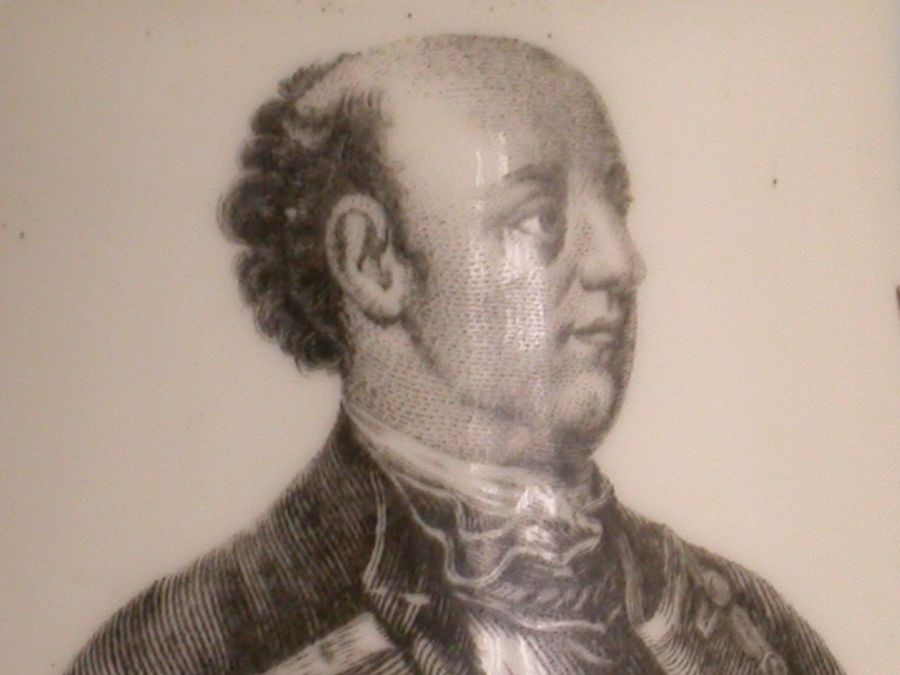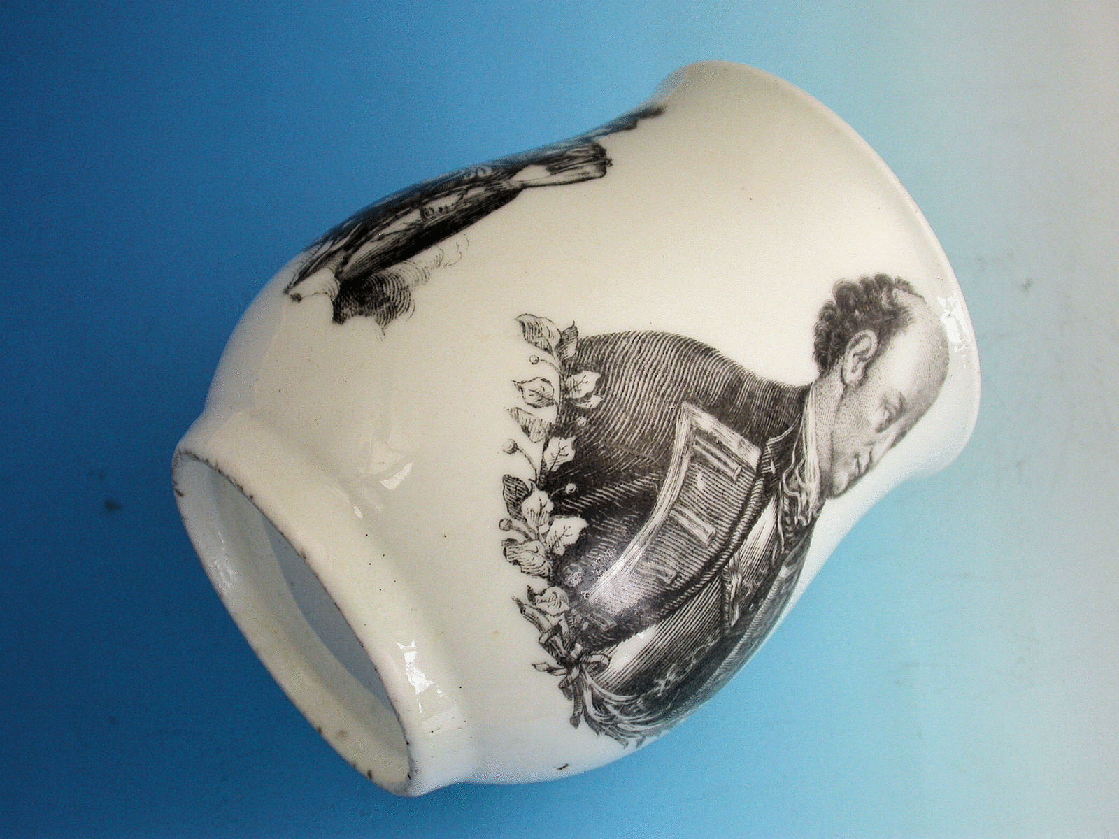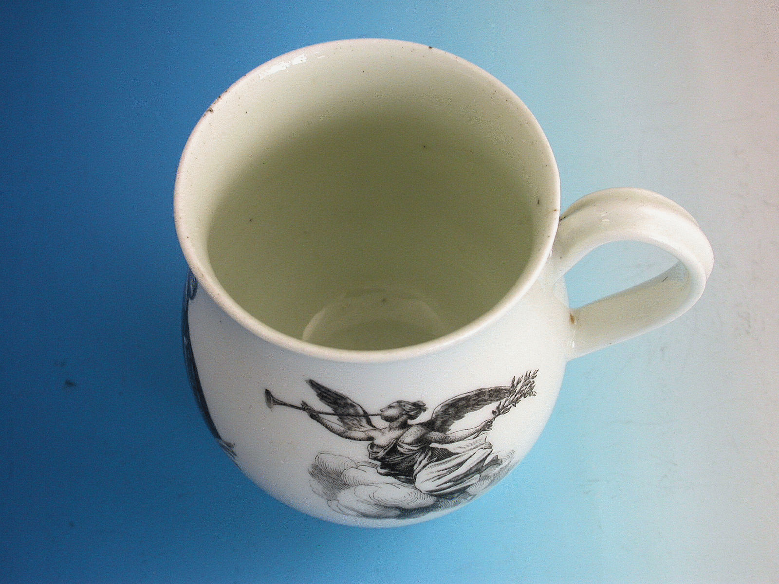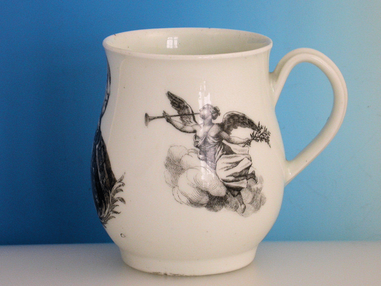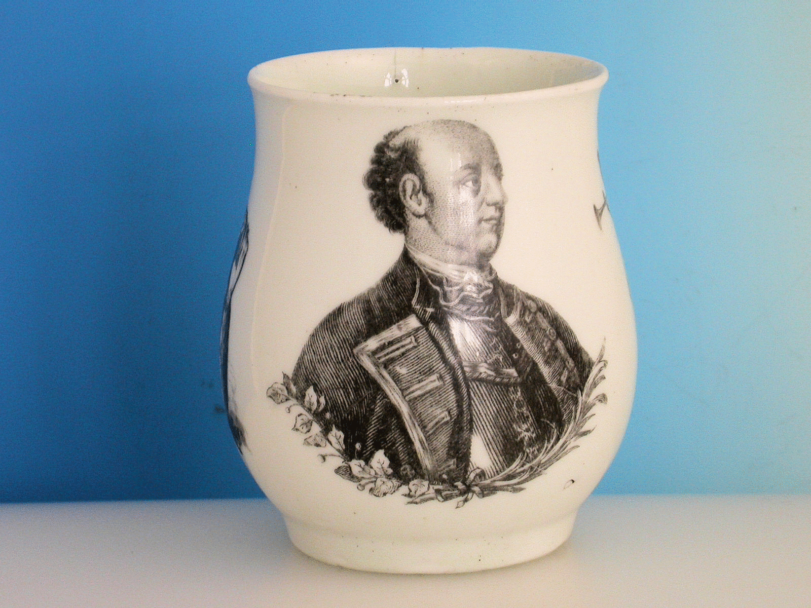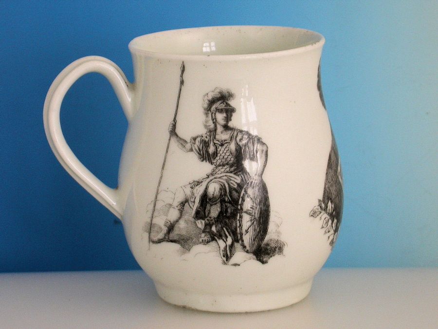 A fine early Worcester bell shaped Mug with grooved strap handle, printed in black with a portrait of General John Manners, The Marquis of Granby, engraved by Robert Hancock, flanked by Fame flying amidst clouds blowing a single trumpet and a variant of Mars.