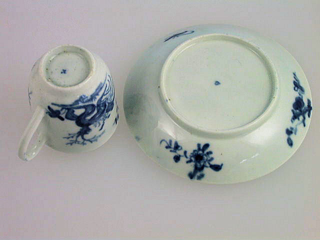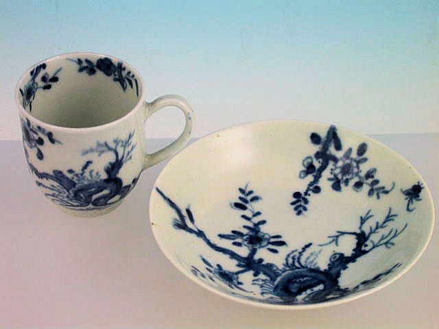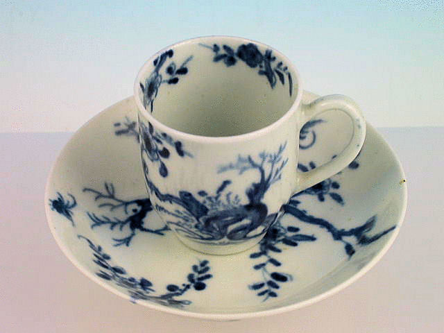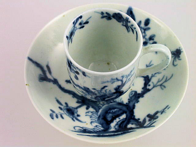 A fine early Worcester miniature Coffee Cup and Saucer of ‘U’ shape form with solid trap handle, painted in underglaze blue with the “Prunus Root pattern”. c1756-58.