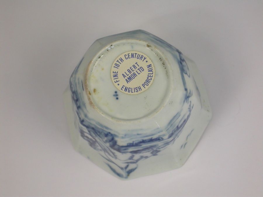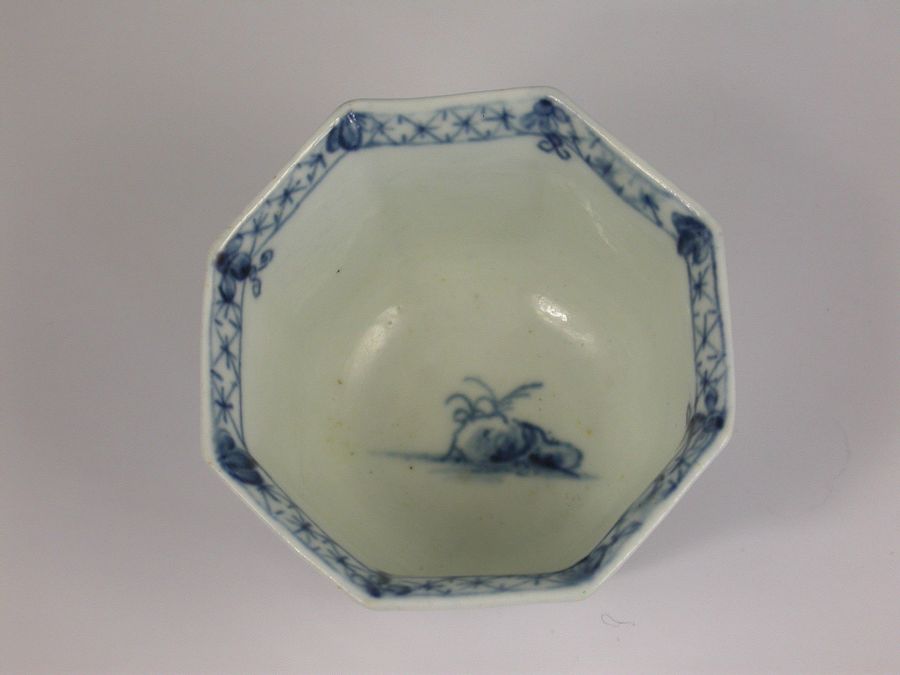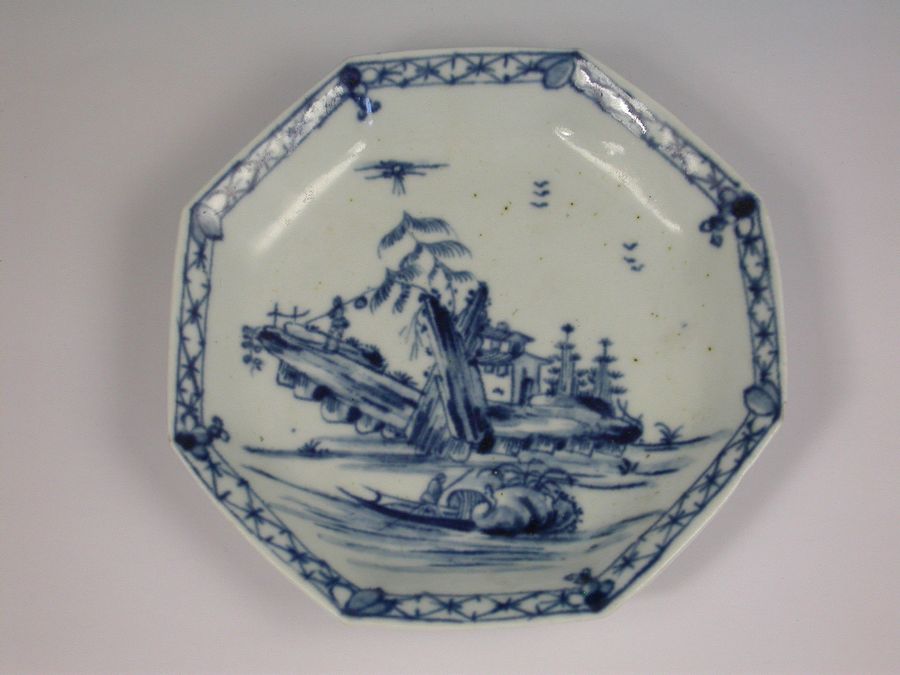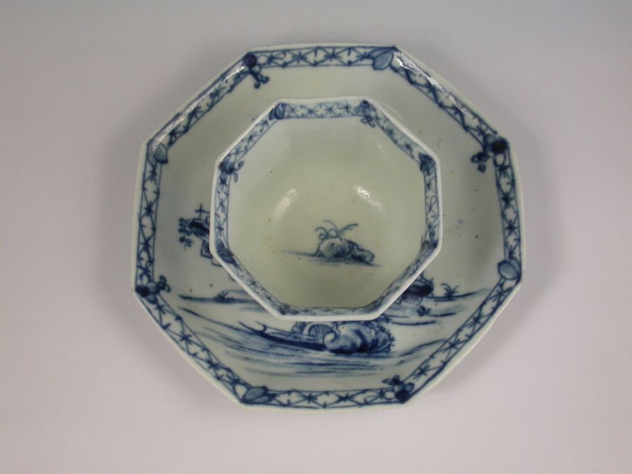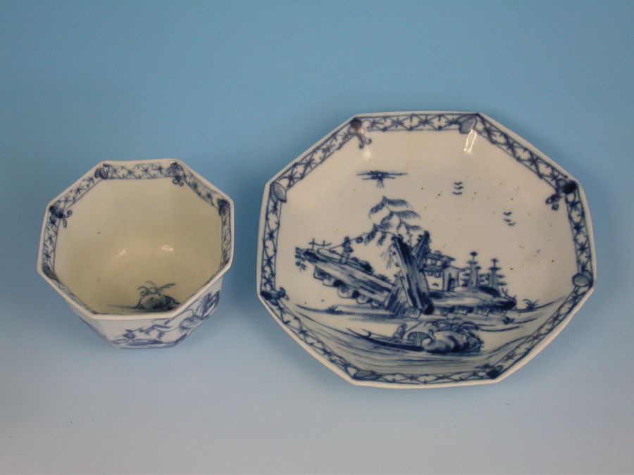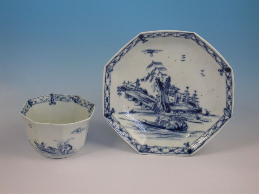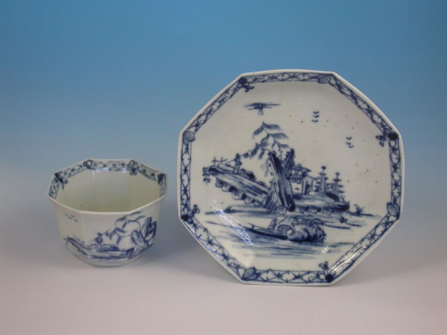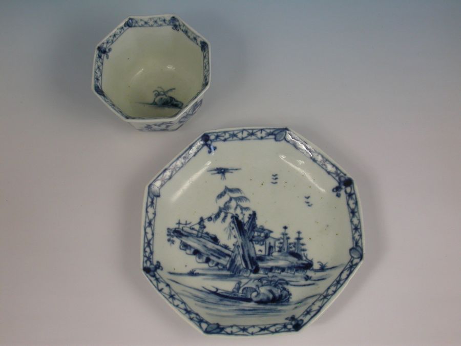 A fine and rare early Worcester octagonal Teabowl and Saucer, painted in under-glaze blue with the Romantic Rocks pattern depicting a pagoda situated on a rocky island with trees in the background and a Chinaman in a sanpan in the foreground, all within a cross hatched border.