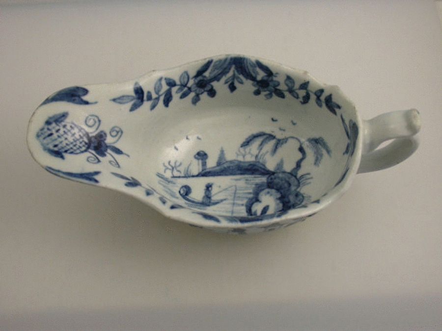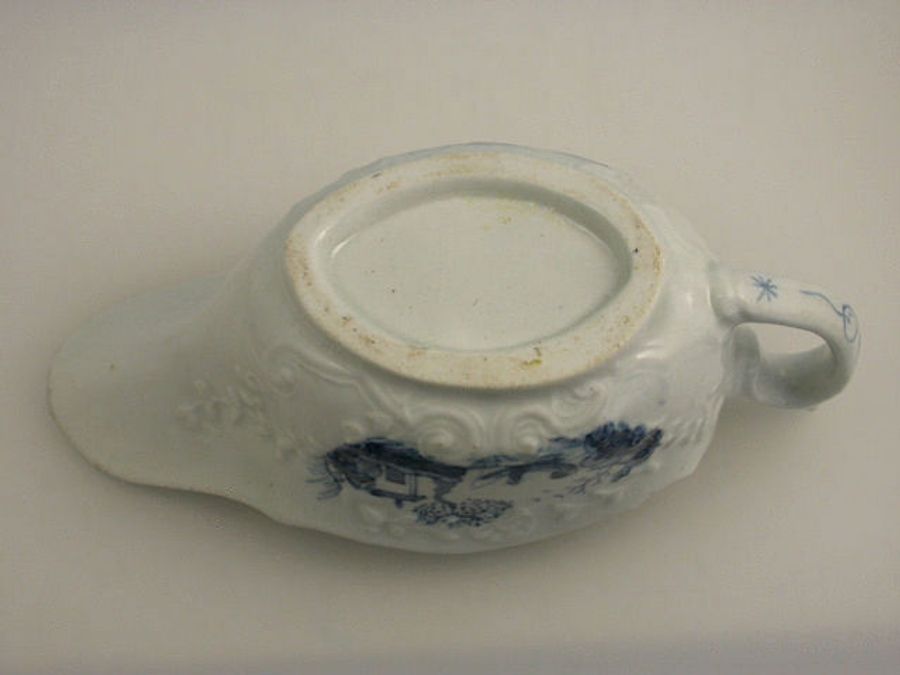 A fine and rare early Worcester small silver shaped Sauceboat with flat base and loop handle with thumb rest, moulded in relief with rococo shell and scroll foliate bordered panels painted in underglaze blue with Chinese style figures and river scenes, the interior with a Chinaman fishing from a boat within a border of floral and foliate sprays.