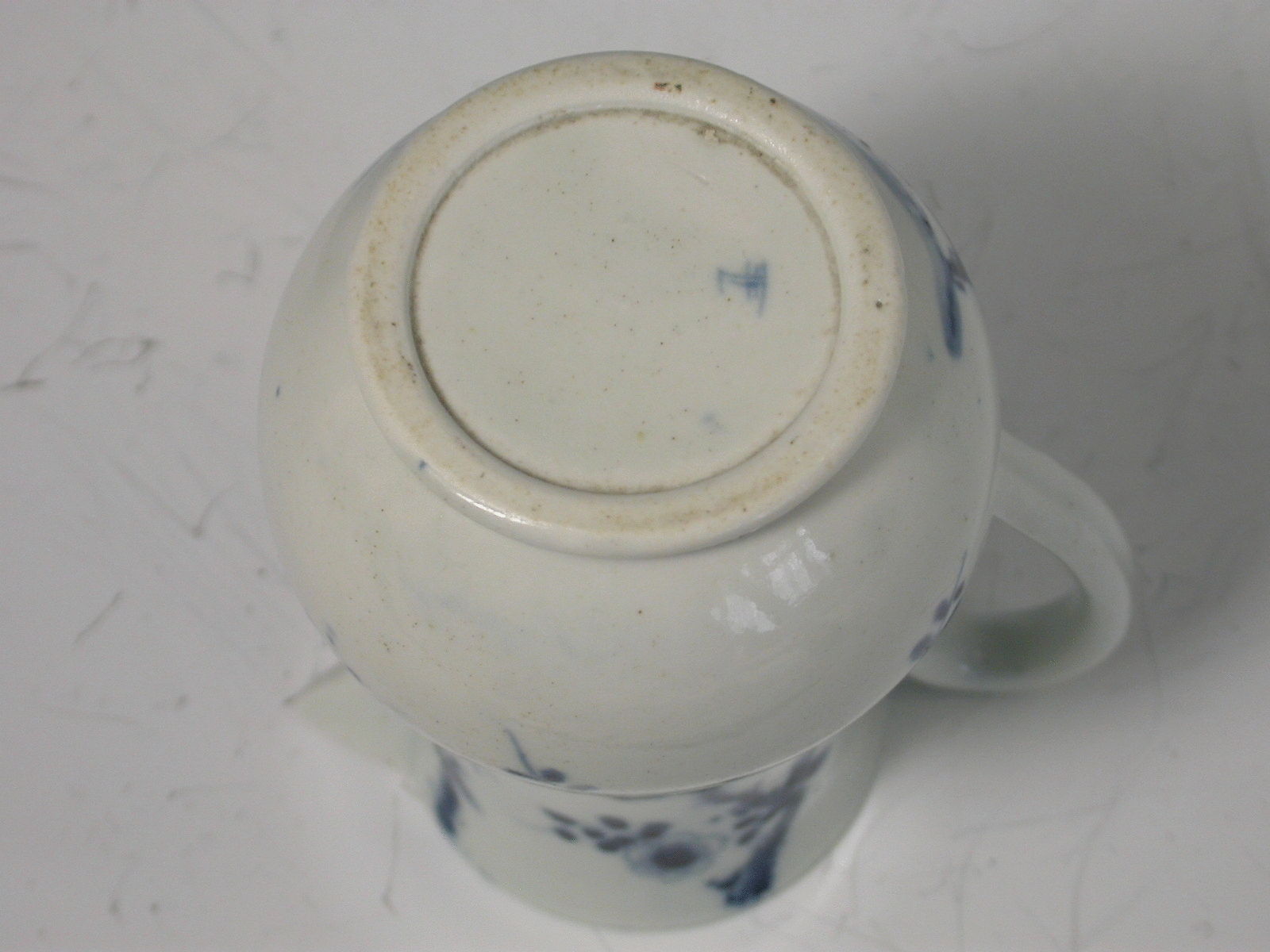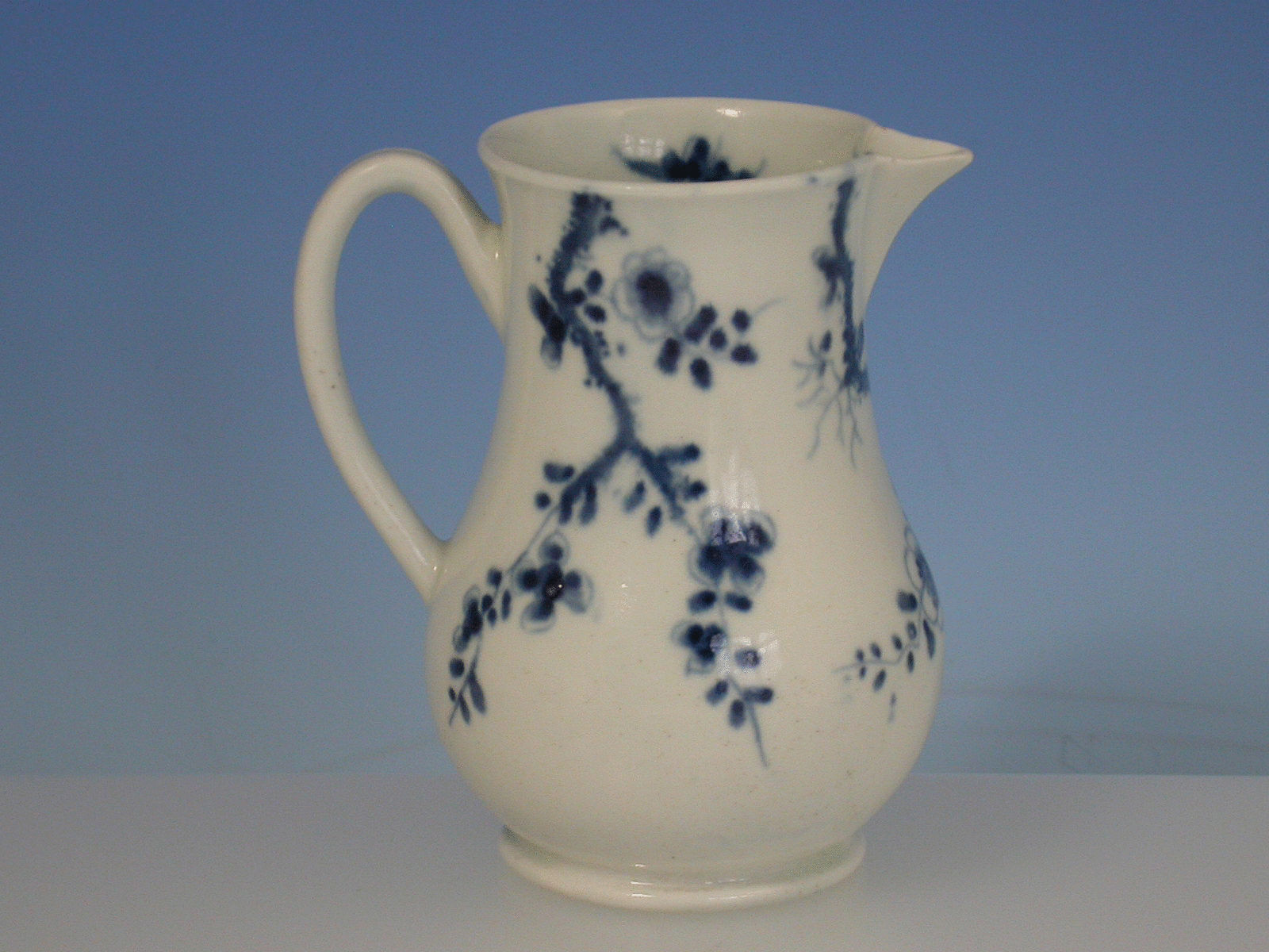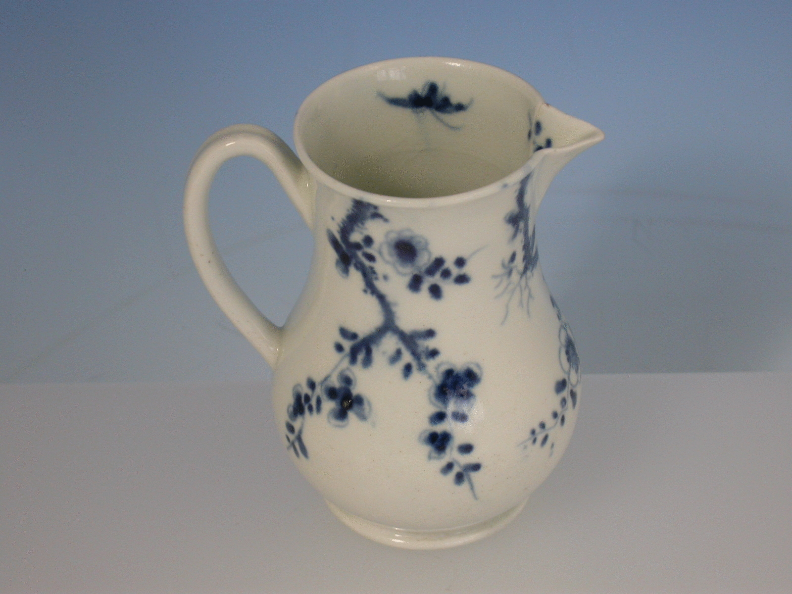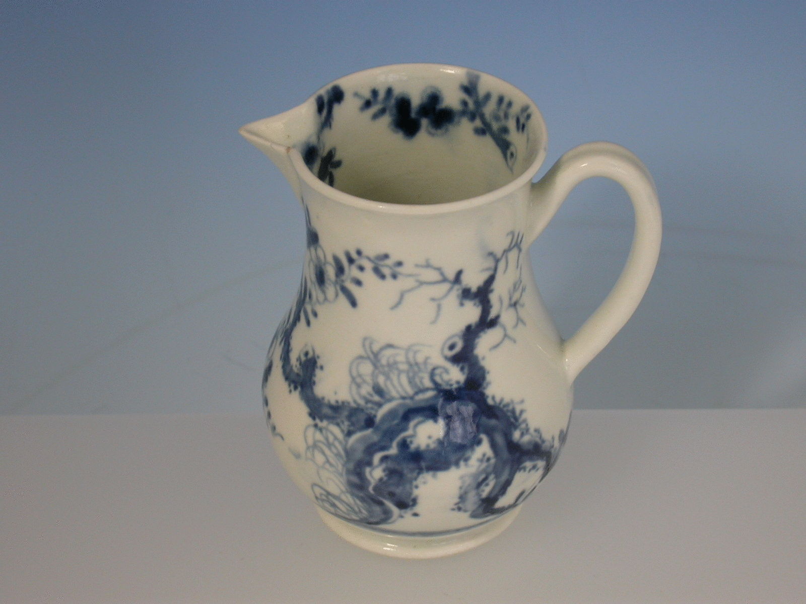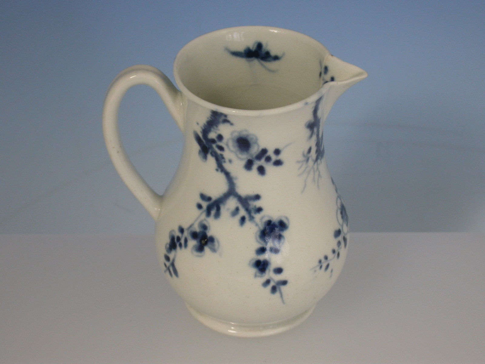 A fine early Worcester Sparrow Beak Jug of tall bulbous form with grooved strap handle and pedestal foot, painted in underglaze blue with the Prunus Root pattern.