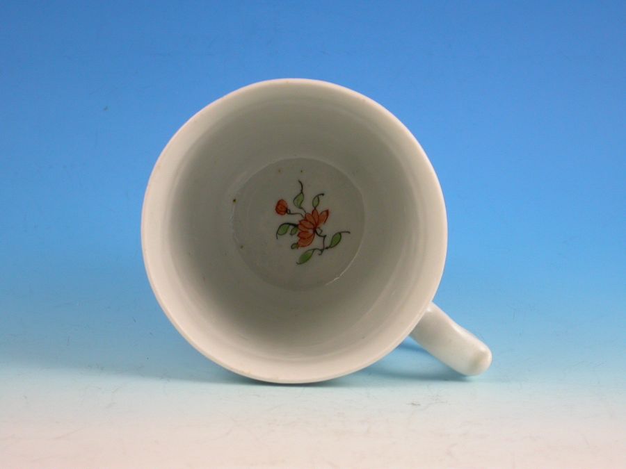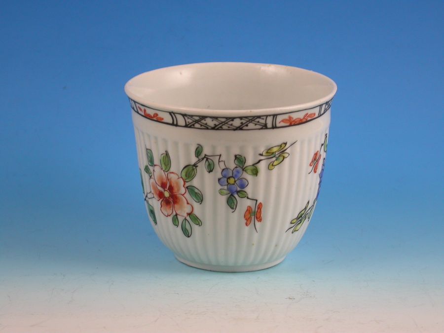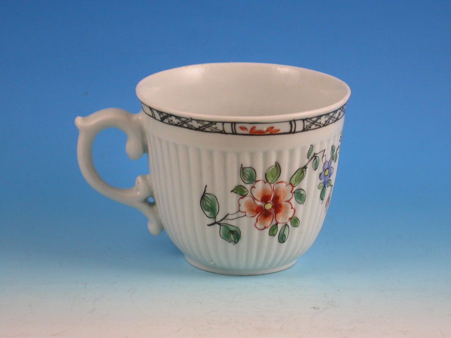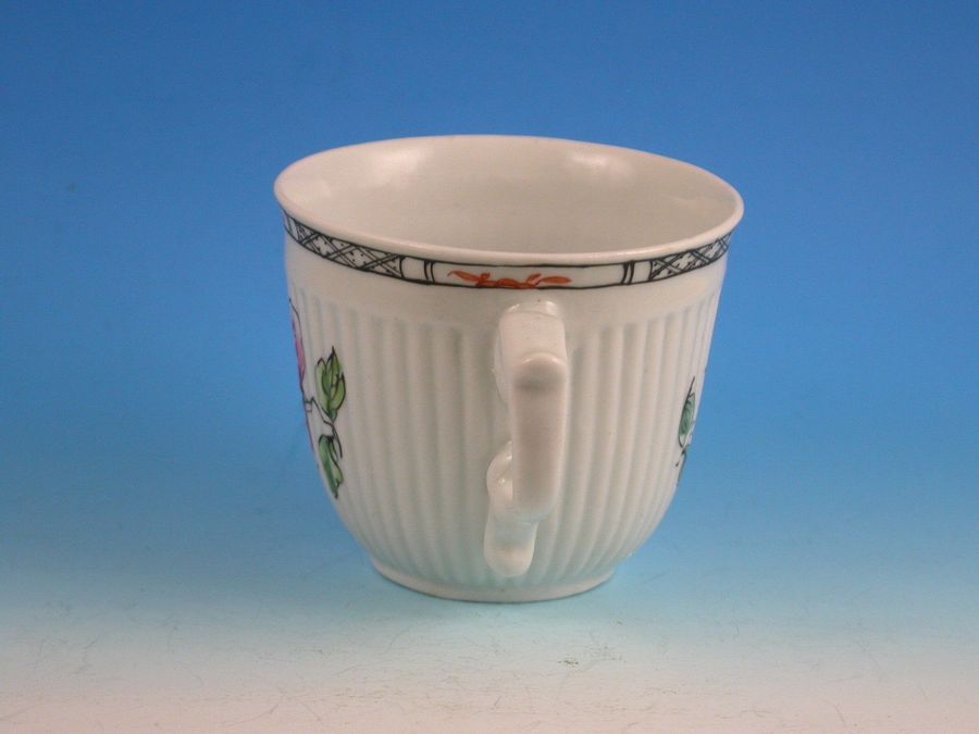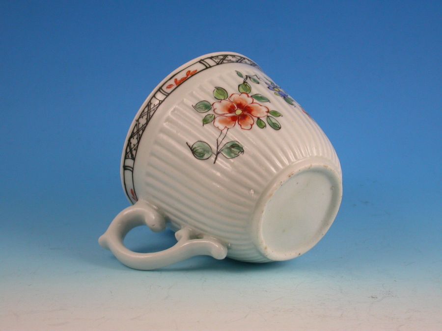 A fine early Worcester spiral moulded Coffee Cup of small size with scroll handle and thumb rest, painted in polychrome enamels in famille rose style with sprays of flowers within a panelled cross hatched and iron red border.