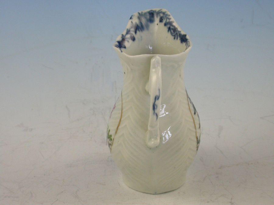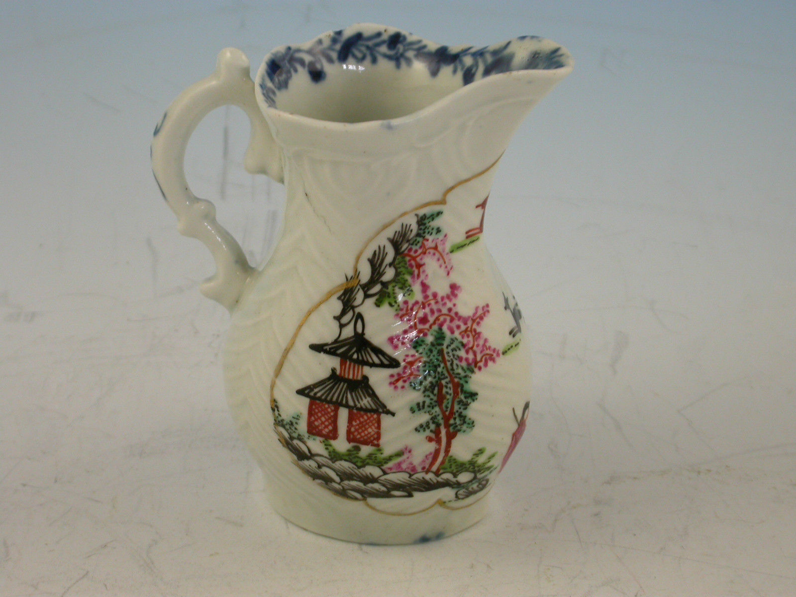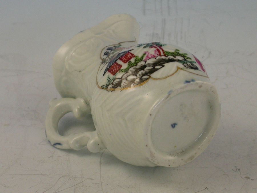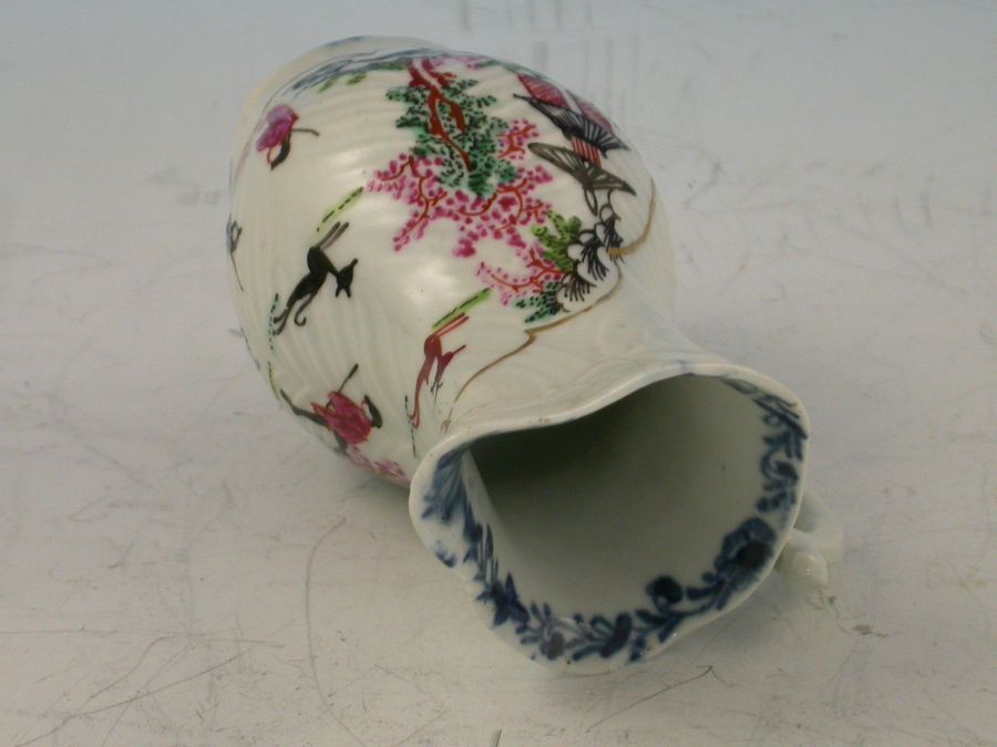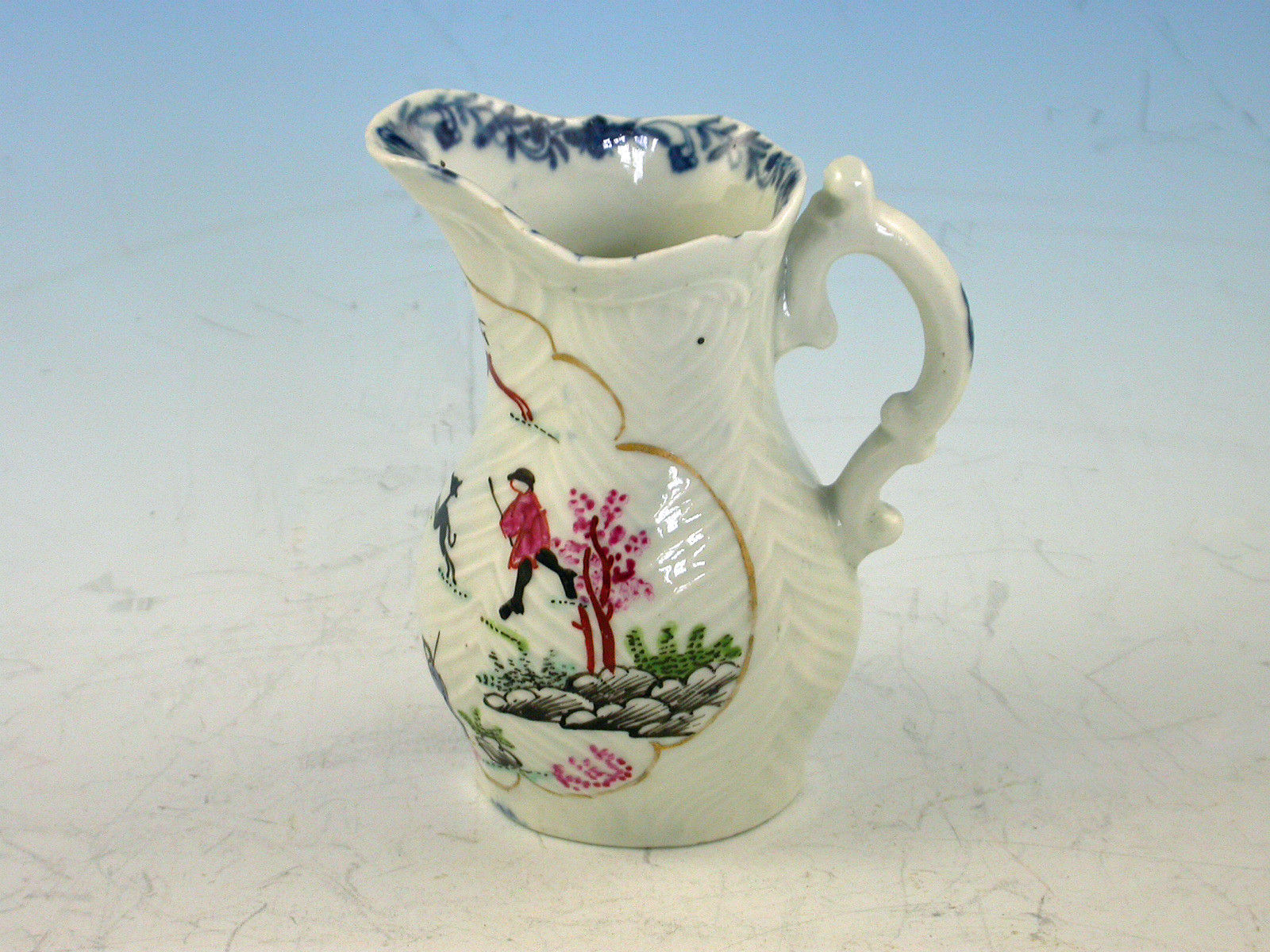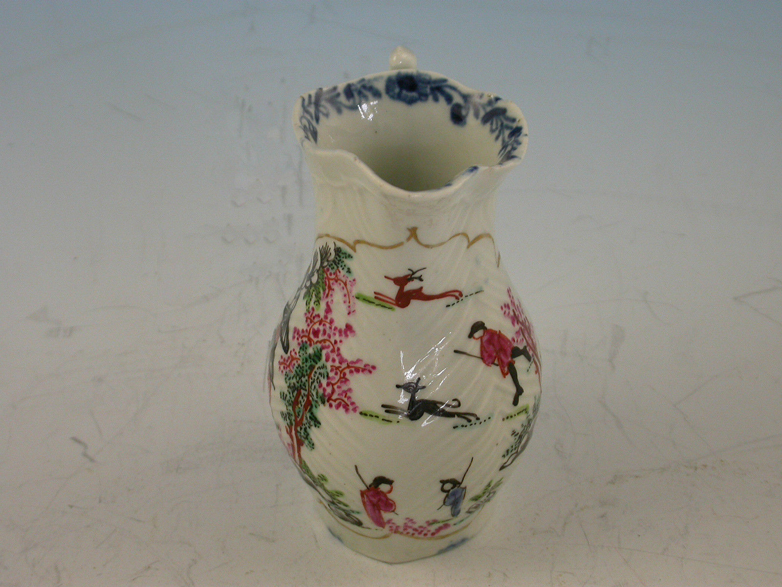 An early Worcester feather moulded Cream Jug, painted in polychrome enamels with a version of the so called ""Stag Hunt"" pattern, with under-glaze blue border to the interior rim.