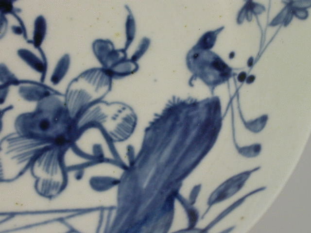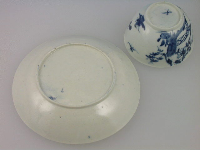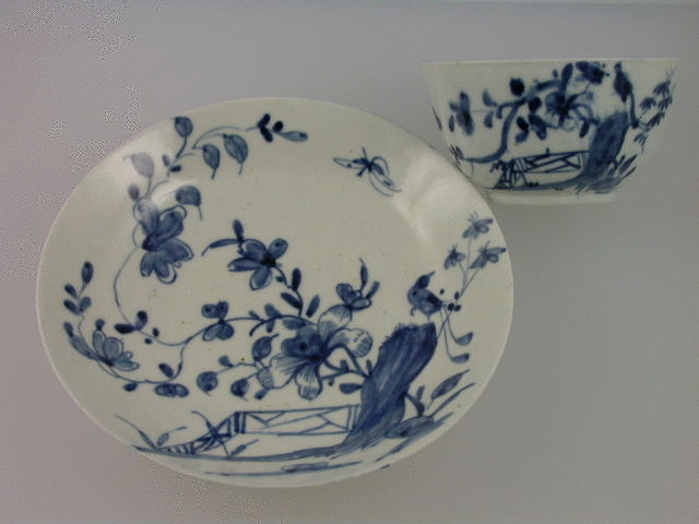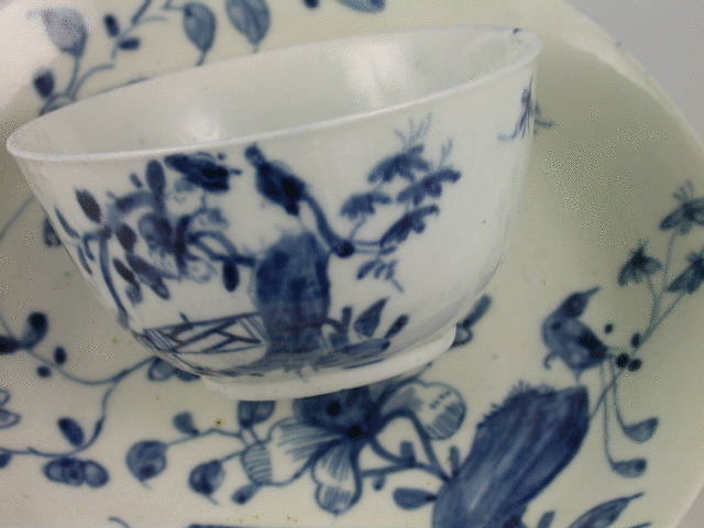 A fine and rare early Worcester Teabowl and Saucer, painted in pale blue with the Rock Warbler pattern.