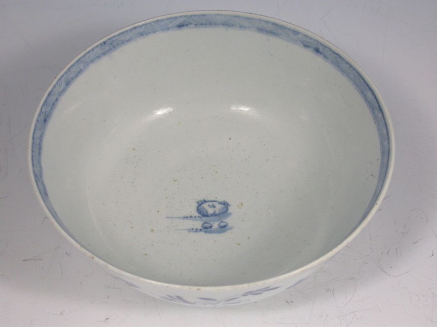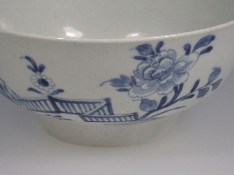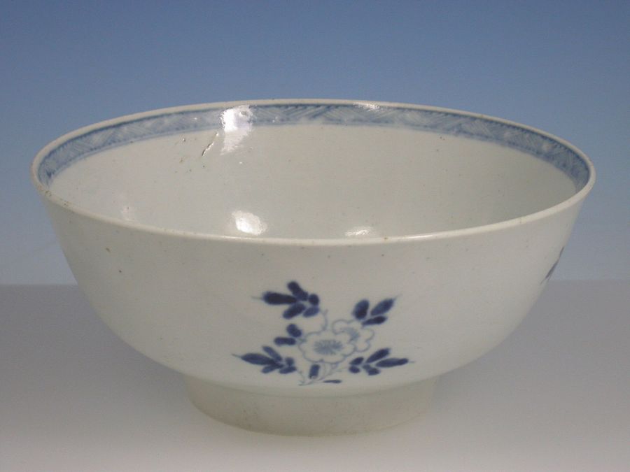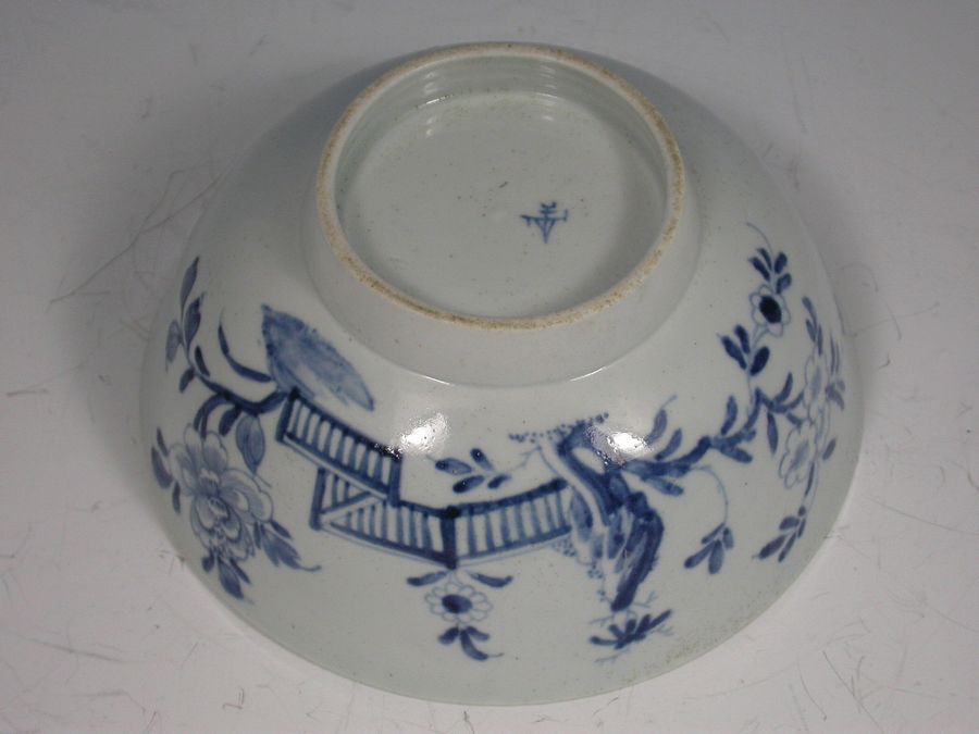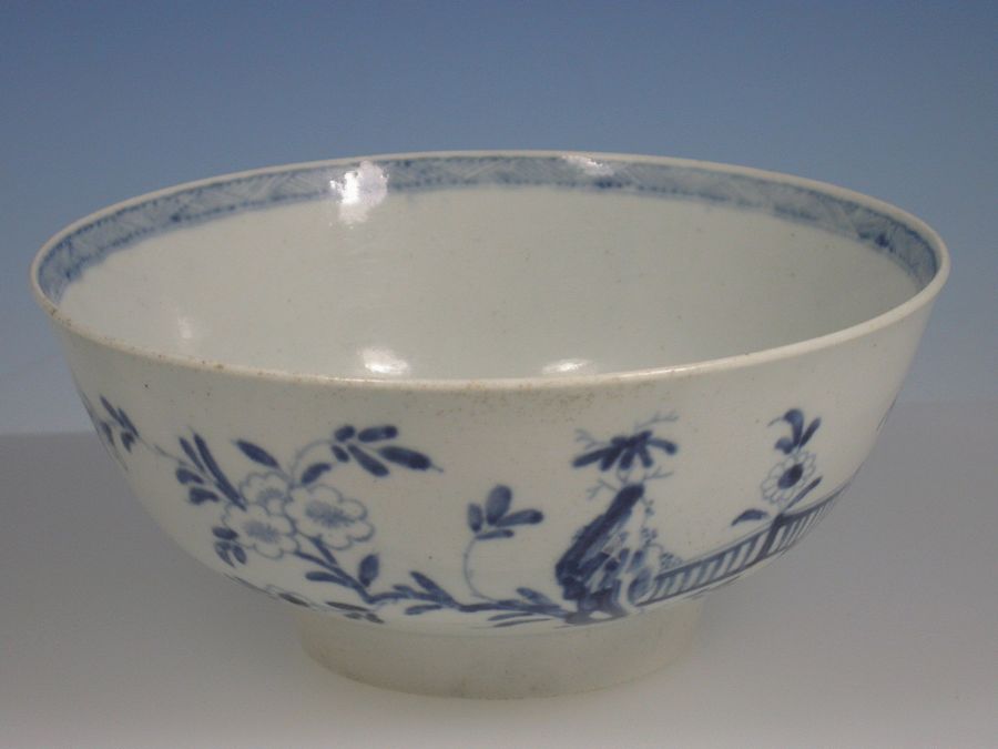 A good early Worcester Waste Bowl with deep foot rim and slightly everted rim, painted in under-glaze blue with the zig-zag fence pattern. (BFS I.D.12).