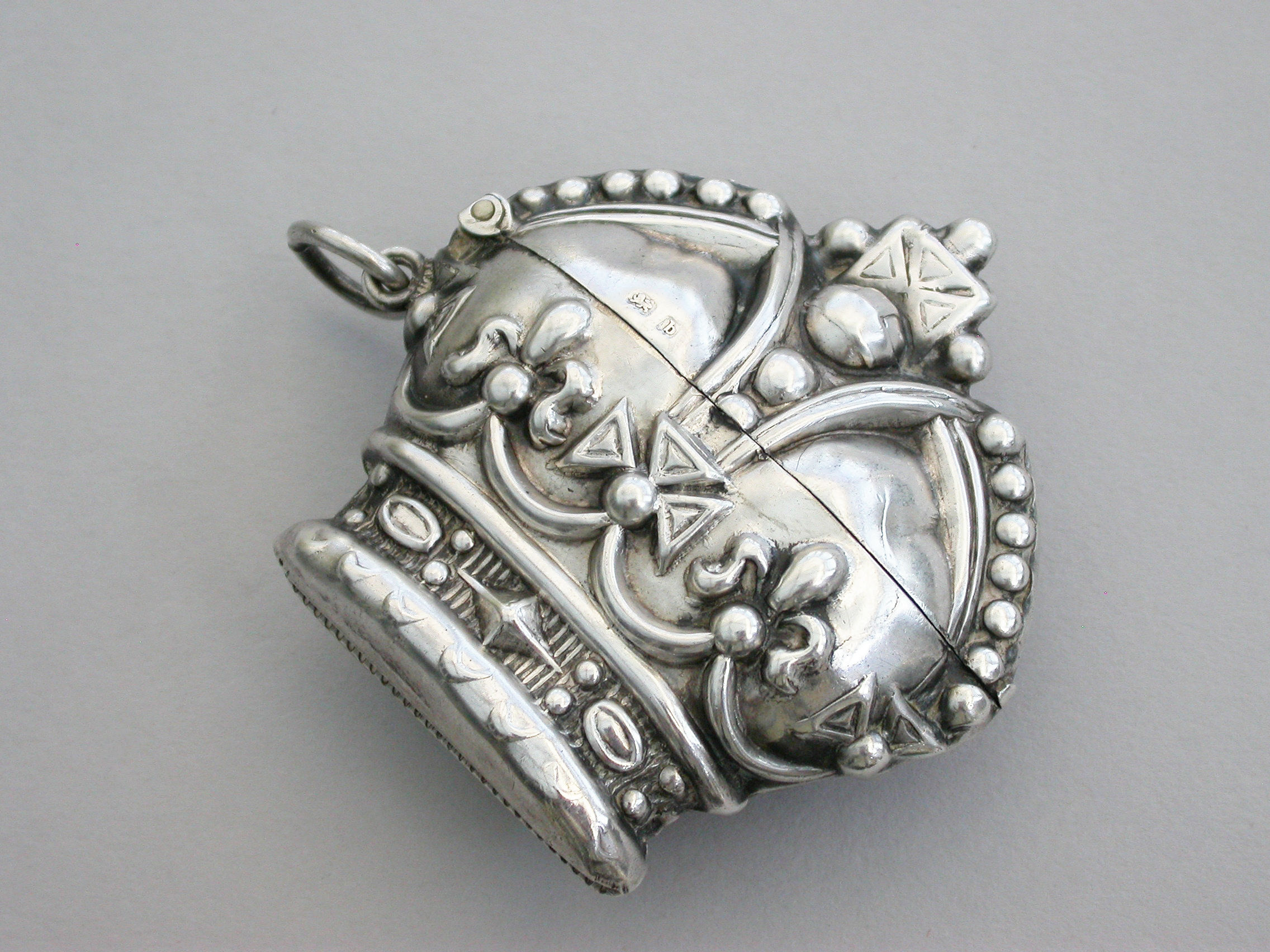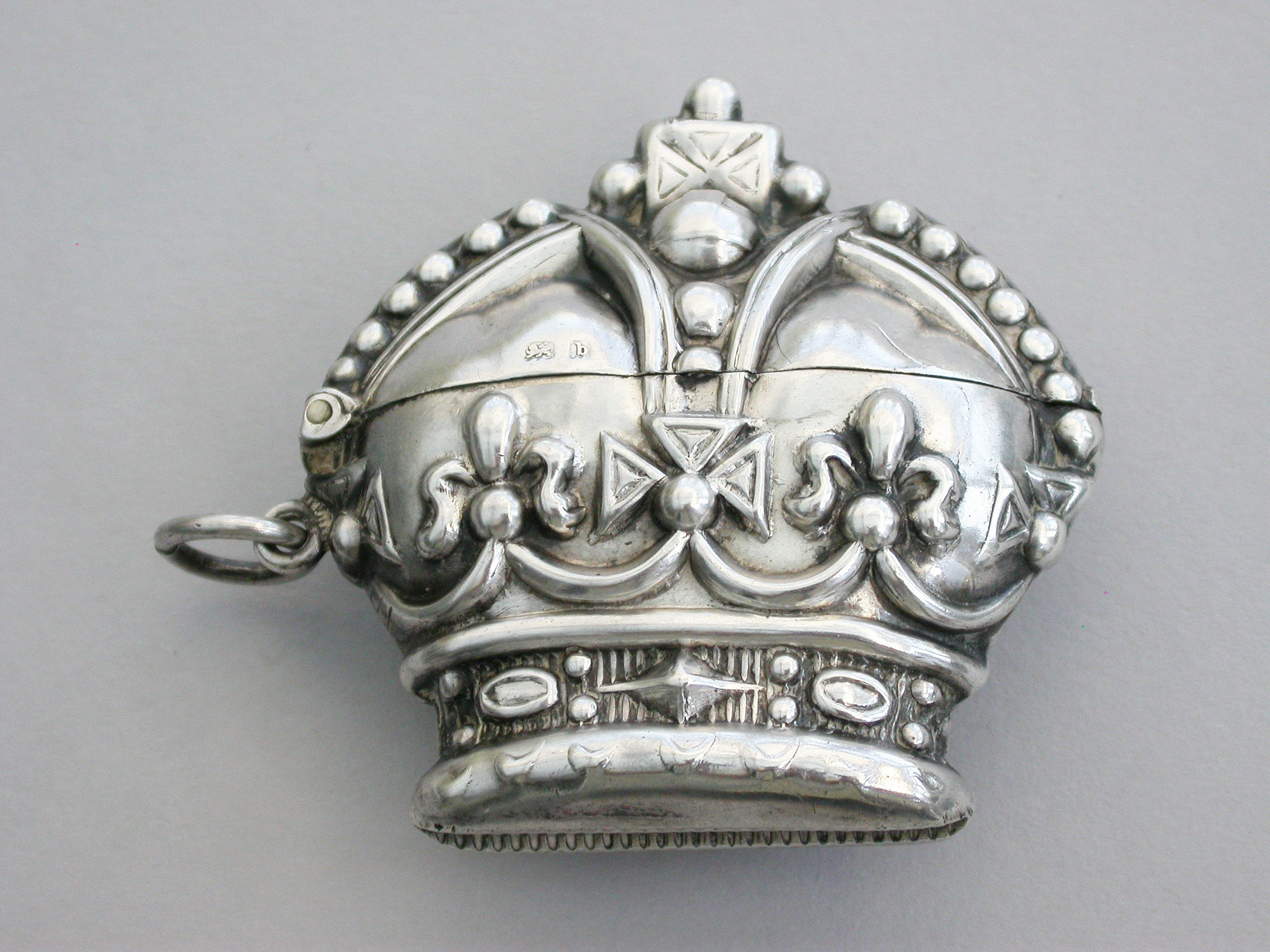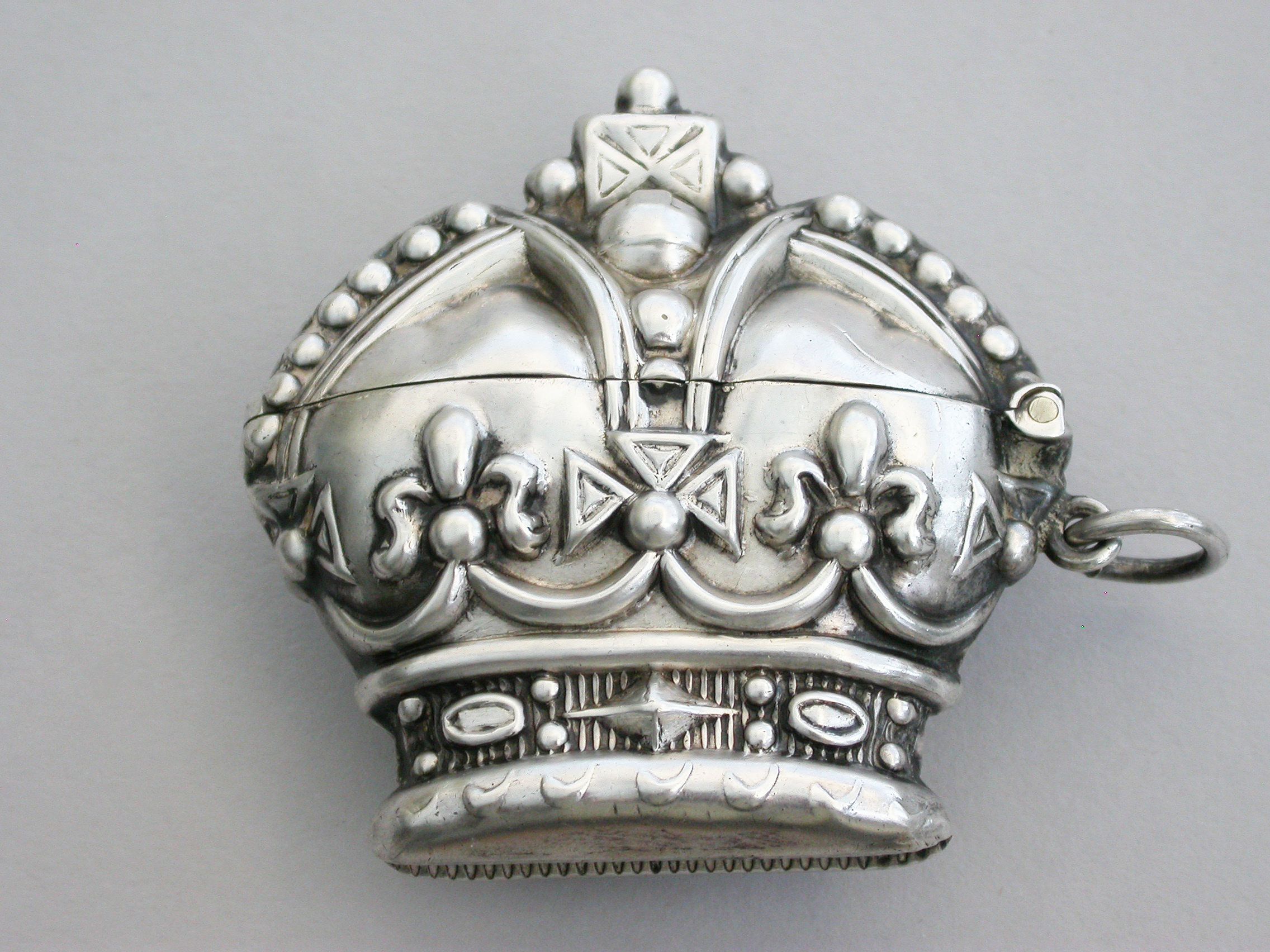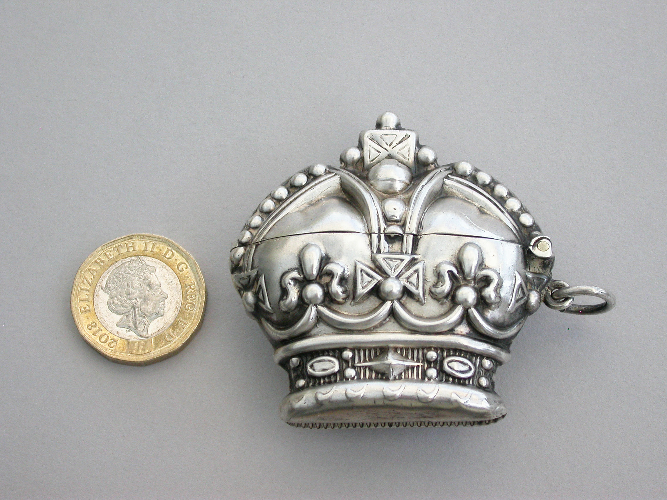 A rare early Edwardian novelty silver Vesta Case made in the form of 'St Edwards Crown' to commemorate the Coronation of Edward VII in 1901, with sprung hinged lid and attached suspension ring.