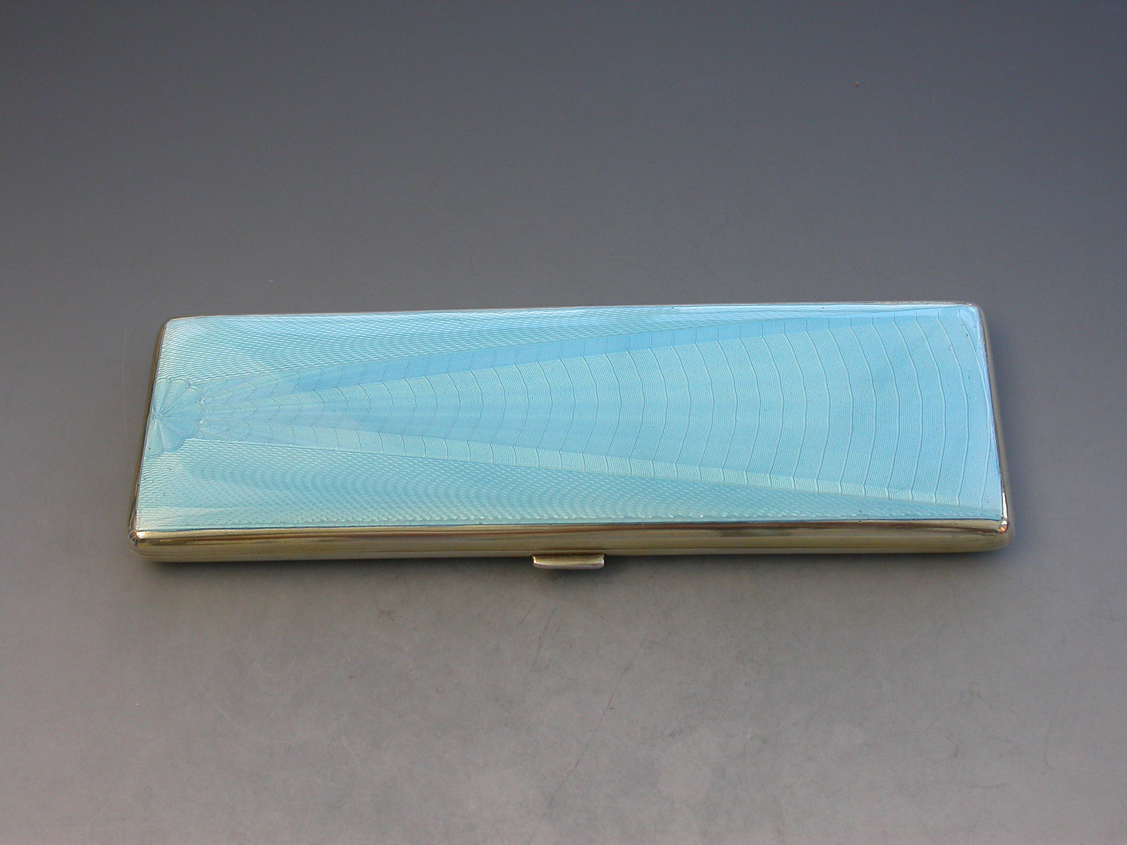 A good quality Edward VIII sky blue guilloche enamel and silver long Cigarette Case with engine turned base and silver gilt interior. Engraved with a presentation inscription.