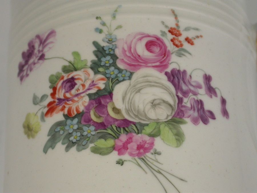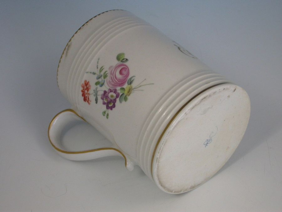 A very good Derby Mug of tapering cylindrical form, painted in various bright enamel colours with floral bouquets, probably by Edward Withers. Monogrammed 'IB' in gilt script.