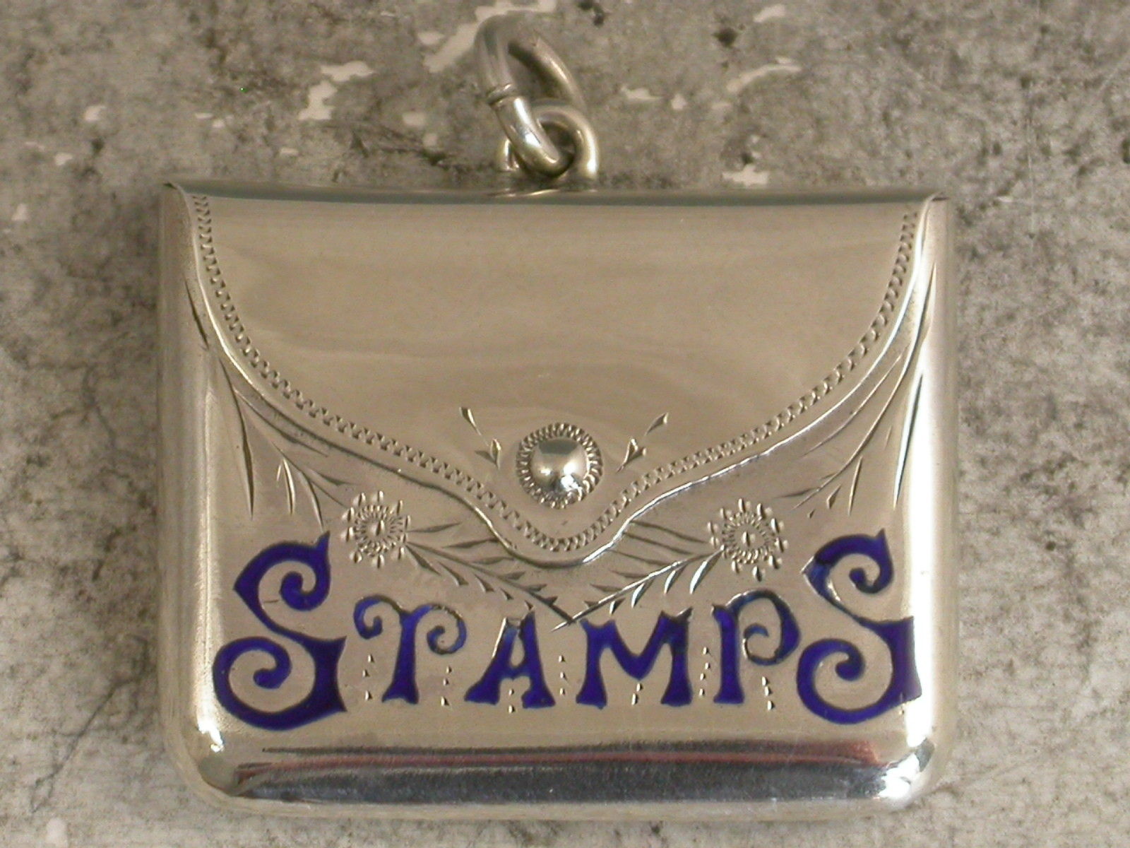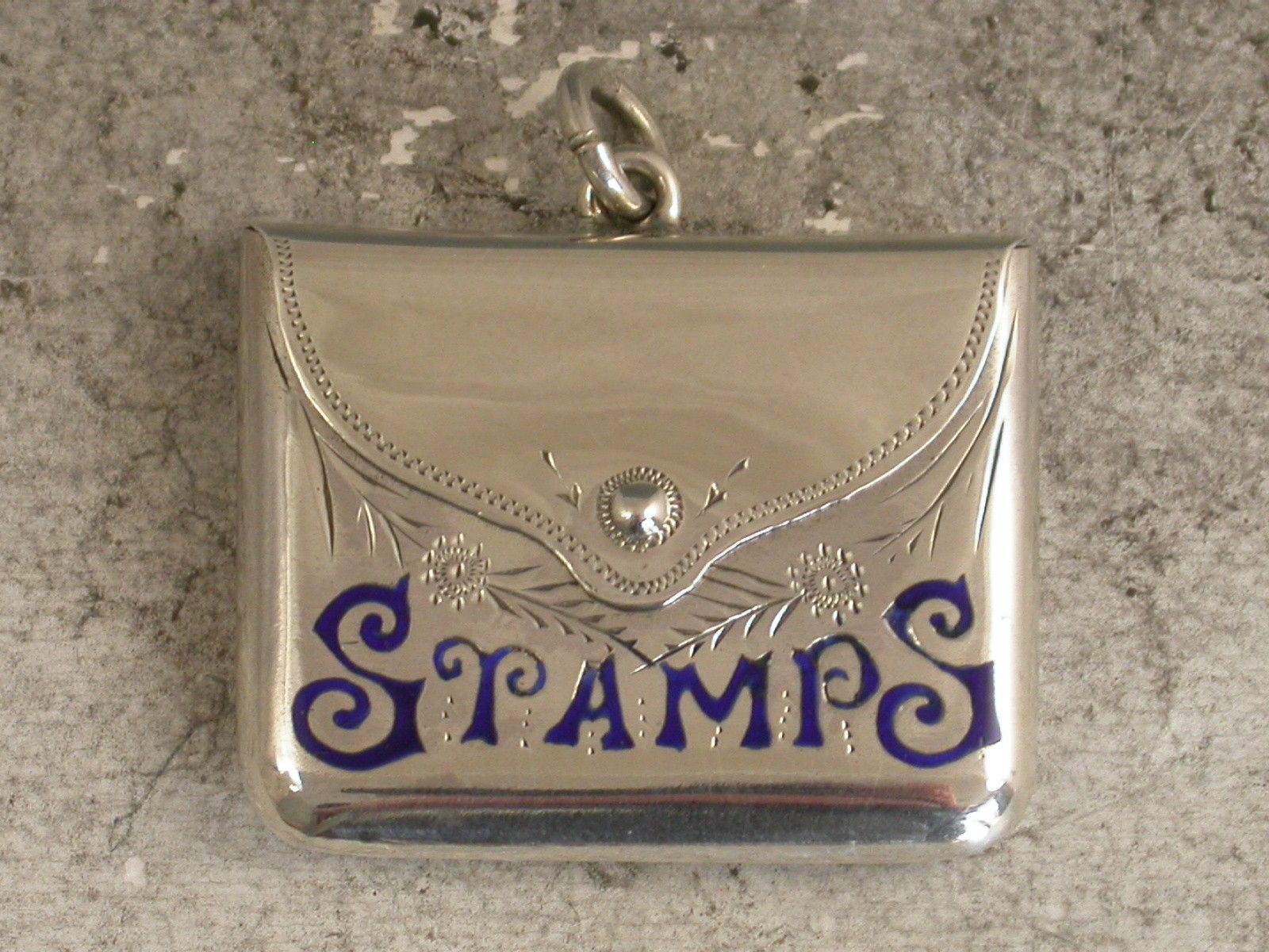 A good Edwardian silver Stamp Case of envelope form with hinged lid and attached suspension ring, the body with engraved foliate decoration and the word 'Stamps' highlighted in dark blue enamel.