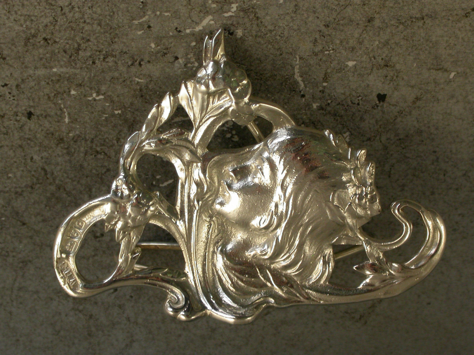 An Edwardian cast silver Menu Holder of Art Nouveau design depicting a child's head amongst scrolling flowers and foliage, with wire-work support and base.