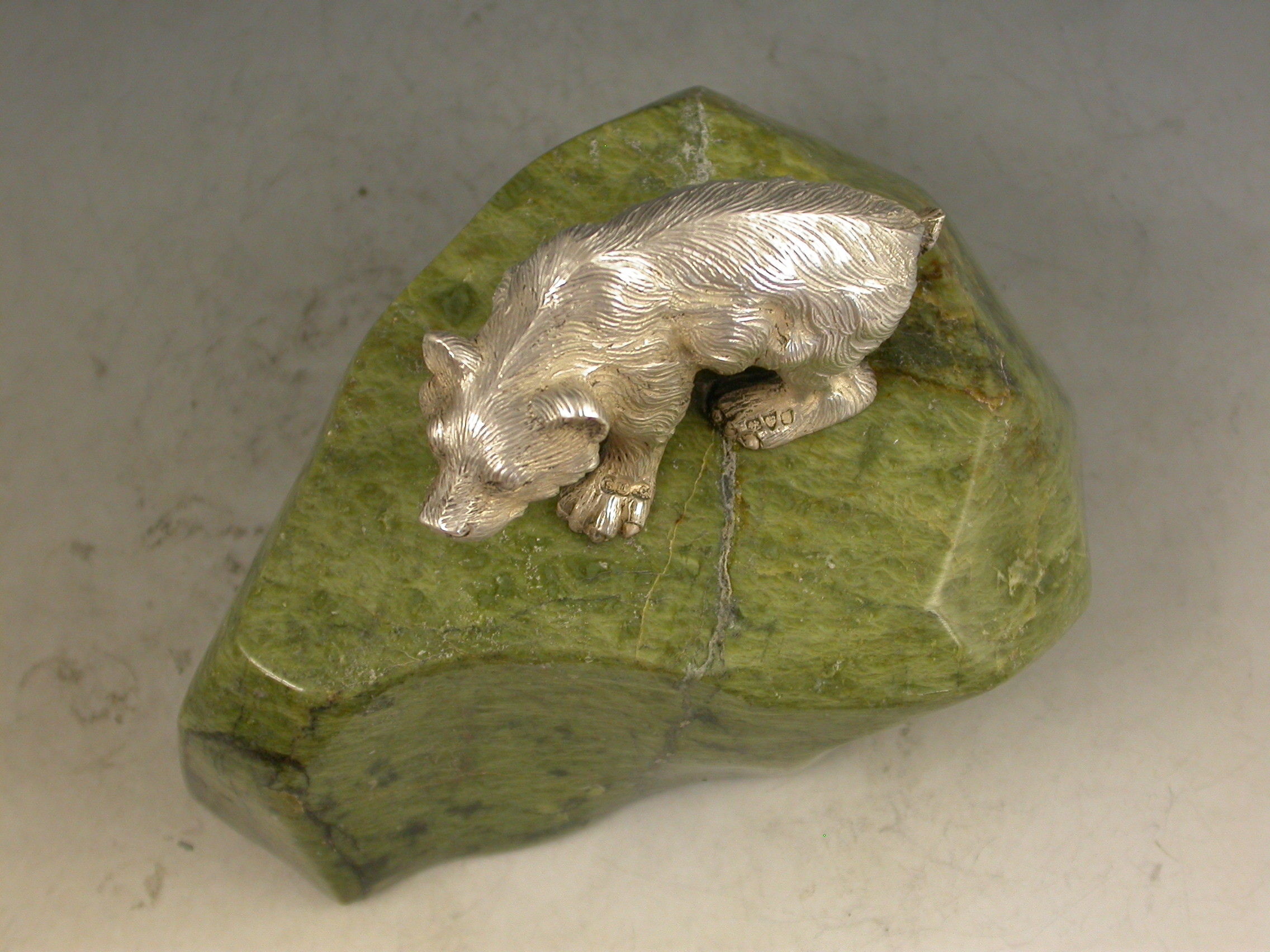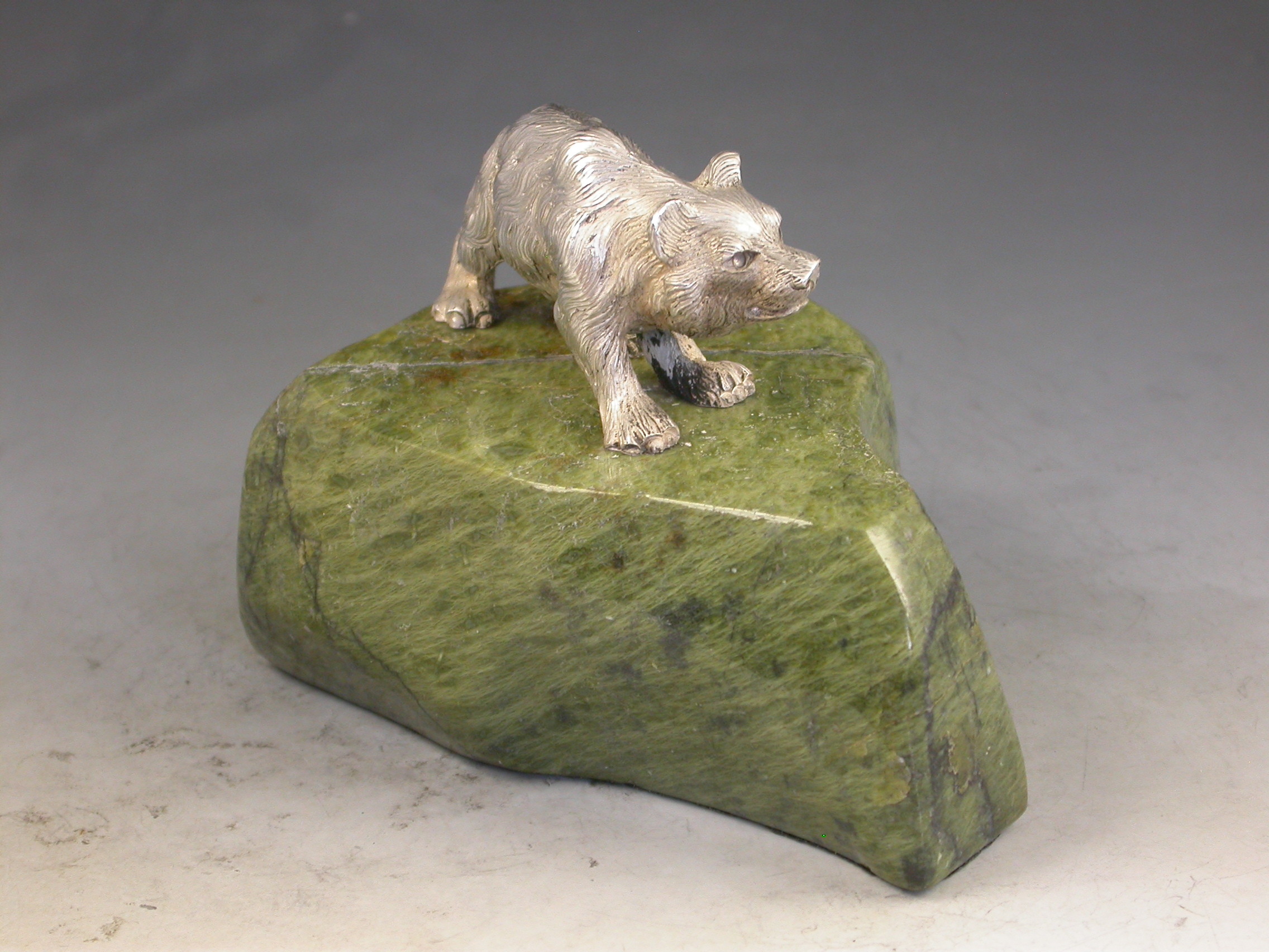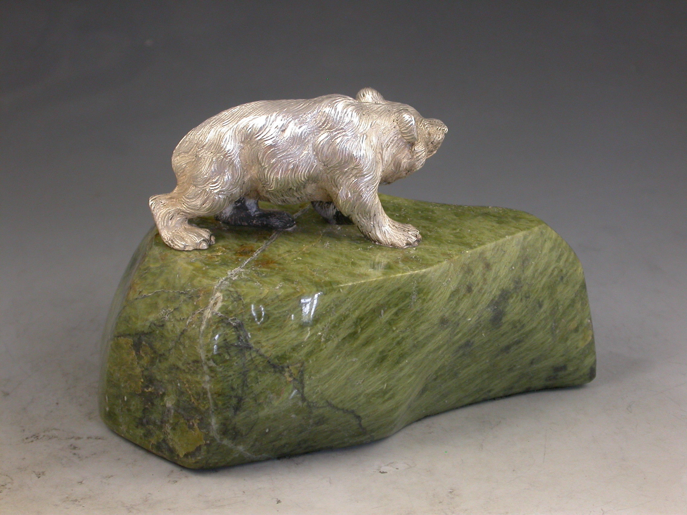 A very fine quality Edwardian cast silver model of a prowling Bear standing on a shaped green Connemara marble base.