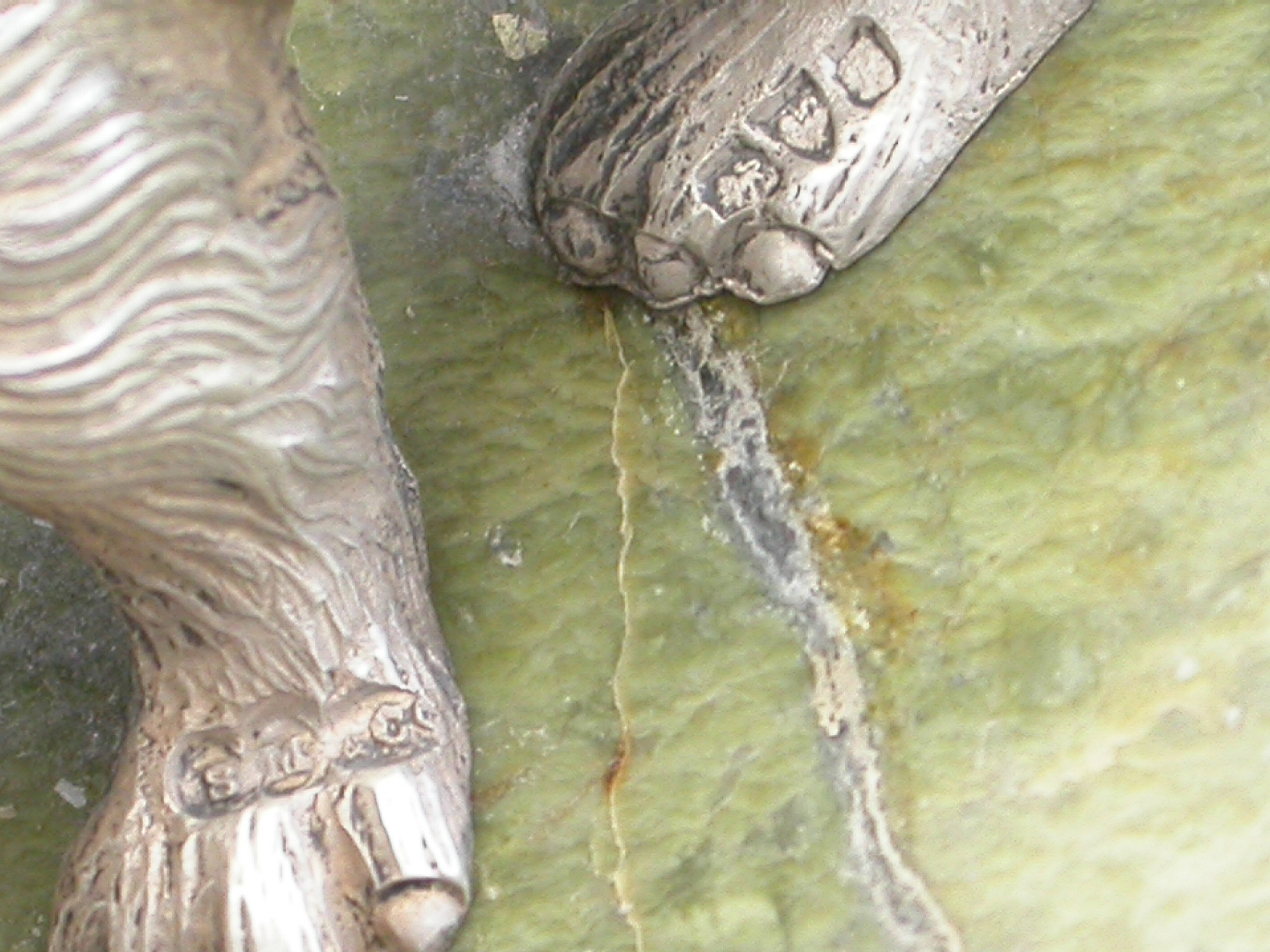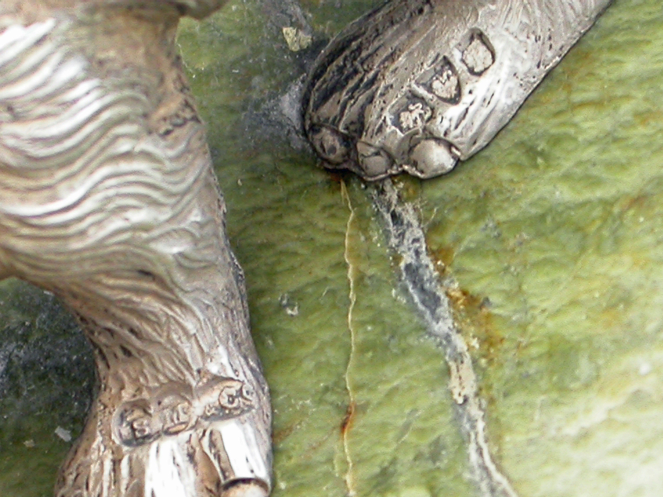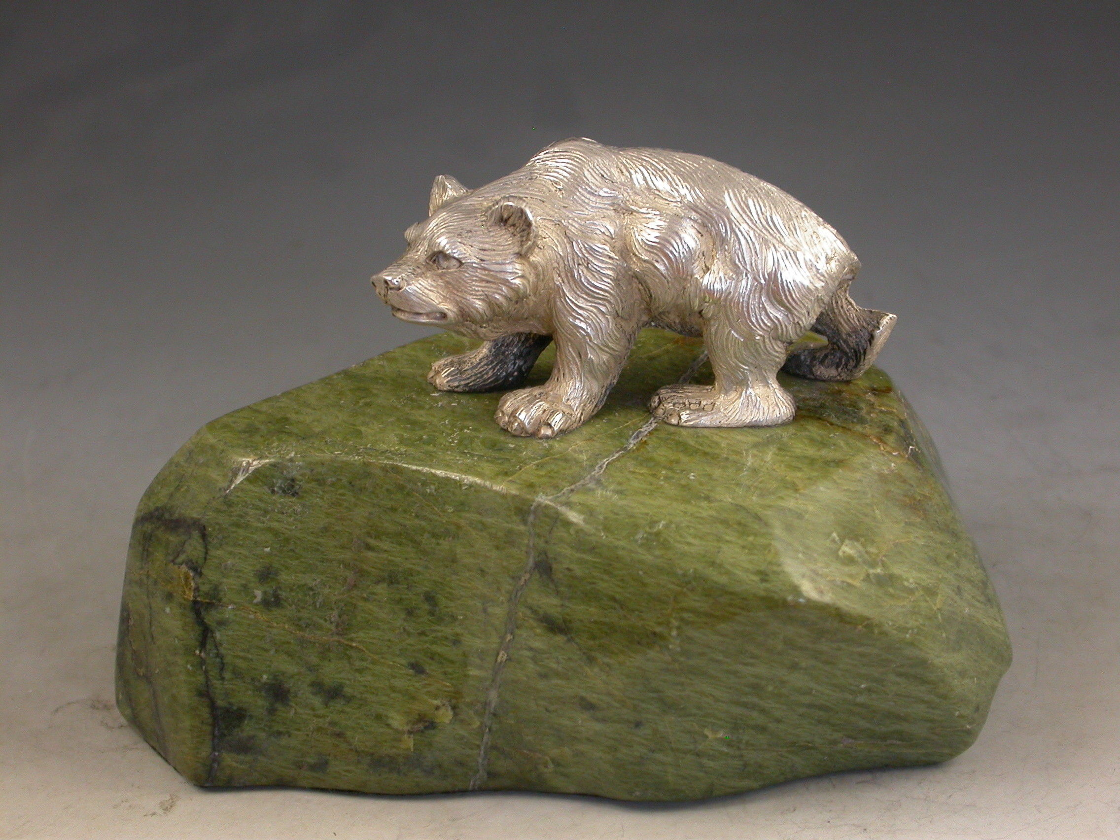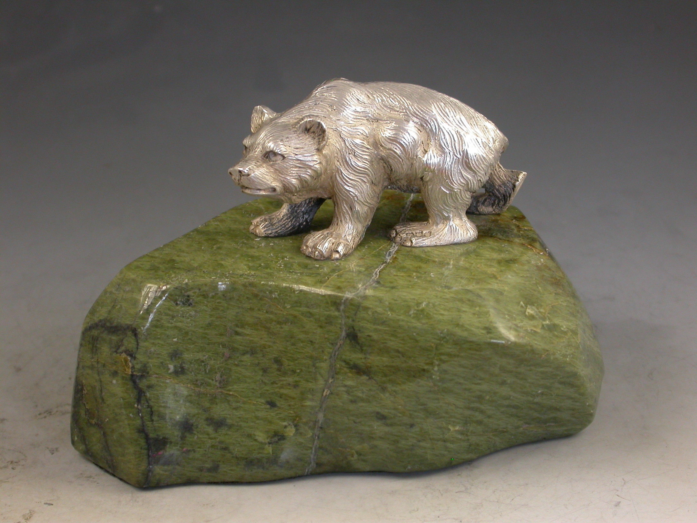 A very fine quality Edwardian cast silver model of a prowling Bear standing on a shaped green Connemara marble base.