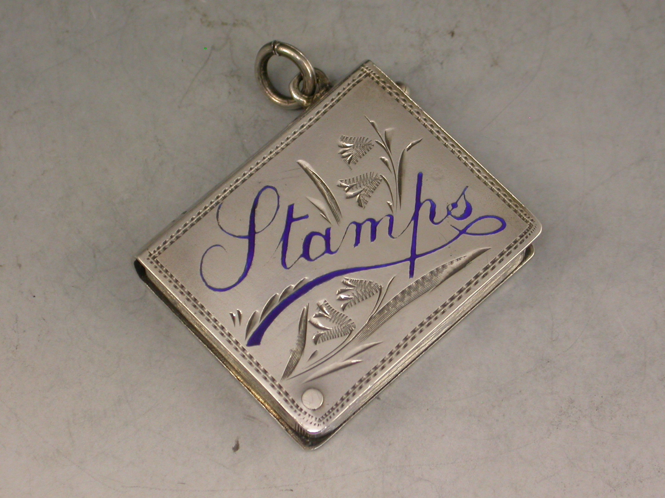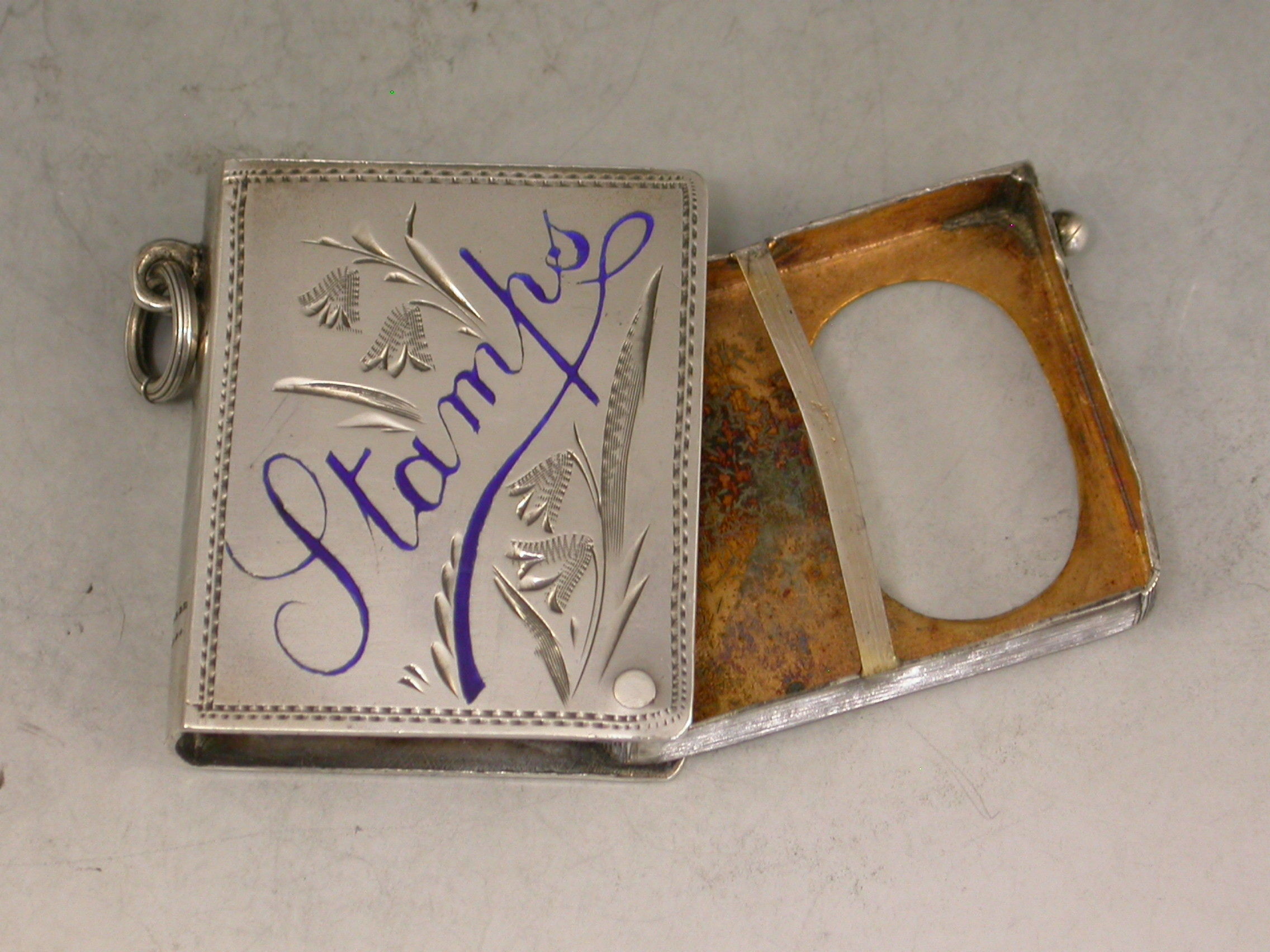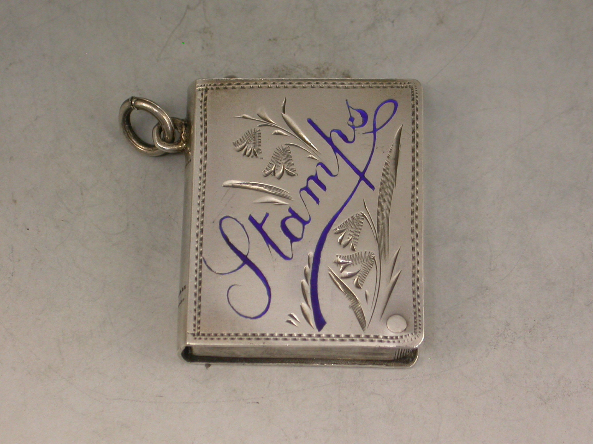 A good George V silver Stamp Case made in the form of a book, the silver gilt interior compartment swiveling open on a retaining pin to one corner, the cover with foliate engraved decoration and the word 'Stamps' highlighted in blue enamel, attached suspension ring.