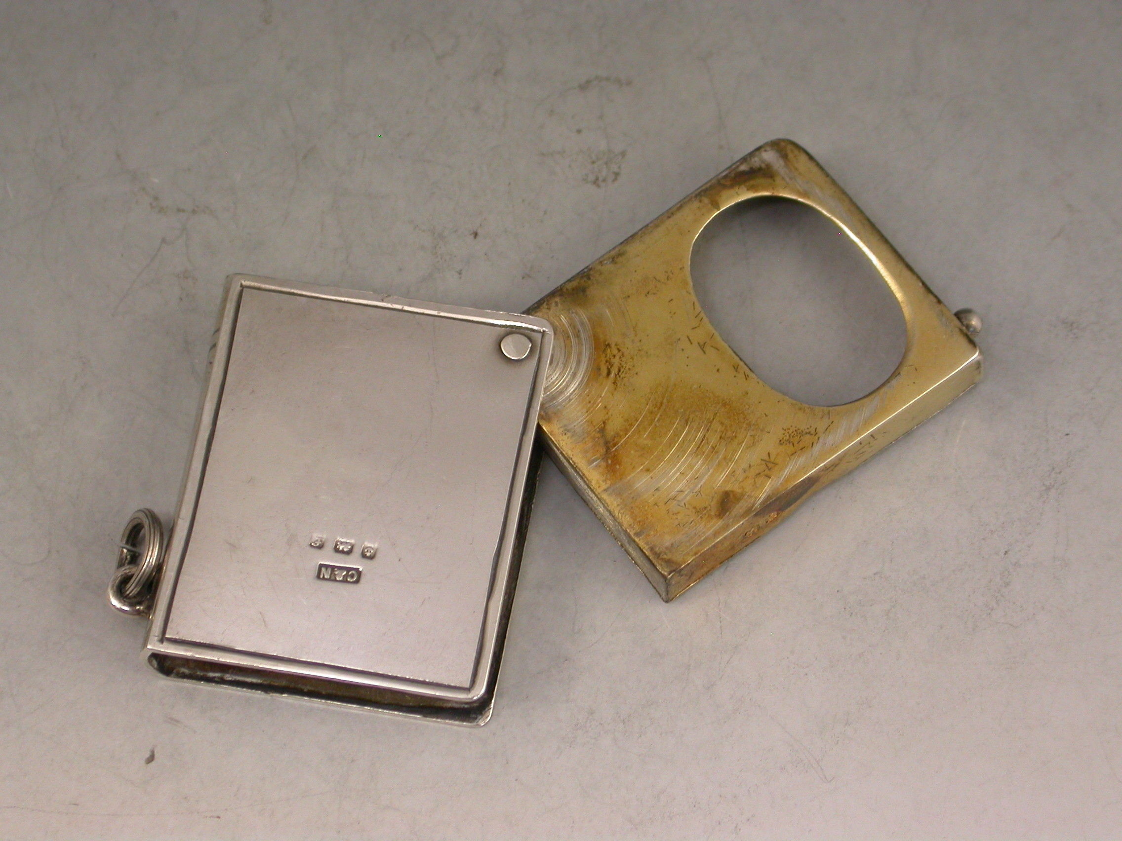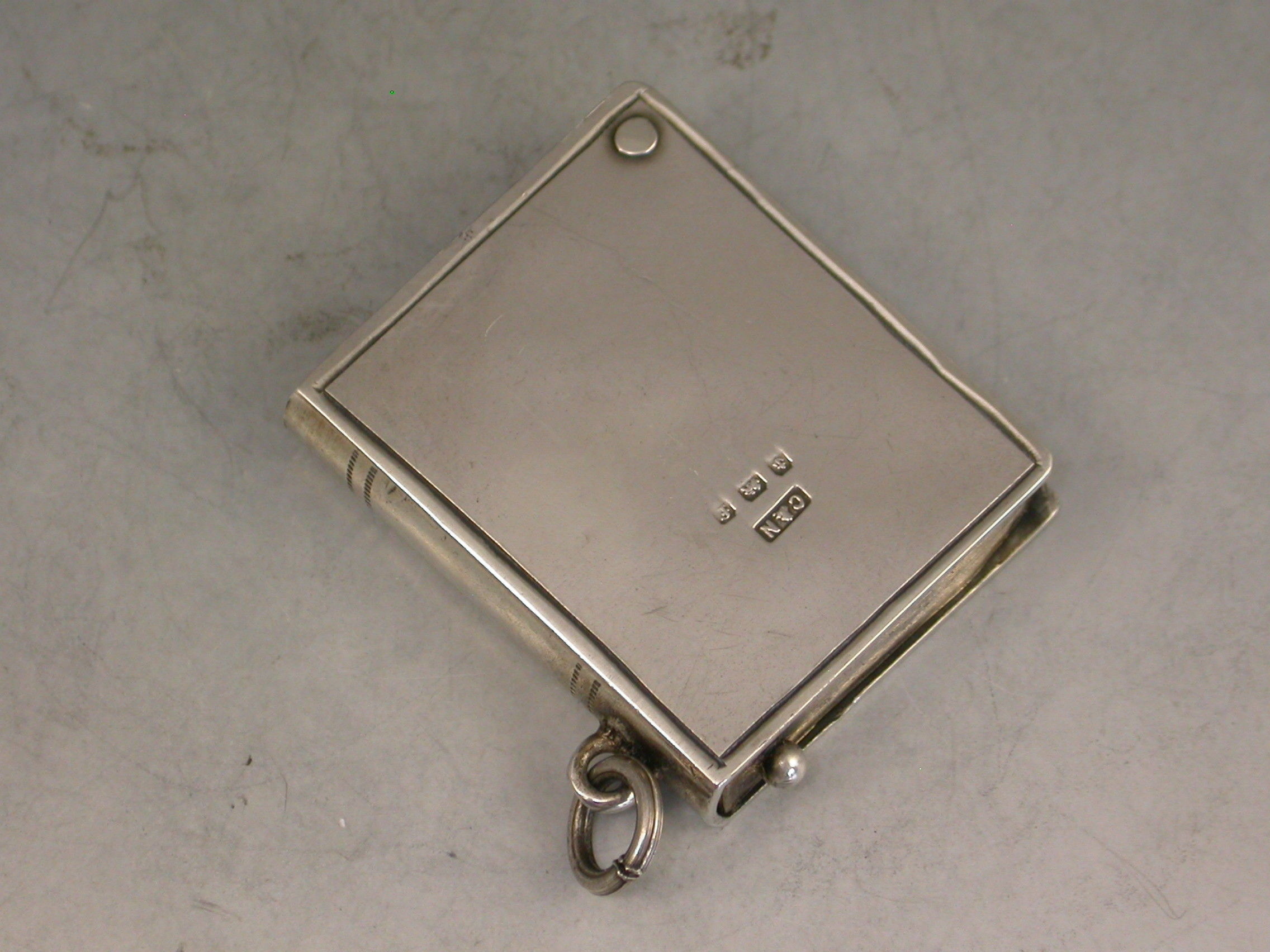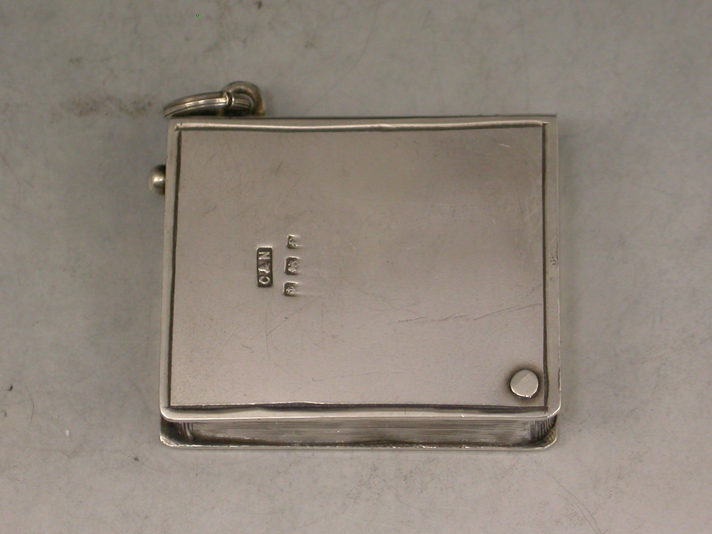 A good George V silver Stamp Case made in the form of a book, the silver gilt interior compartment swiveling open on a retaining pin to one corner, the cover with foliate engraved decoration and the word 'Stamps' highlighted in blue enamel, attached suspension ring.