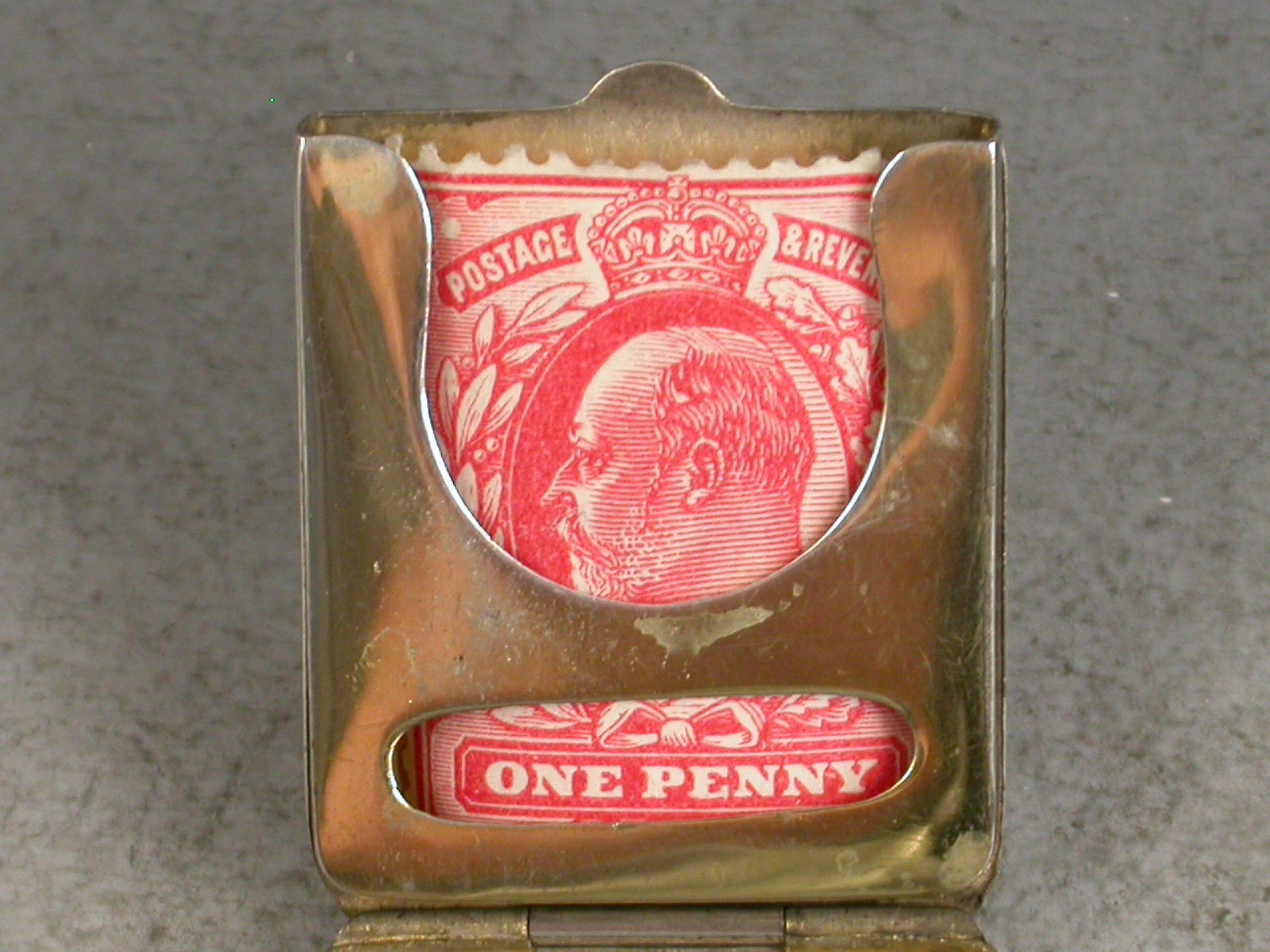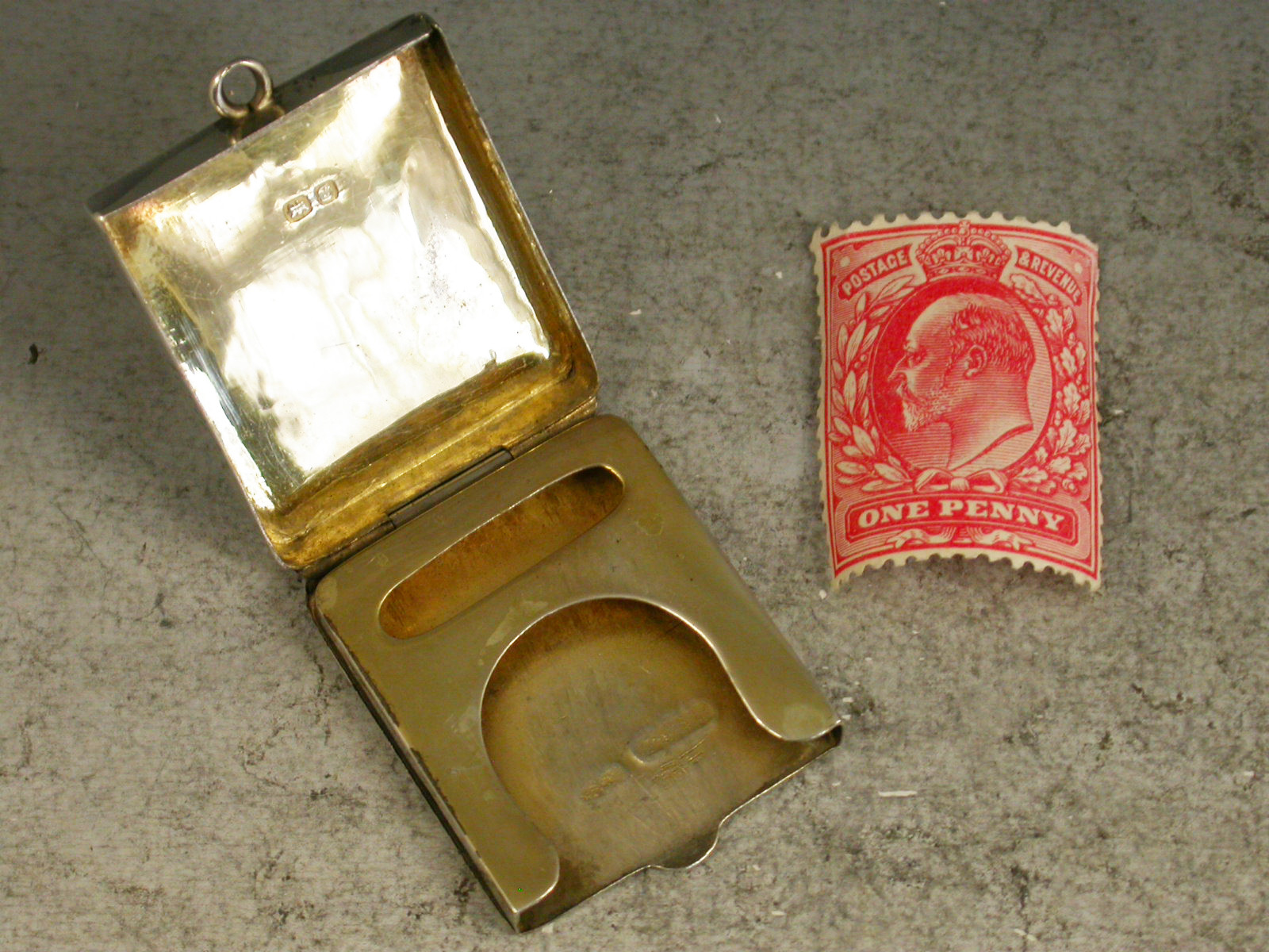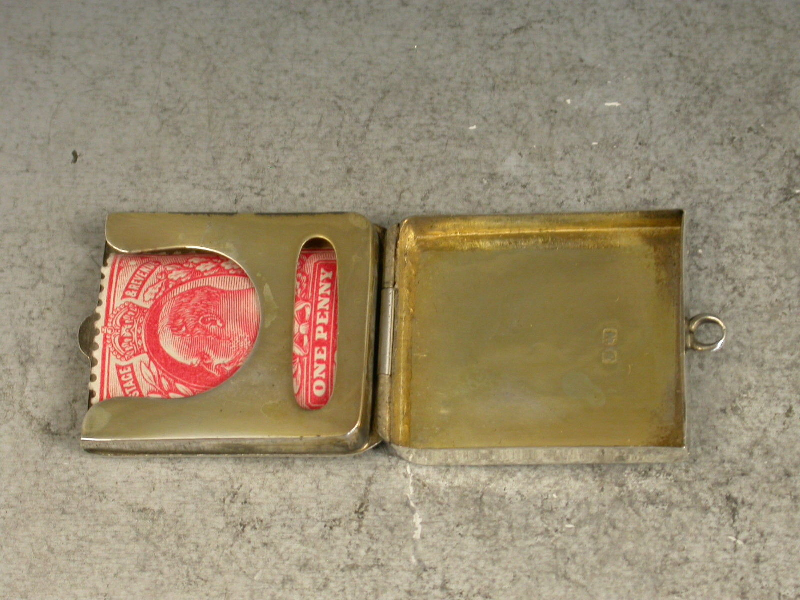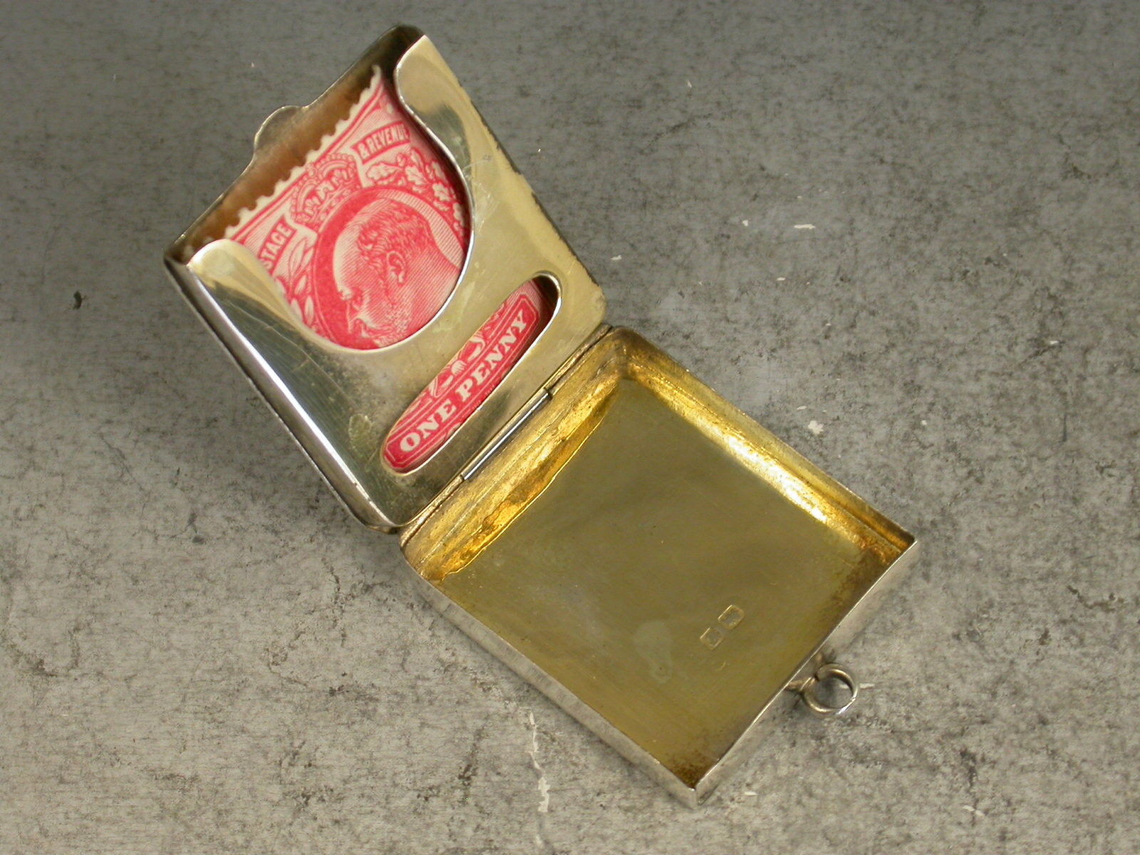 A good Edwardian silver Stamp Case of hinged rectangular form with attached eyelet and silver gilt interior, the case engraved with foliate scroll decorations and the owners initials 'HW' on one side.