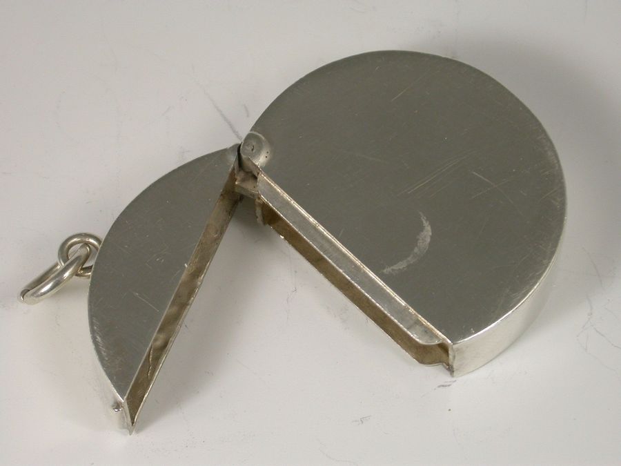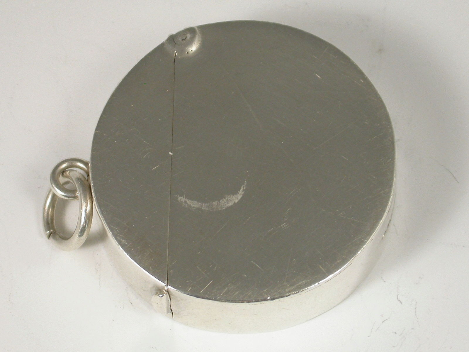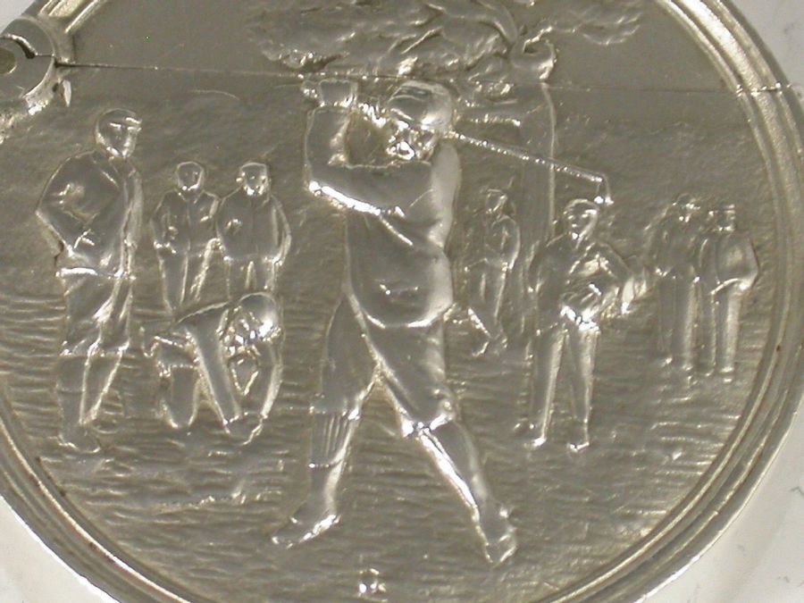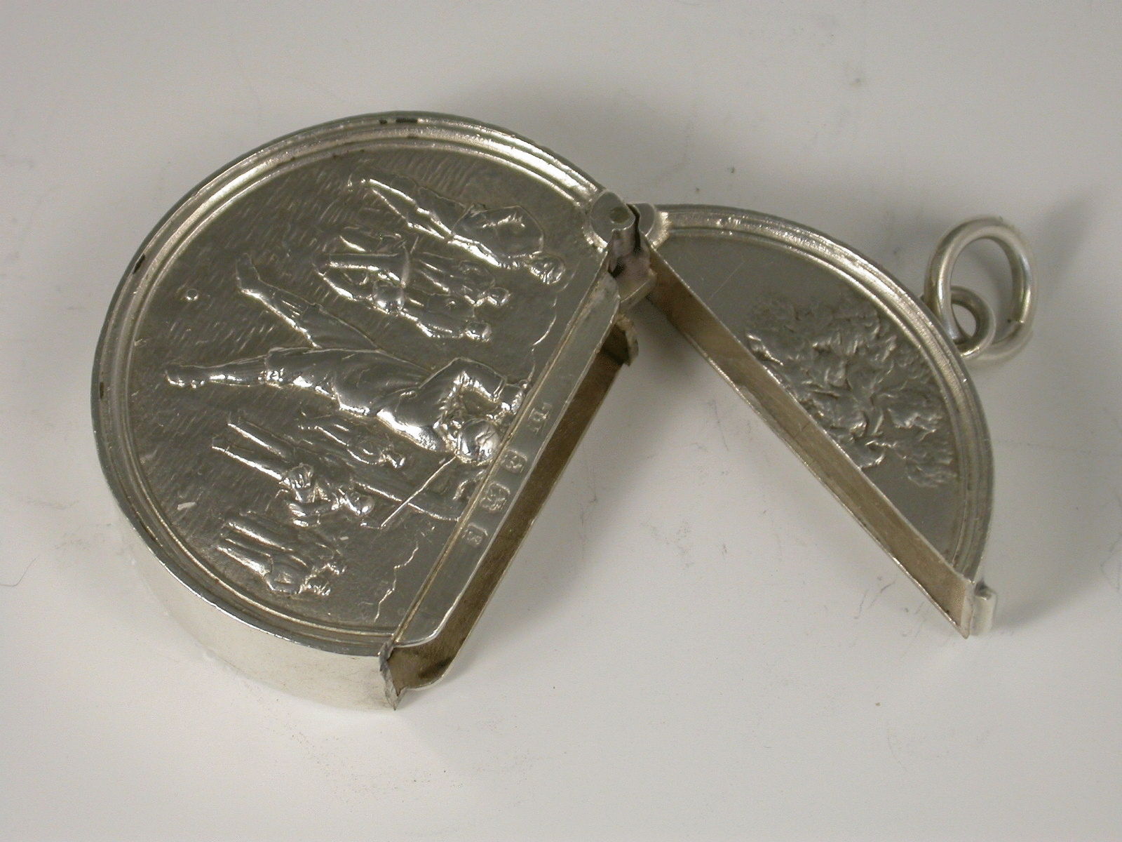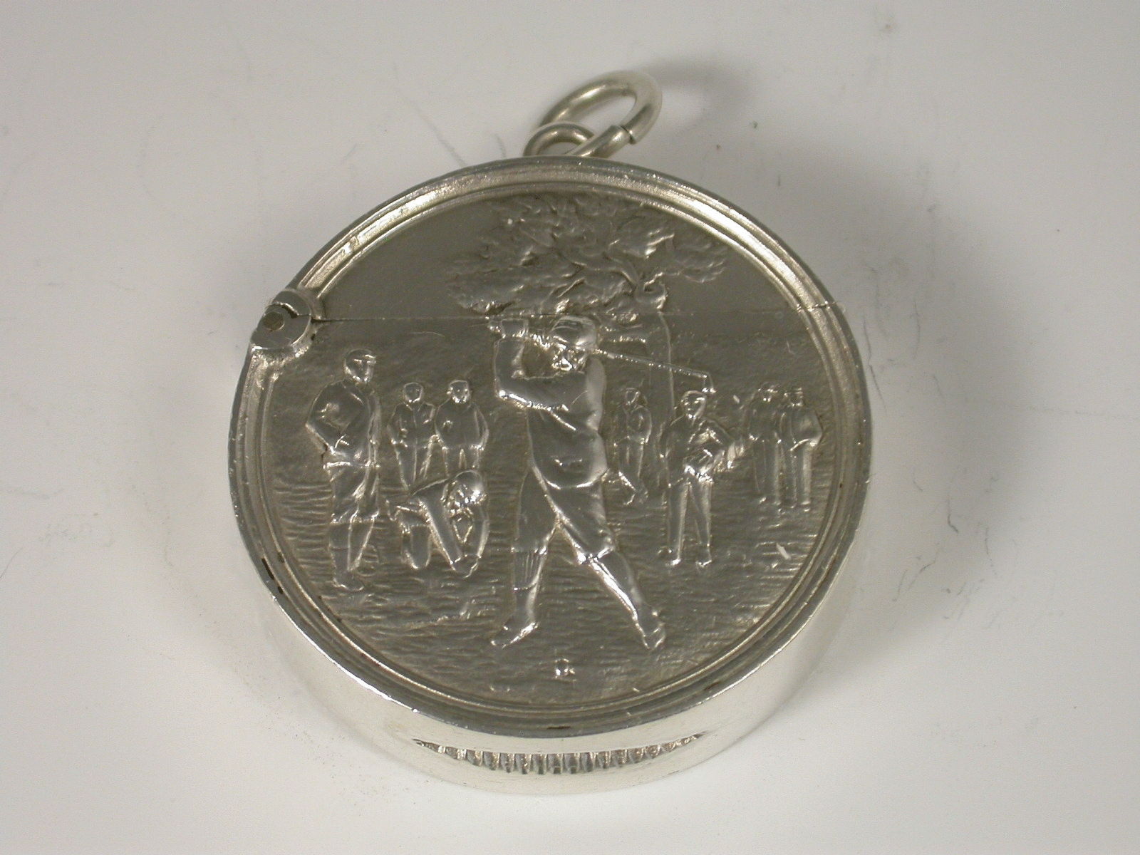 A rare Edwardian silver Vesta Case of circular form with hinged flip-top lid, the face chased and engraved with a raised scene depicting a golfer about to tee off, other golfers and spectators in the background.
