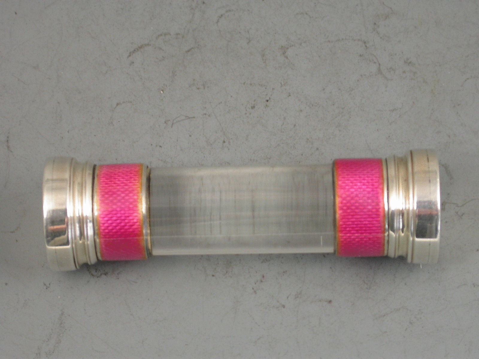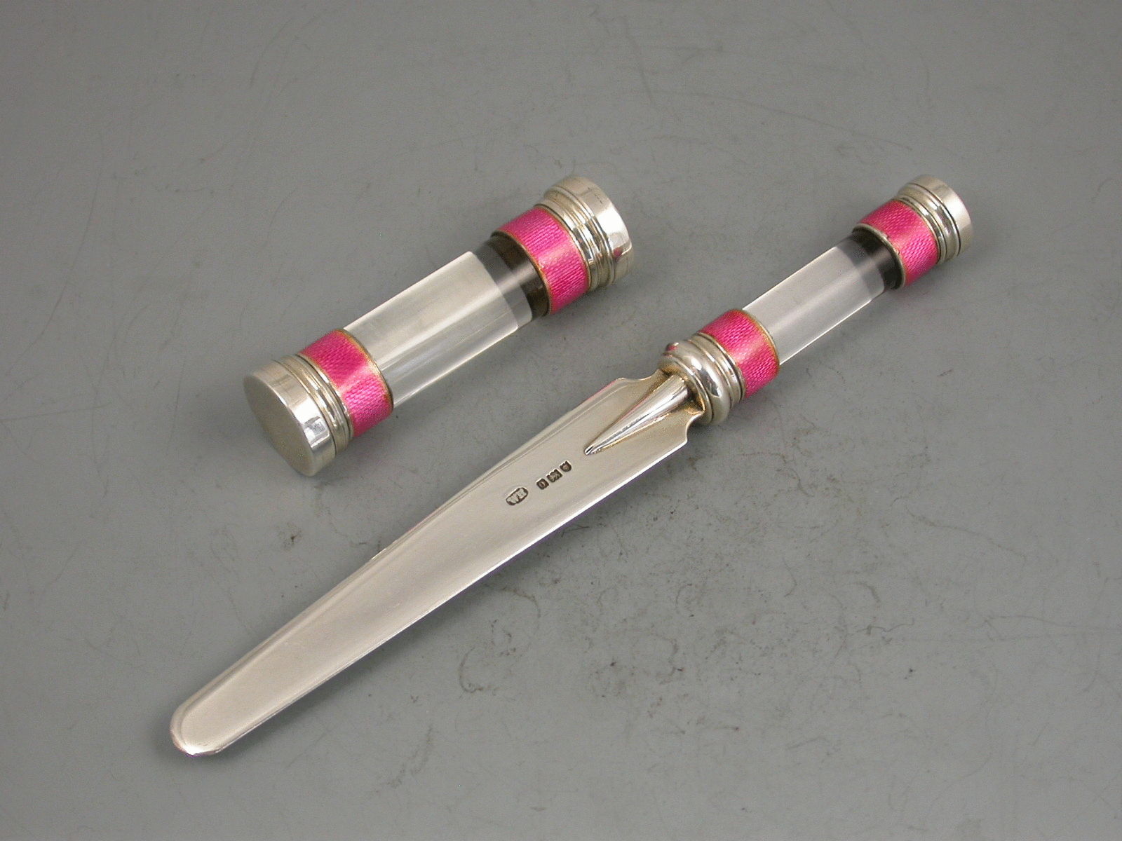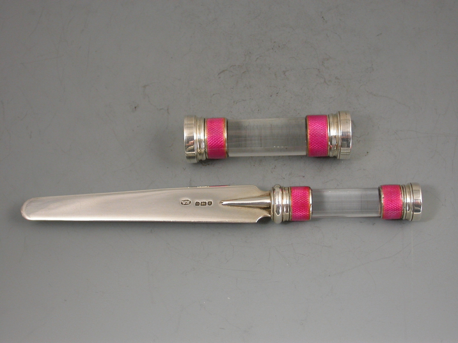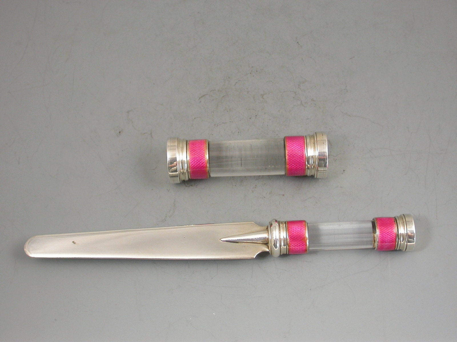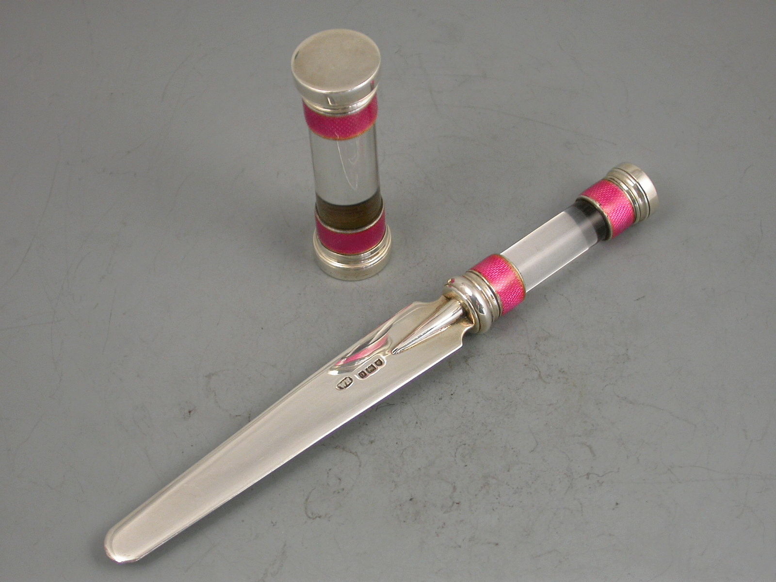 A fine quality Edwardian silver, pink Guilloche enamel and glass Desk Seal and Letter Opener, both pieces with bands of pink enamel at either end of the cylindrical glass bodies.