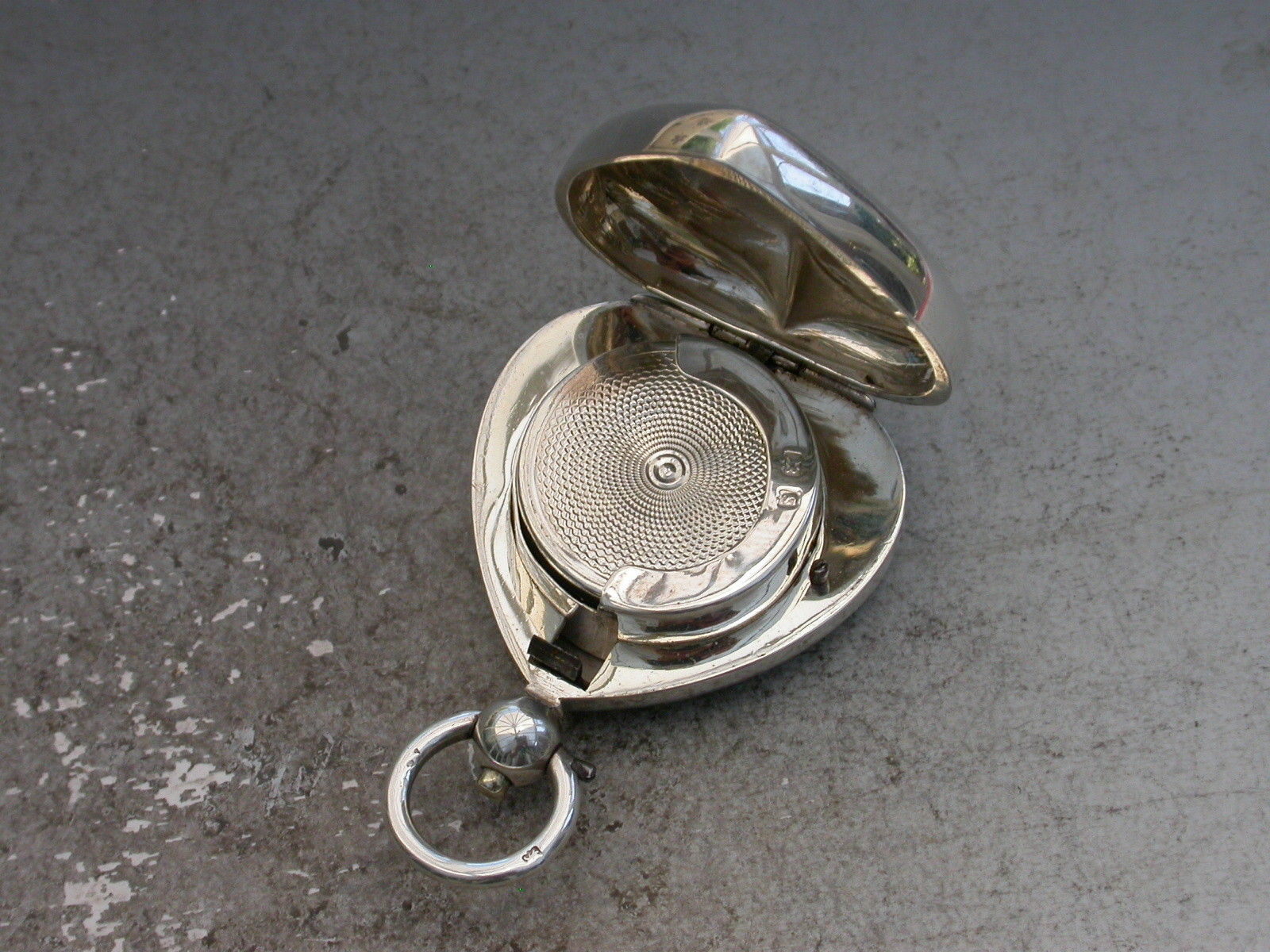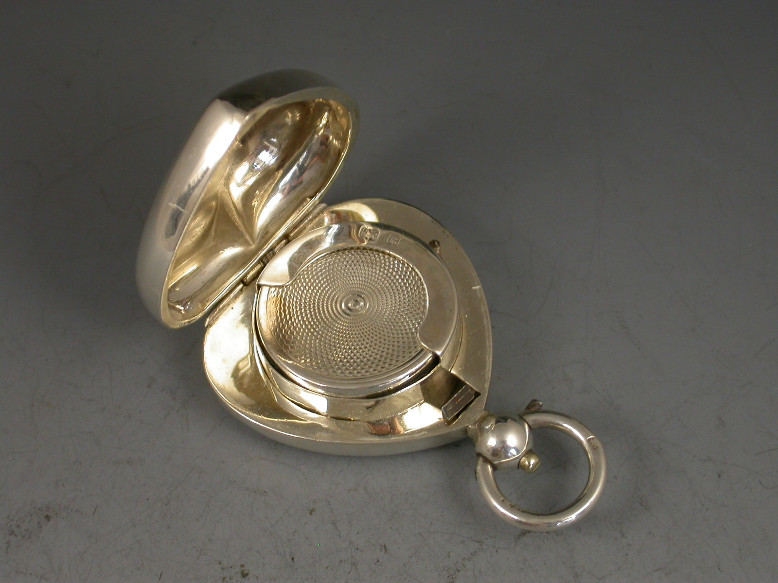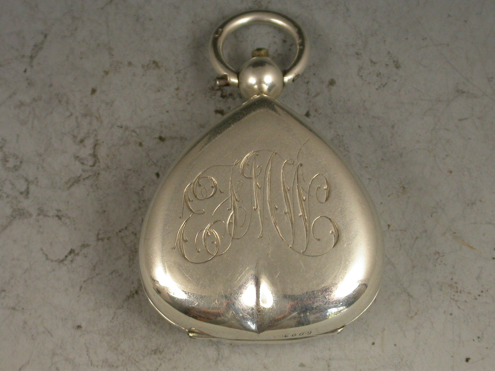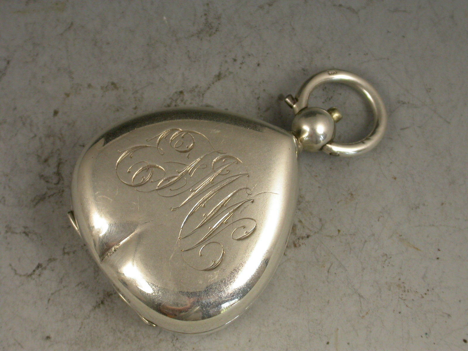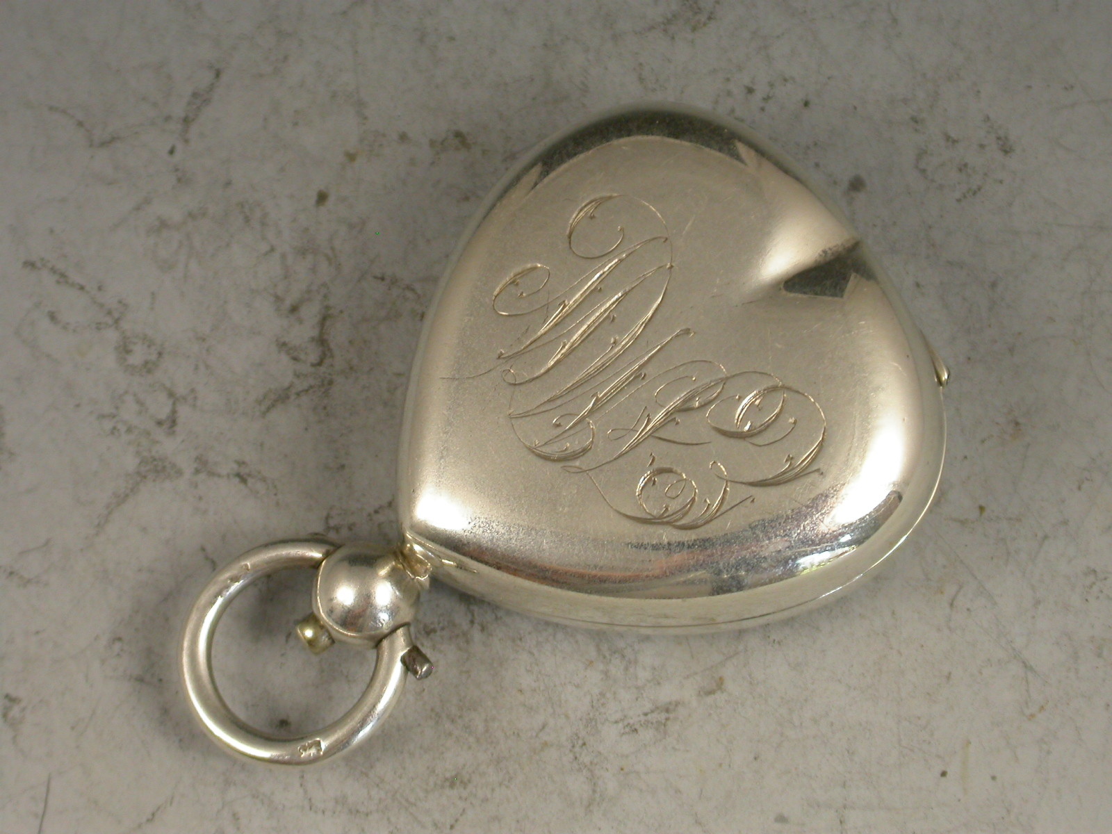 A good Edwardian silver Sovereign Case of heart shaped form with attached suspension ring and push button opening mechanism. The interior with single sprung sovereign compartment, the exterior engraved with contemporary initials.
