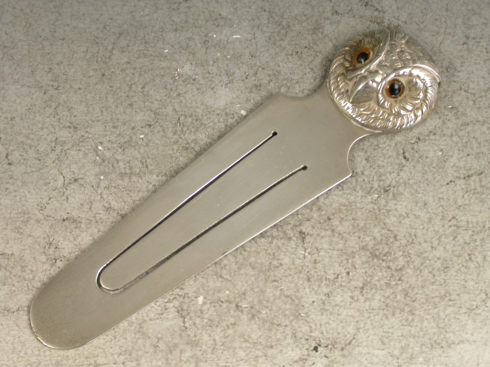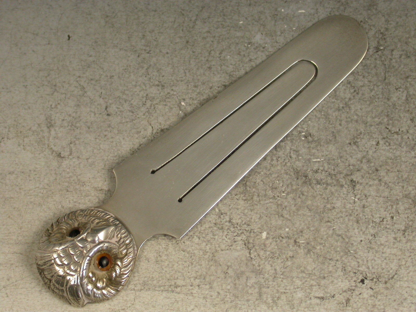 An early 20th century silver Bookmark, the terminal formed as an Owl’s head with realistically chased feathers and amber glass eyes.