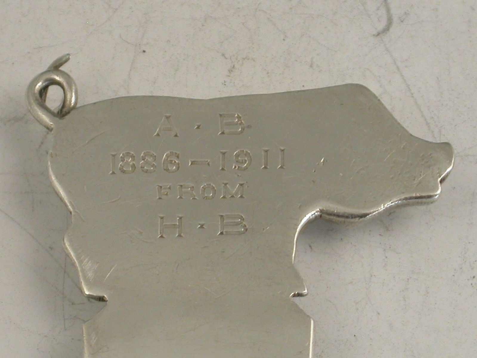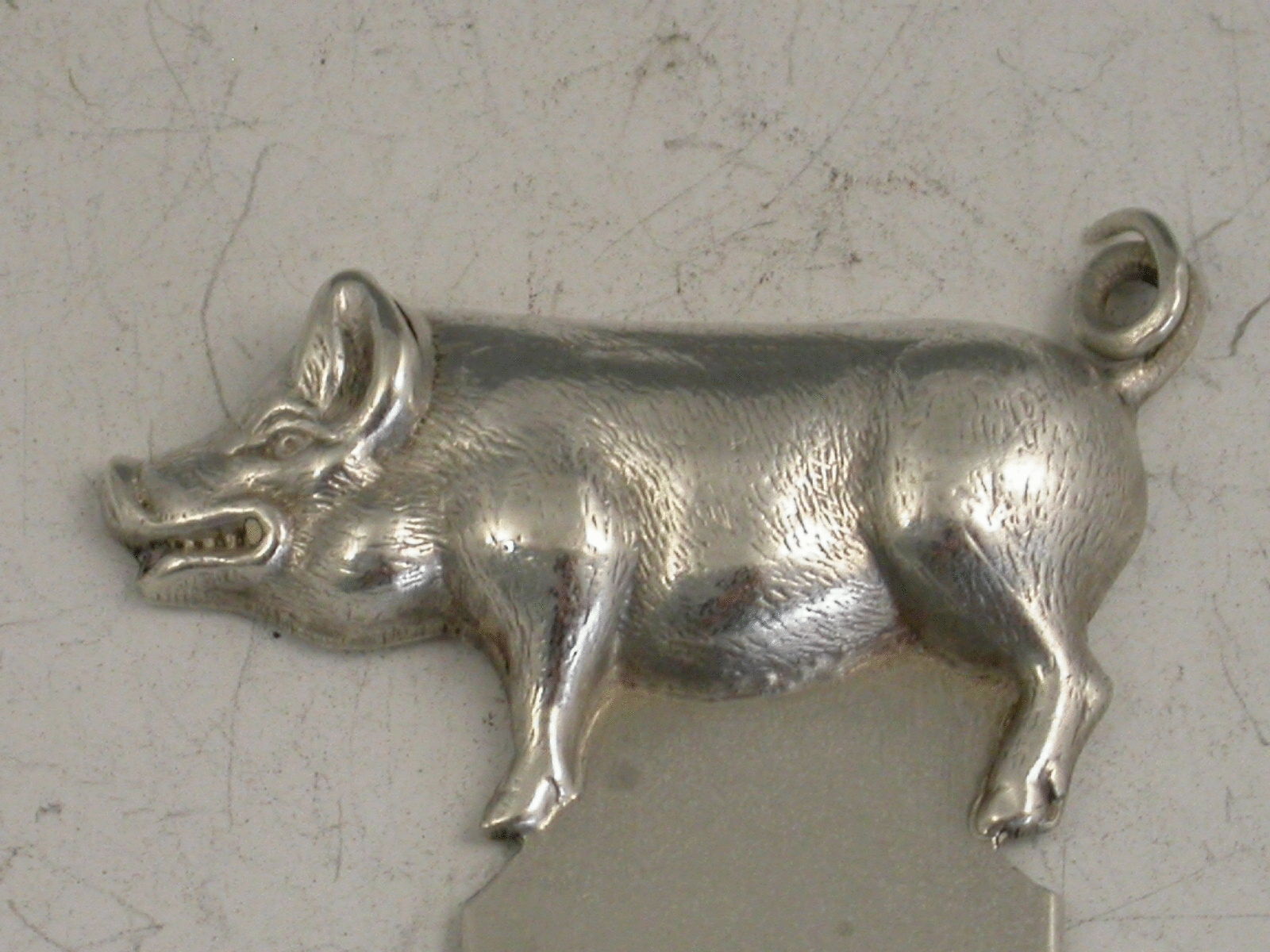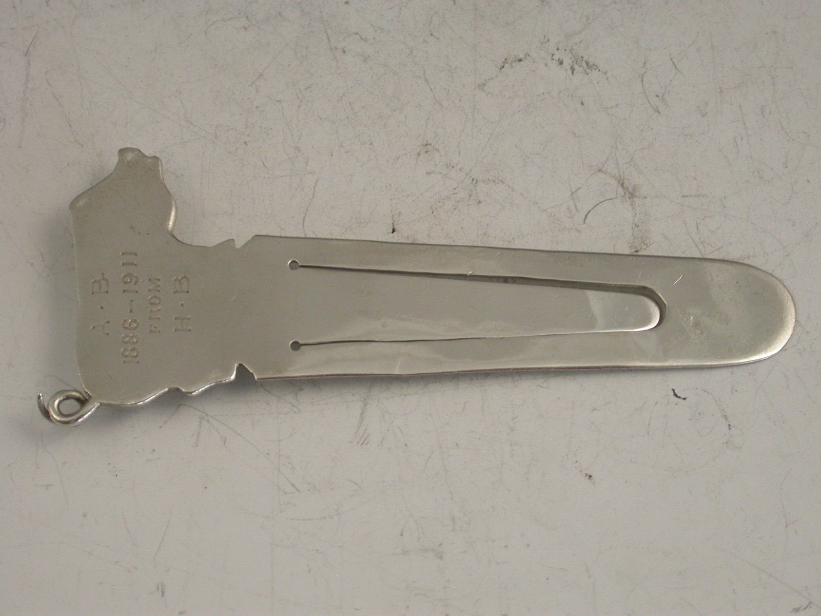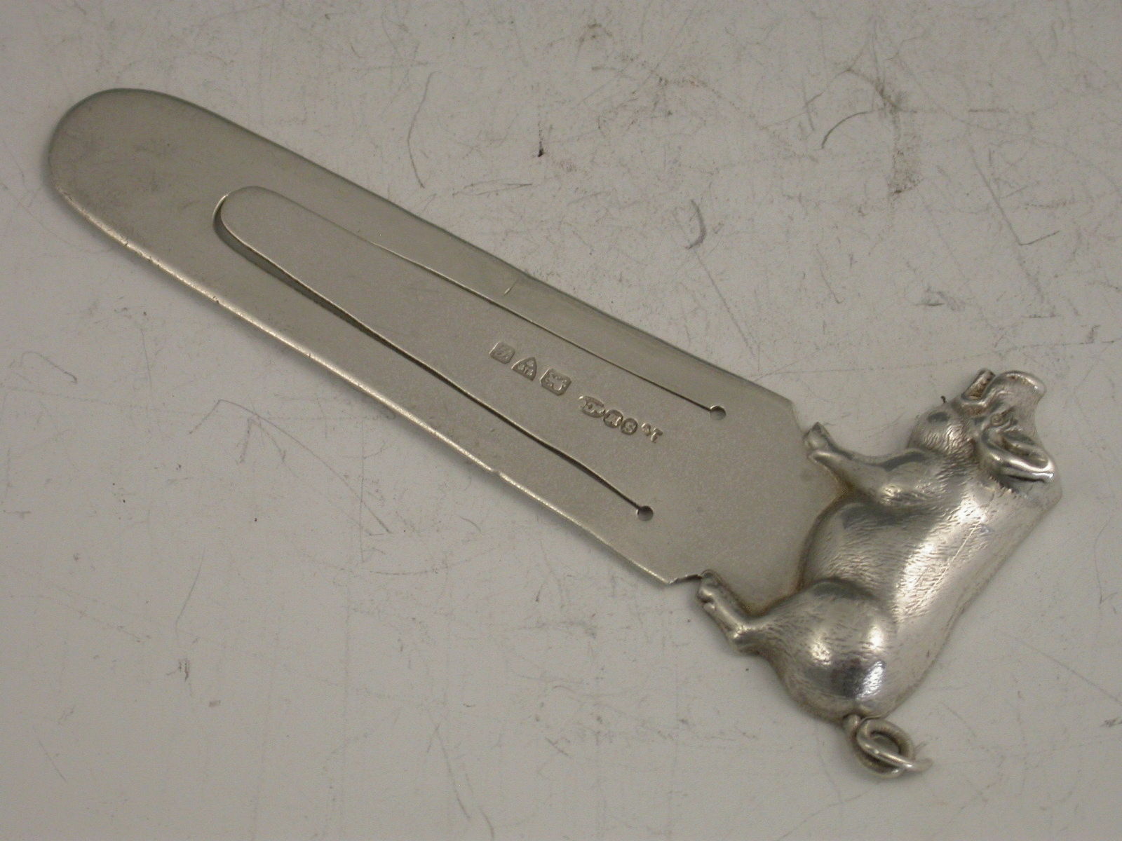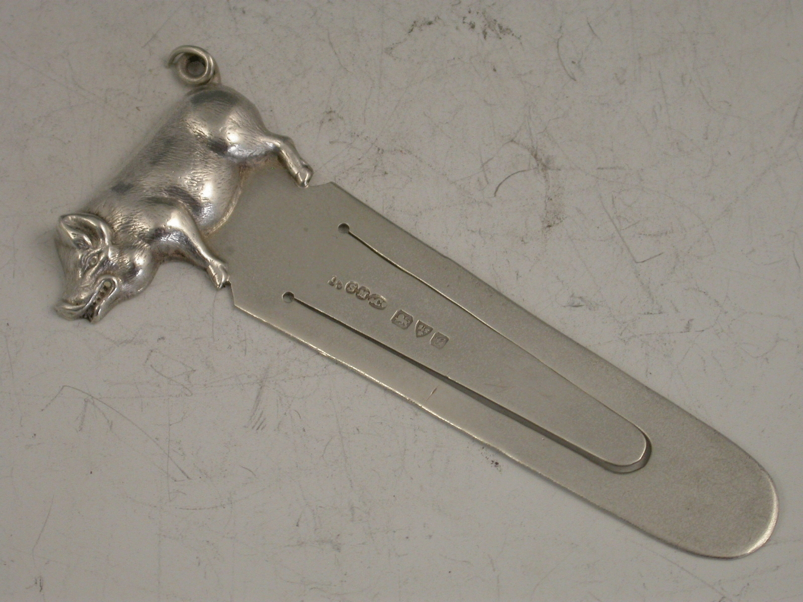 A good Edwardian silver novelty Bookmark, the terminal formed as a Pig/Boar. Engraved to the reverse with a contemporary presentation inscription.