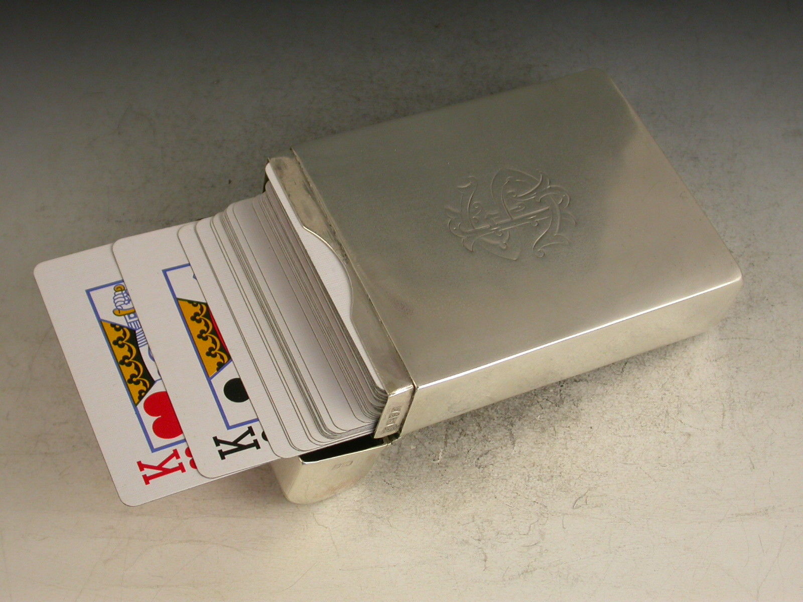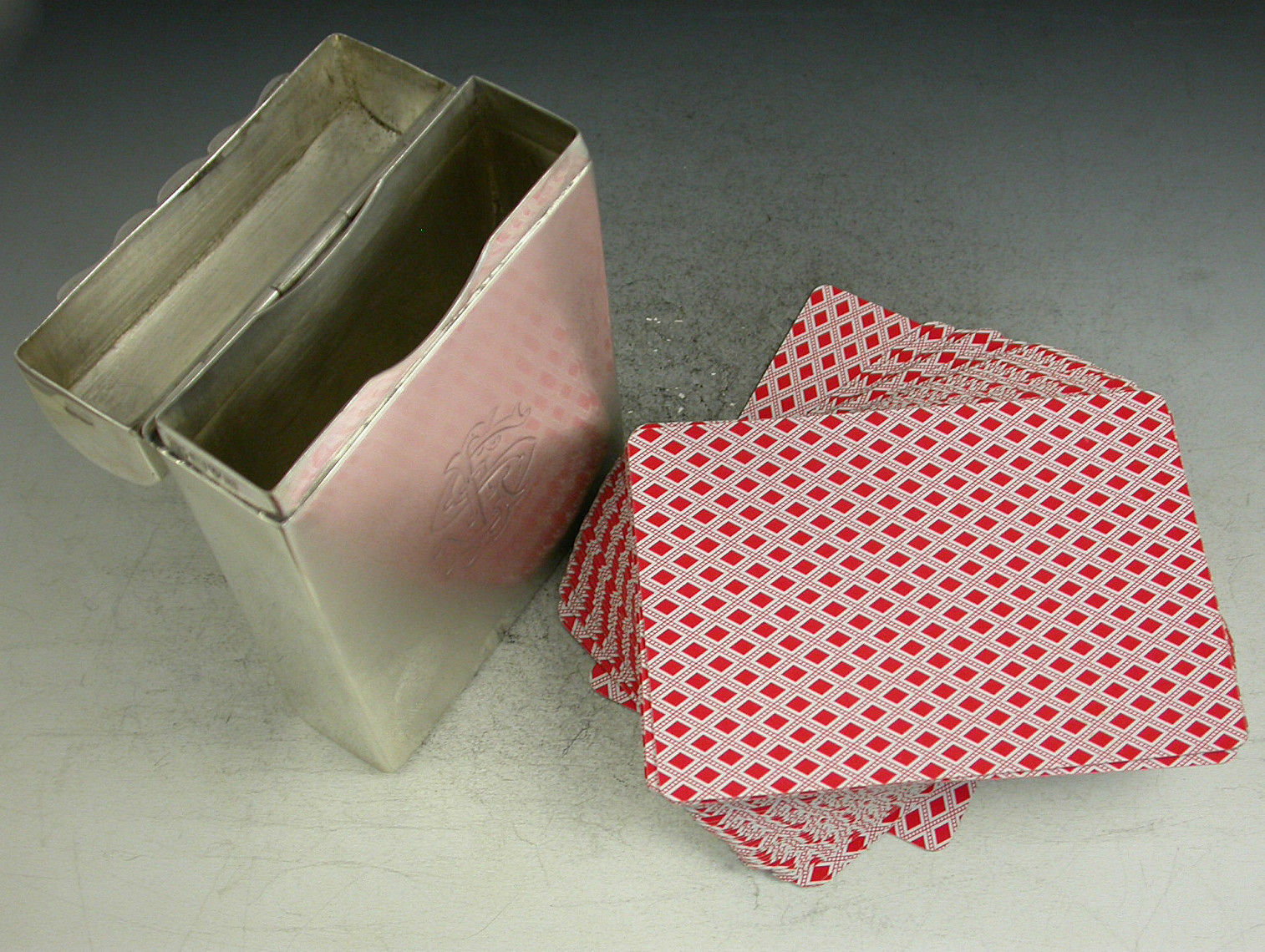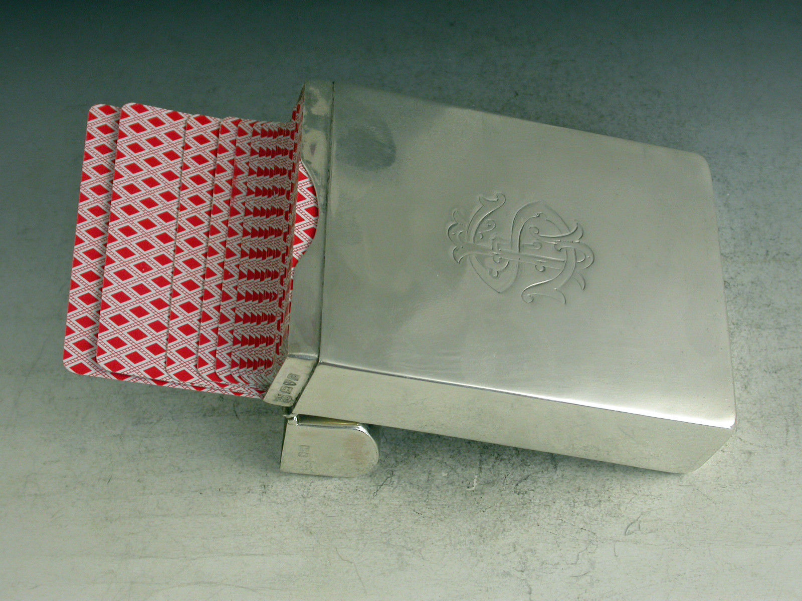 A good Edwardian silver Playing Cards Box of rounded rectangular form with hinged domed lid and raised thumb-piece, the face engraved with contemporary initials.