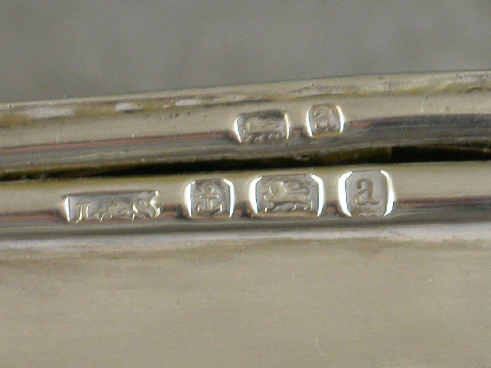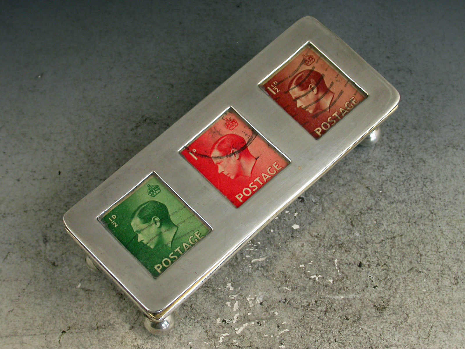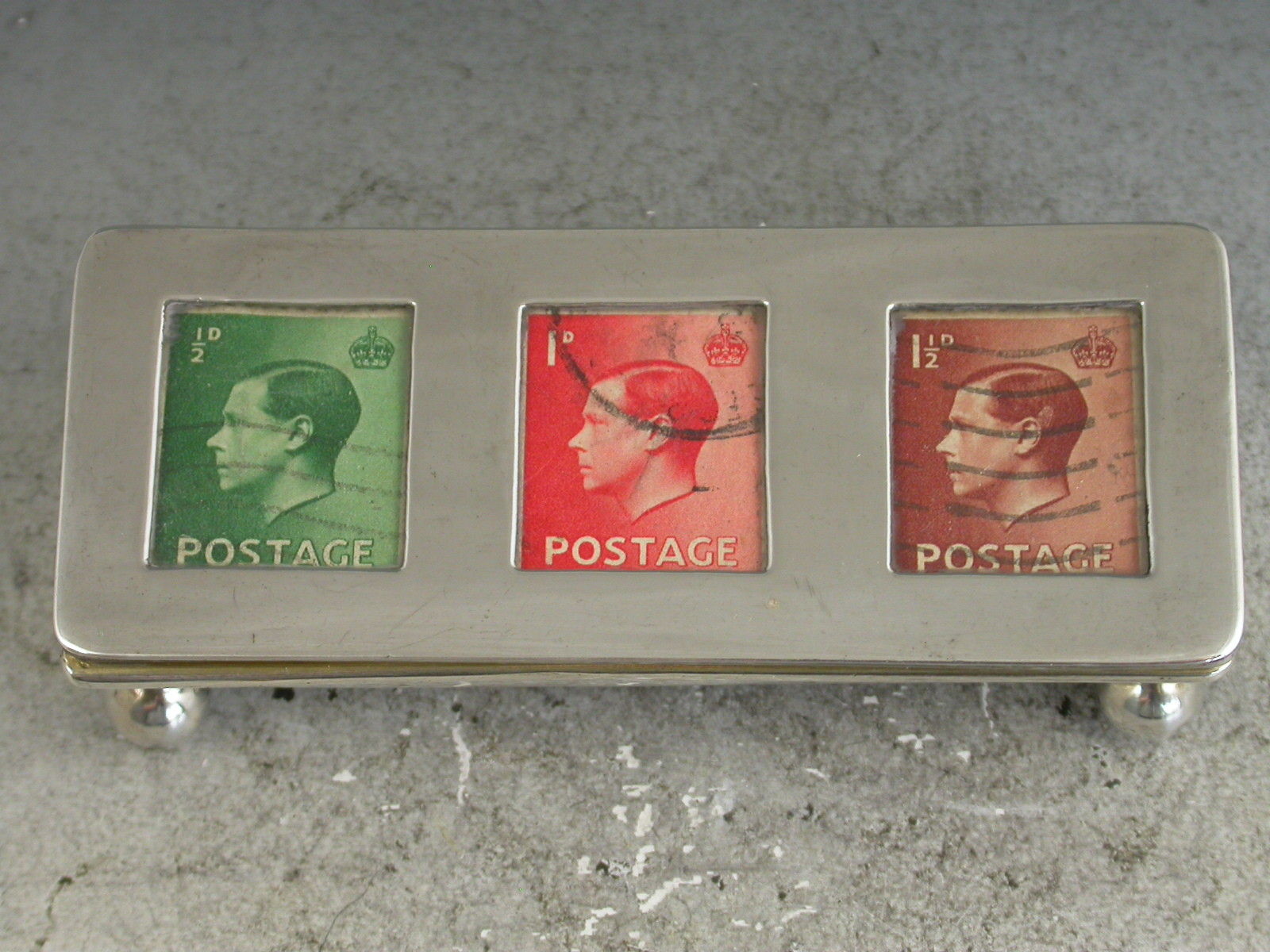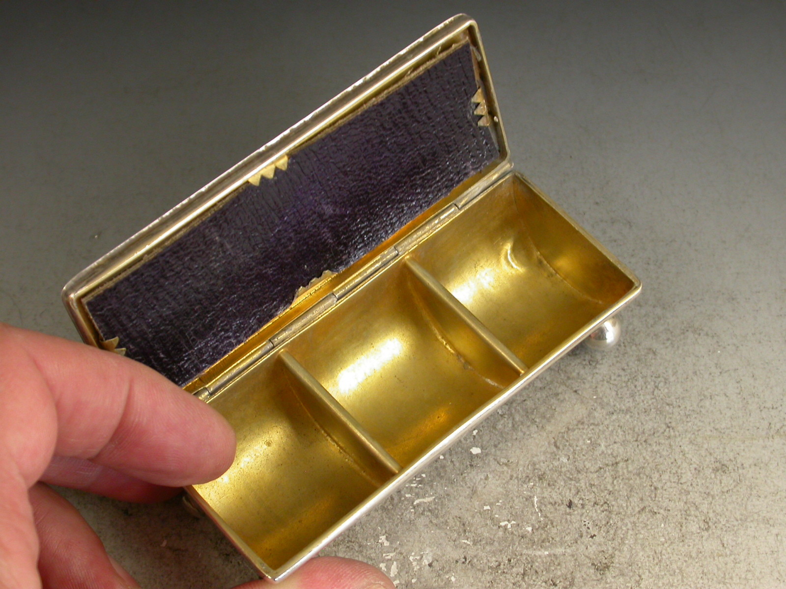 A very good early Edwardian triple compartment silver Stamp Box of trough shape, standing on four ball feet, the sprung hinged lid with three windows containing a set of slightly later Edward VIII stamps covered with glass panes. Silver gilt interior and leather cover to stamp compartment.