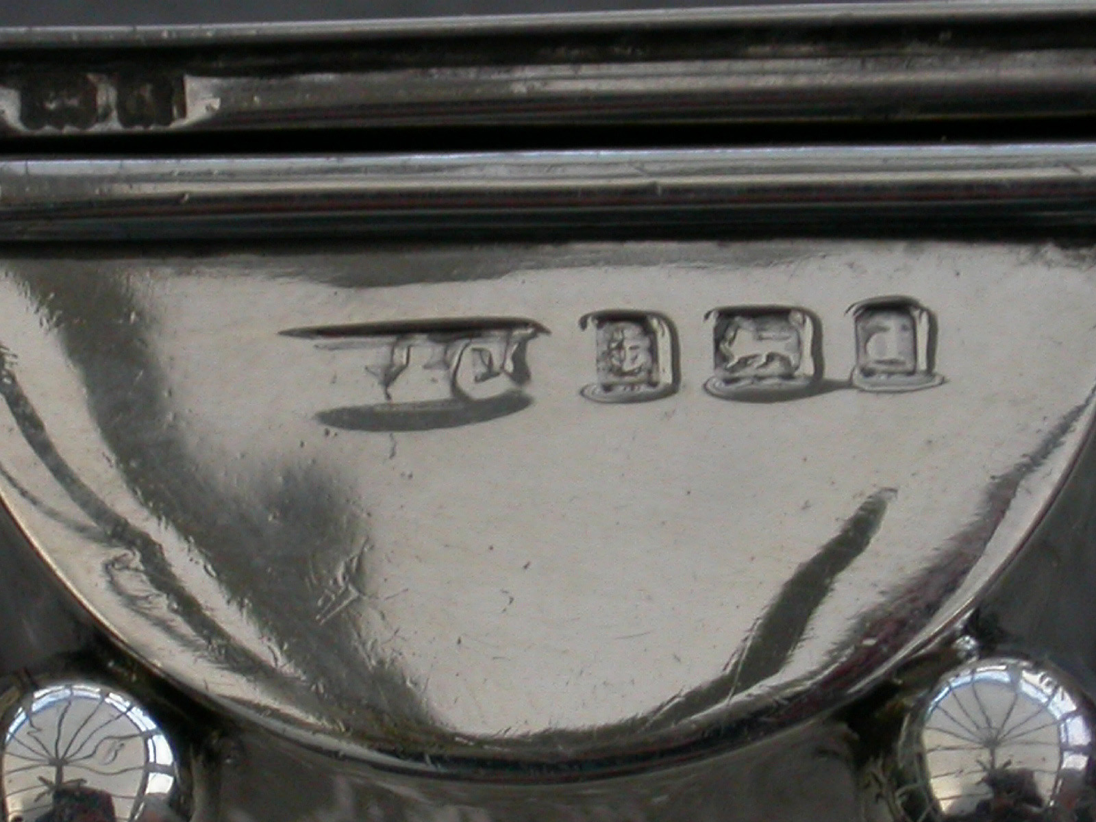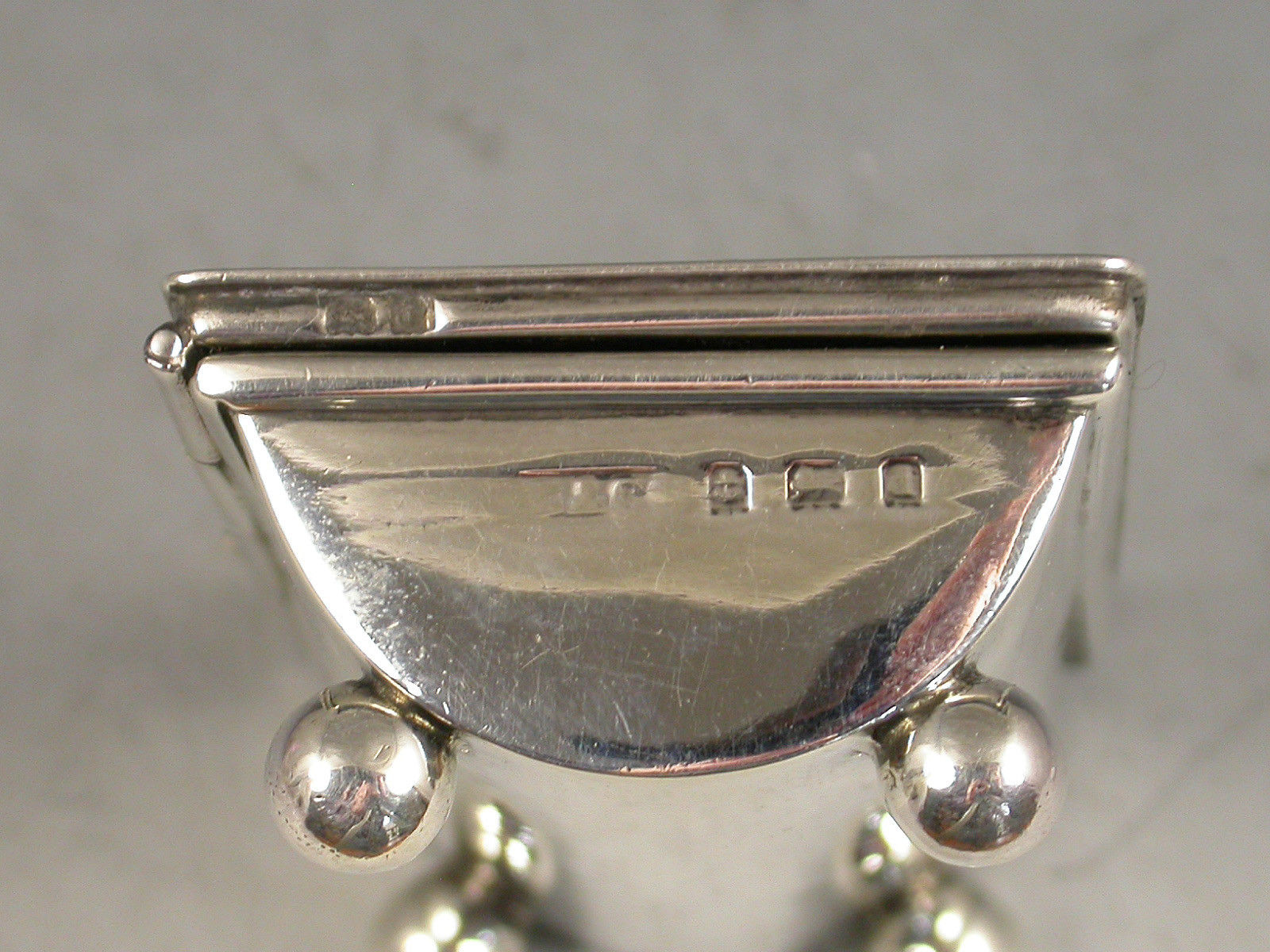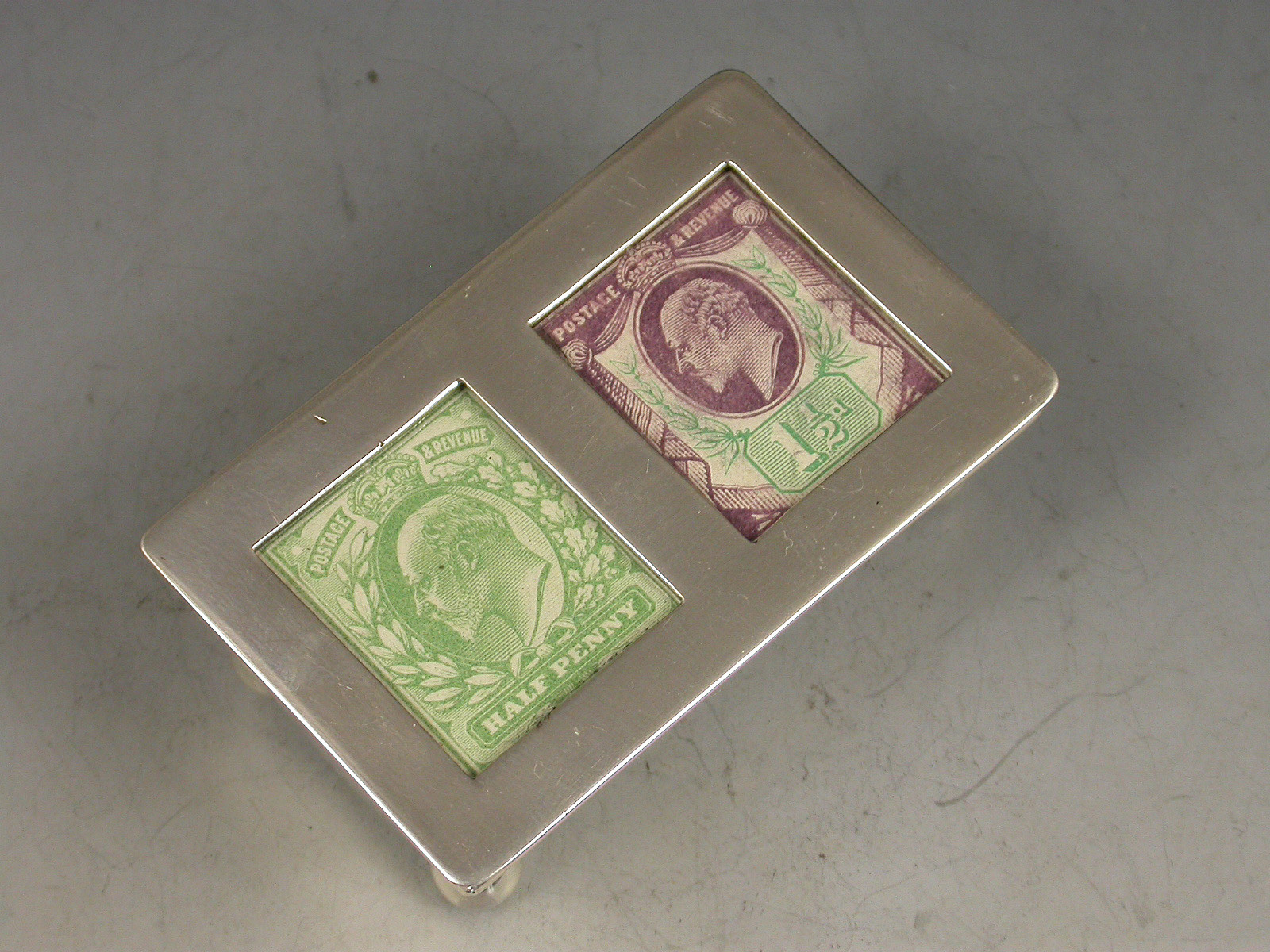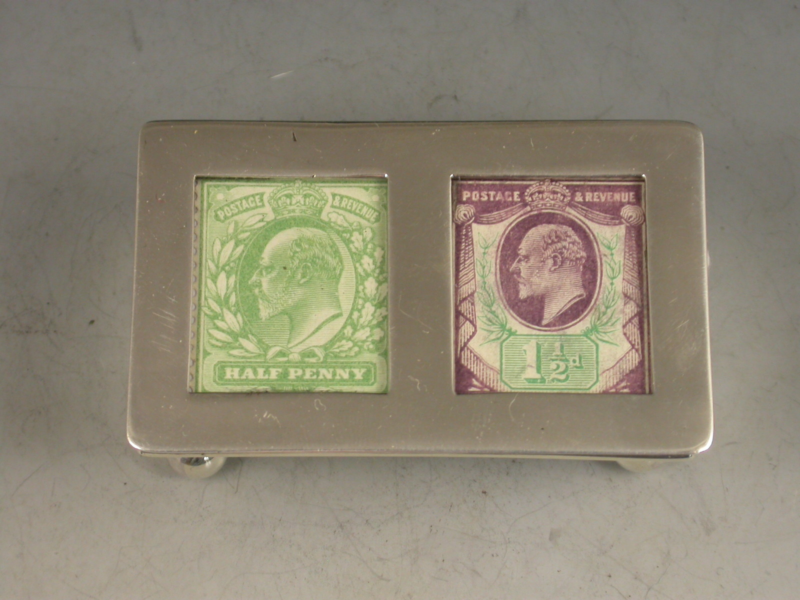 An Edwardian silver twin compartment Stamp Box of trough form, standing on four ball feet, the hinged lid opening to reveal a silver gilt interior and containing two glazed compartments holding Edwardian half penny and one and a half penny stamps.