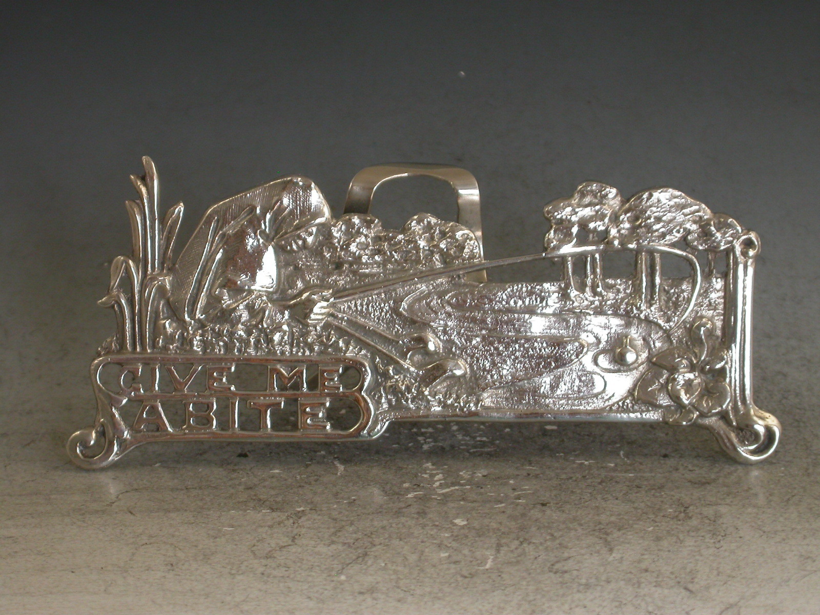 An interesting Edwardian pictorial cast silver Menu Holder in the Art Nouveau style depicting a Nun, Dame Juliana, fishing in a pond and pierced with the legend ""Give Me A Bite"". A hinged folding easel support to the reverse.