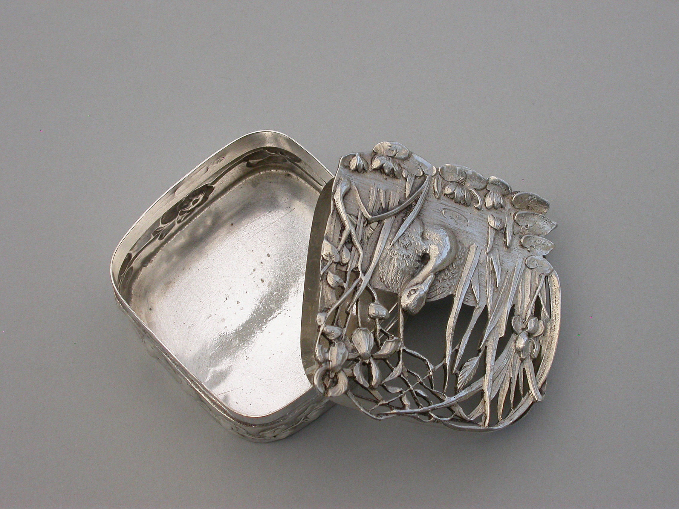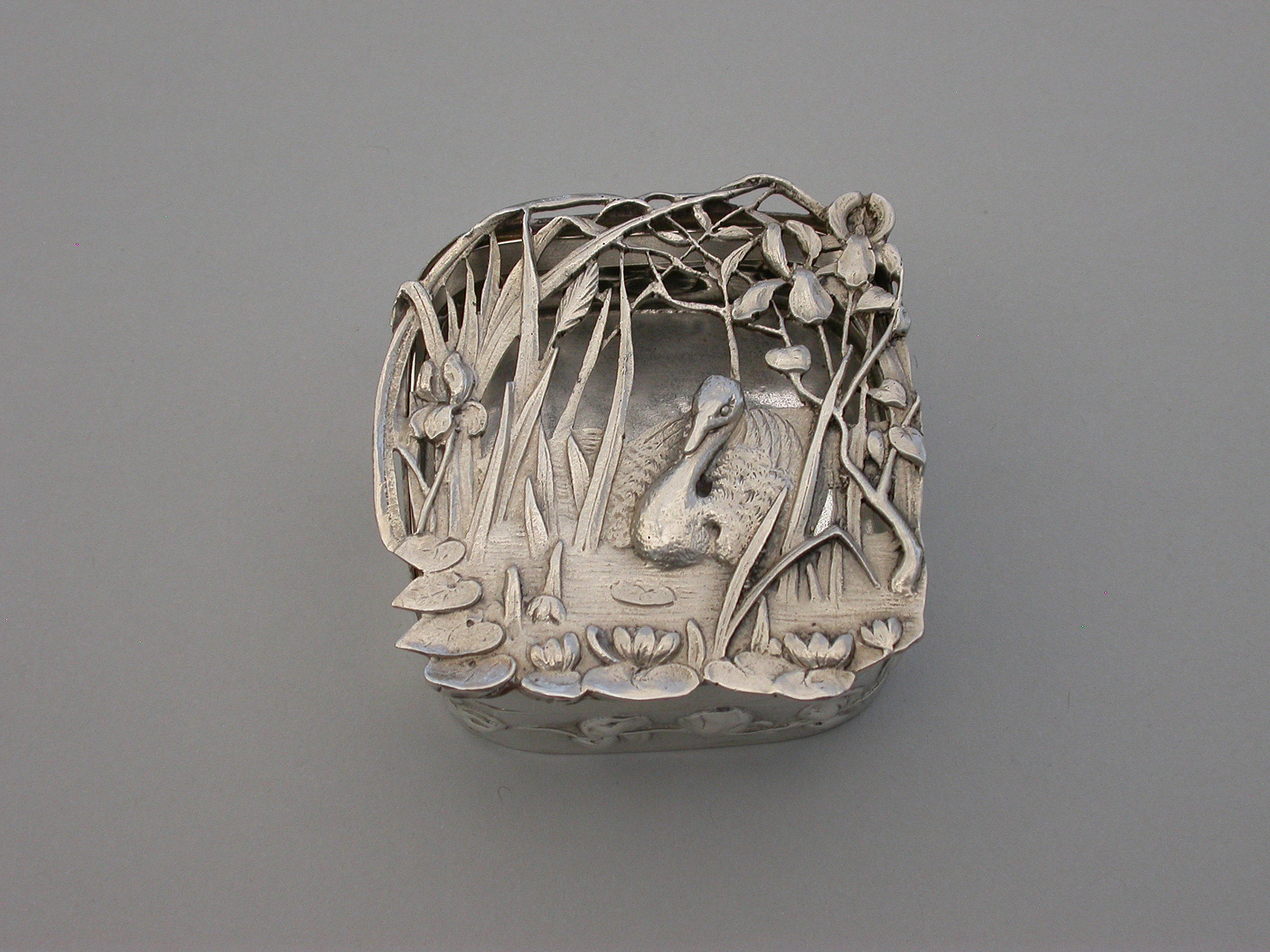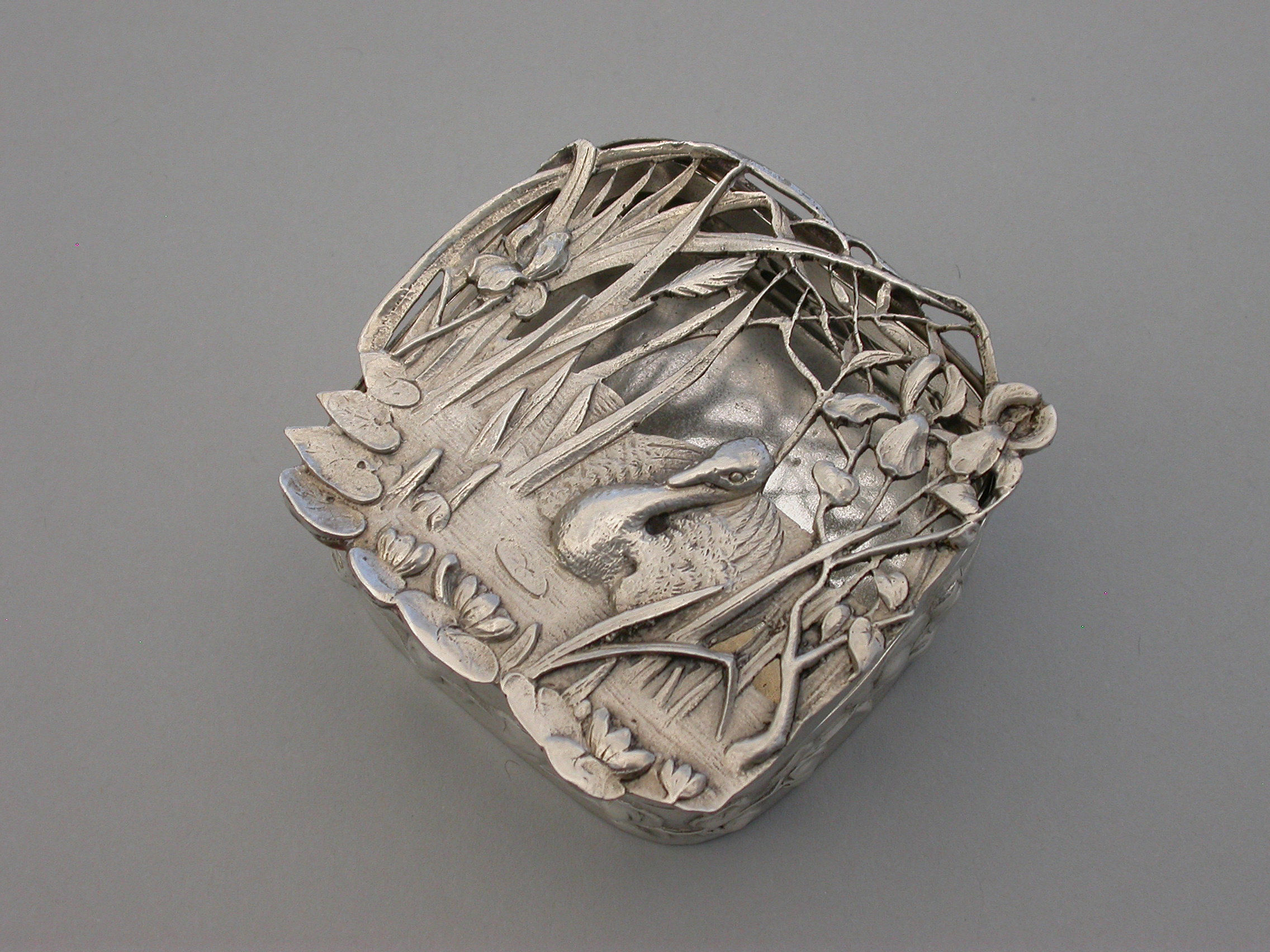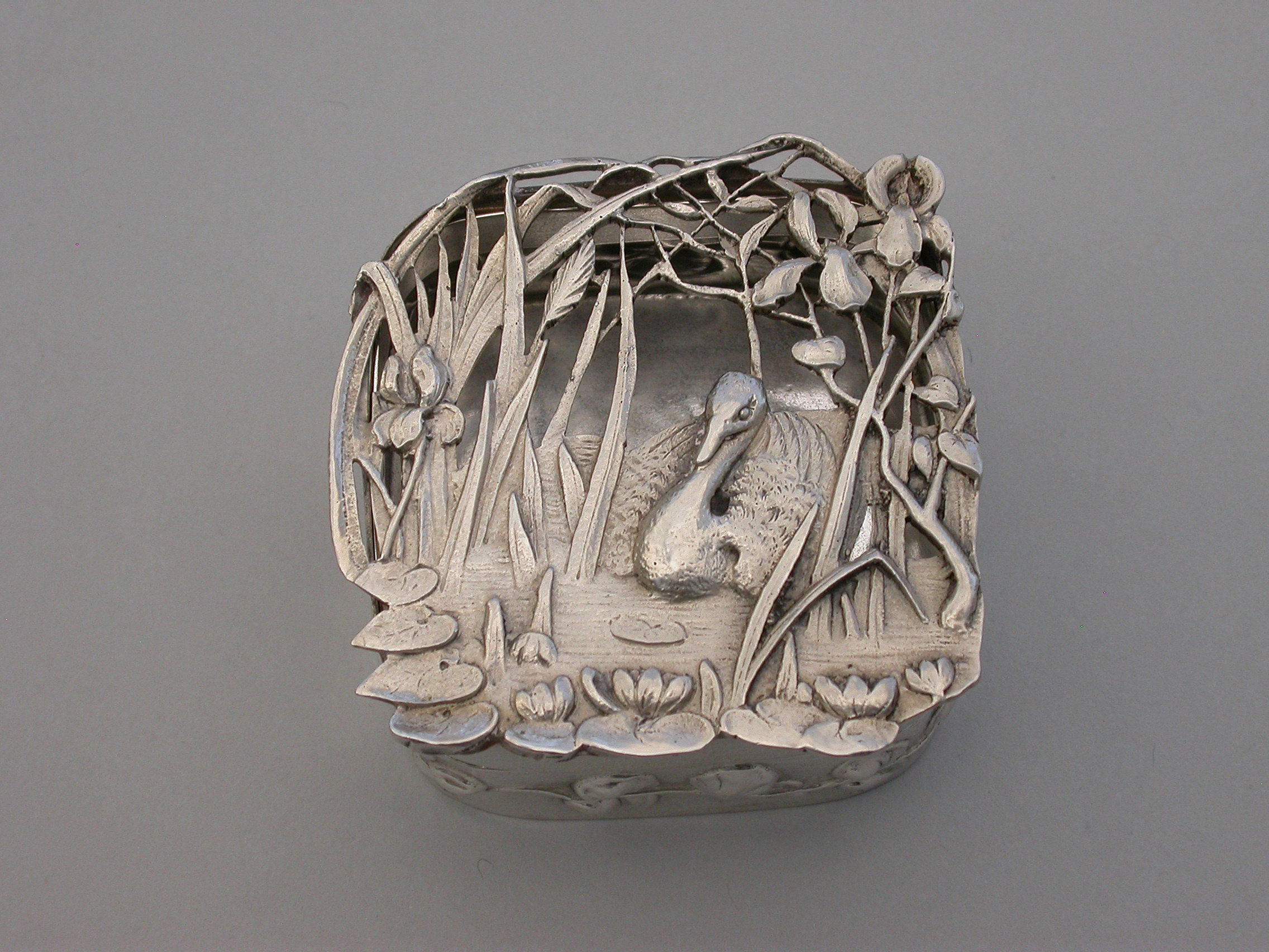A good quality Edwardian Art Nouveau silver Pot Pourri Box of rounded square shape with pull-off cover, the sides embossed with a band of trailing convolvulus flowers. The applied cast and pierced shaped silver lid decorated with a scene depicting a swan swimming on a pond amongst lilies and flag irises.