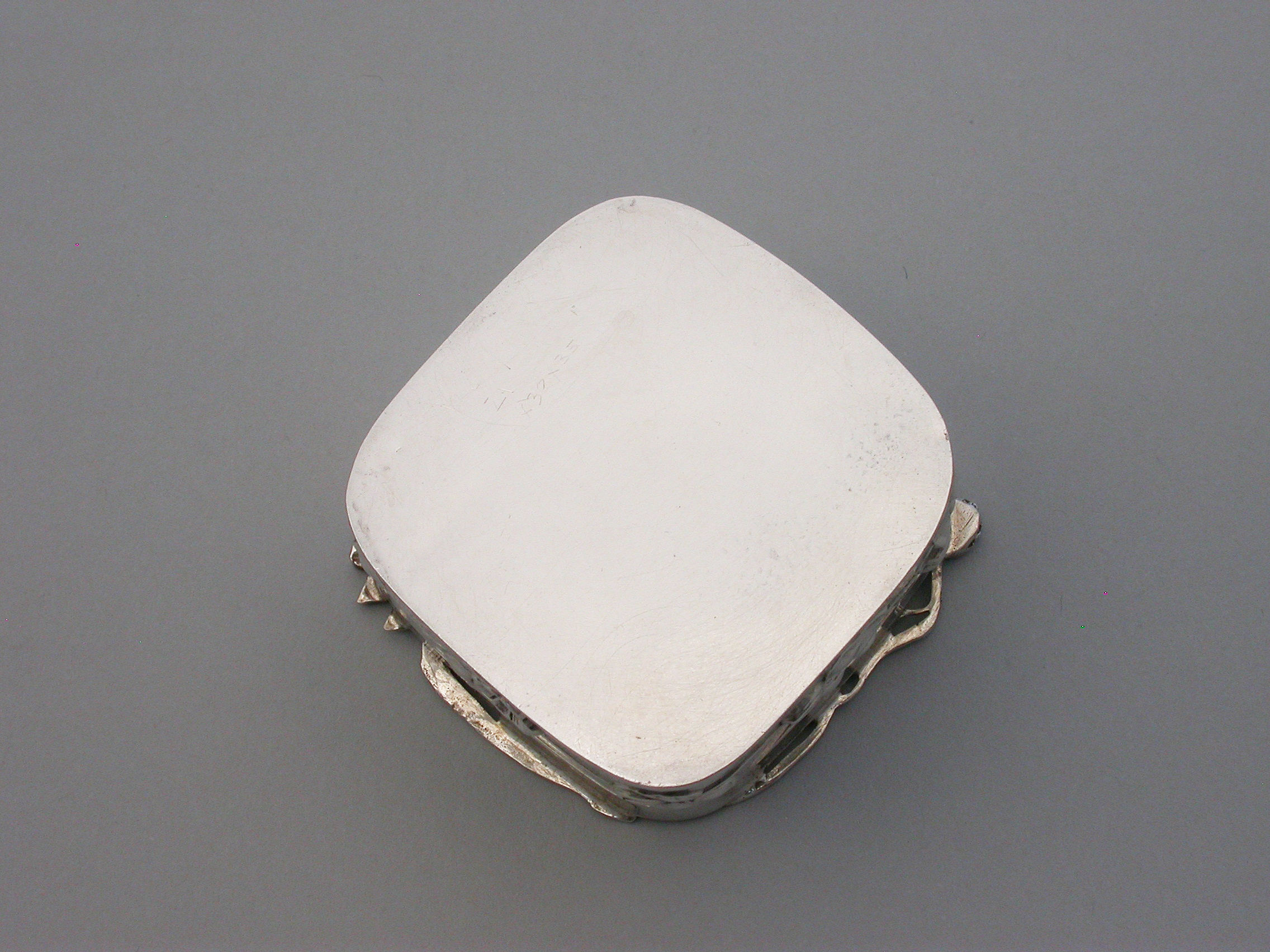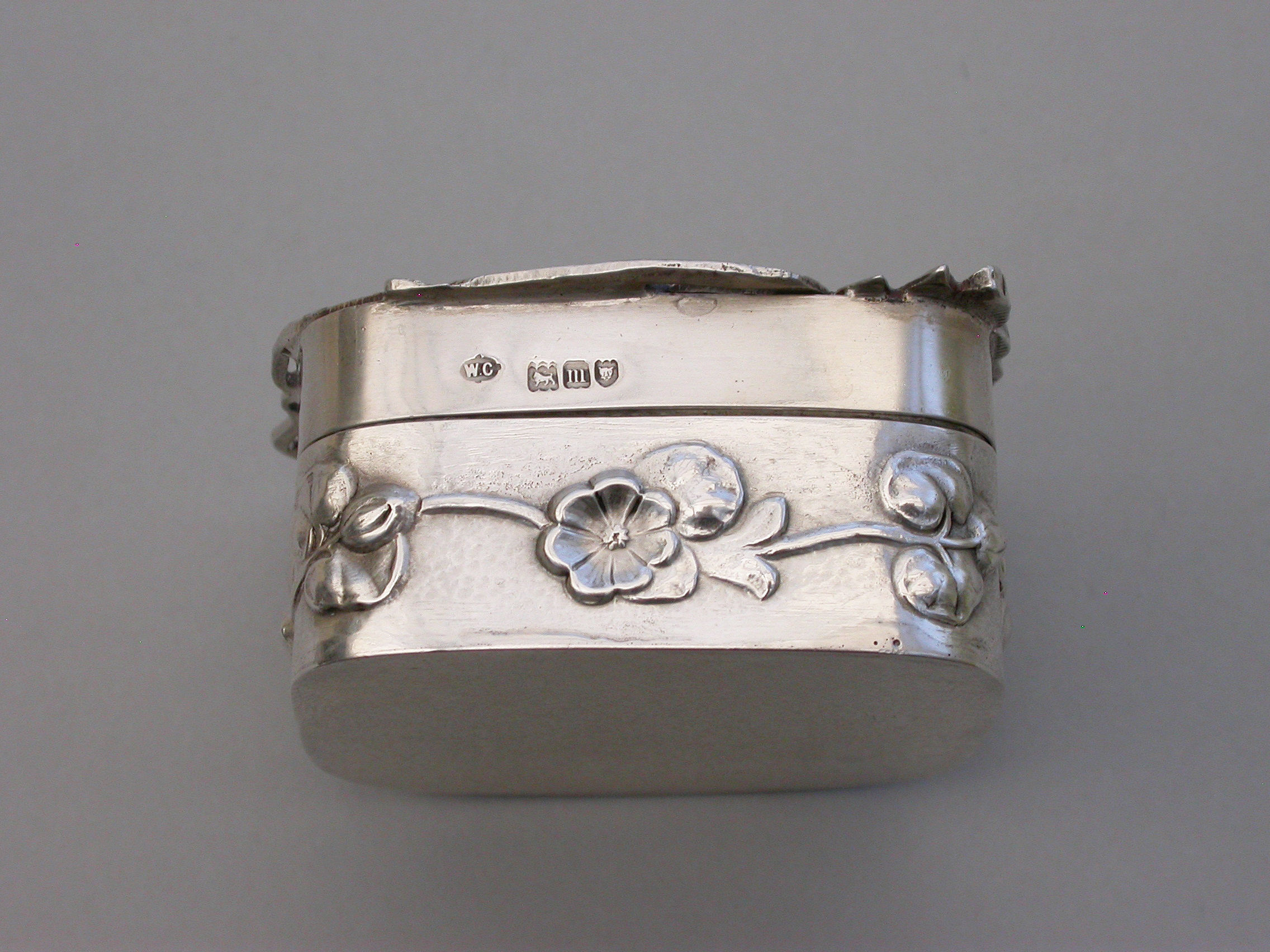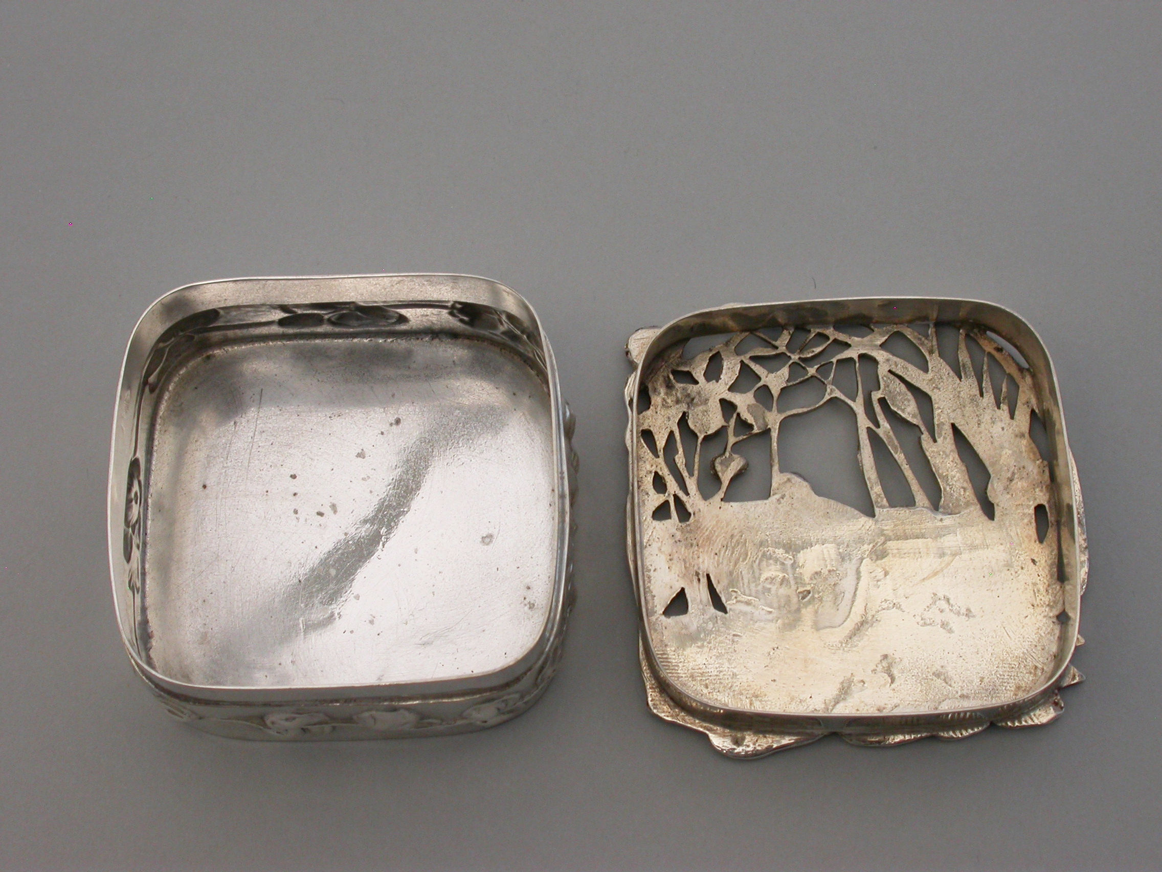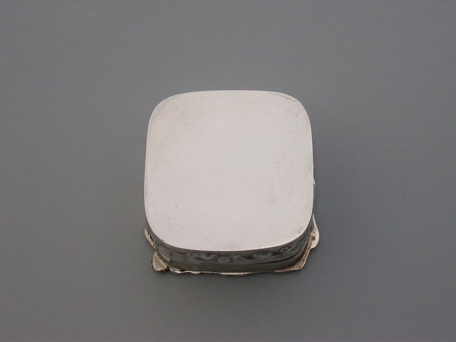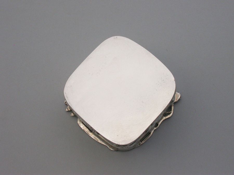 A good quality Edwardian Art Nouveau silver Pot Pourri Box of rounded square shape with pull-off cover, the sides embossed with a band of trailing convolvulus flowers. The applied cast and pierced shaped silver lid decorated with a scene depicting a swan swimming on a pond amongst lilies and flag irises.