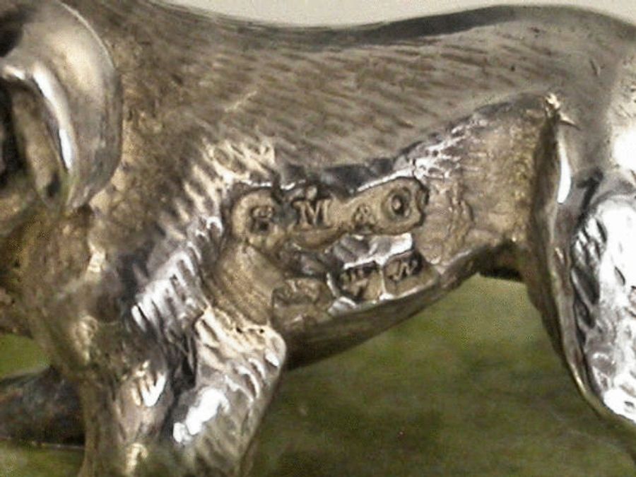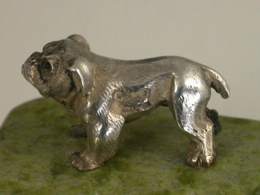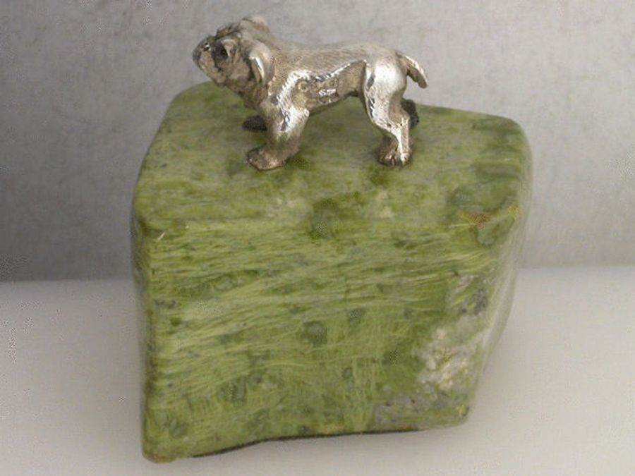 An Edwardian silver model of a Bulldog standing on a piece of green Connemara marble stone, very finely modelled with superb detail and with dark red glass eyes.