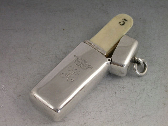 An early Edwardian silver Butt Marker of elongated rounded rectangular form with hinged flip-top lid with attached suspension ring, the silver gilt interior with 8 numbered ivory or bone pegs. The body engraved with a Marquesses Coronet and initial ‘H’.