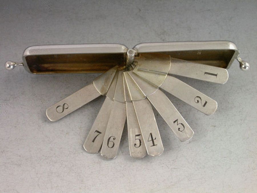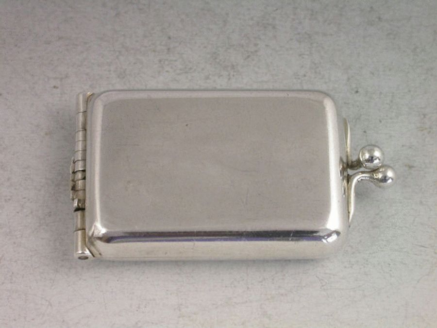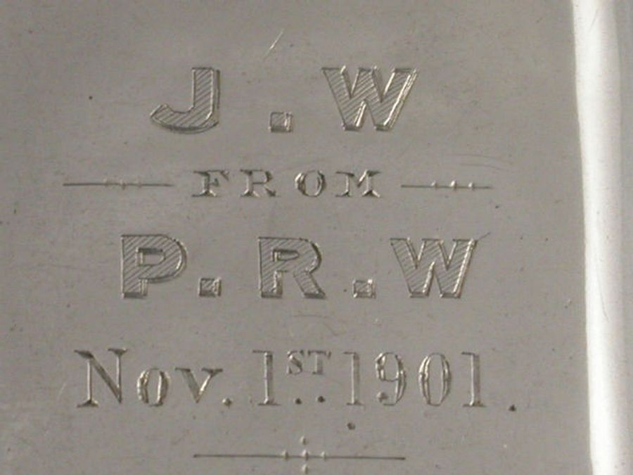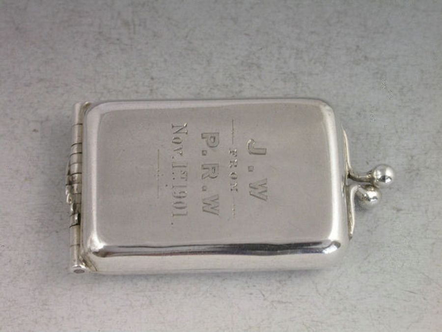 An early 20th century silver Butt Marker of plain rounded rectangular form with twin clasp closure, silver gilt interior, the ingenious multi-barrelled hinge opening to produce the 8 numbered steel pegs in a cascading fan pattern. Engraved with contemporary presentation inscription: J.W From P.R.W. Nov 1st 1901.