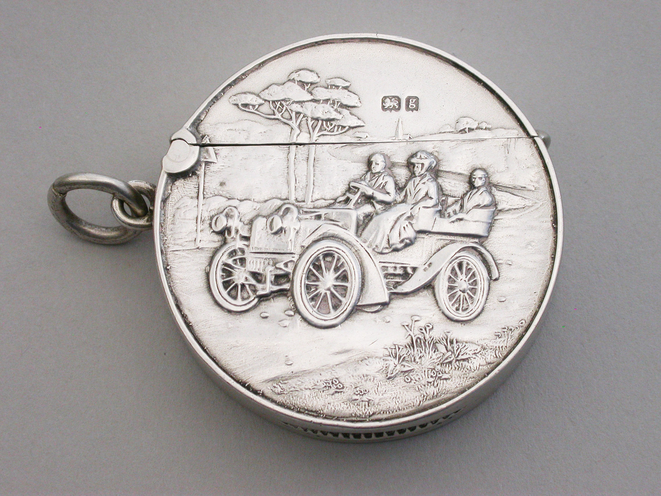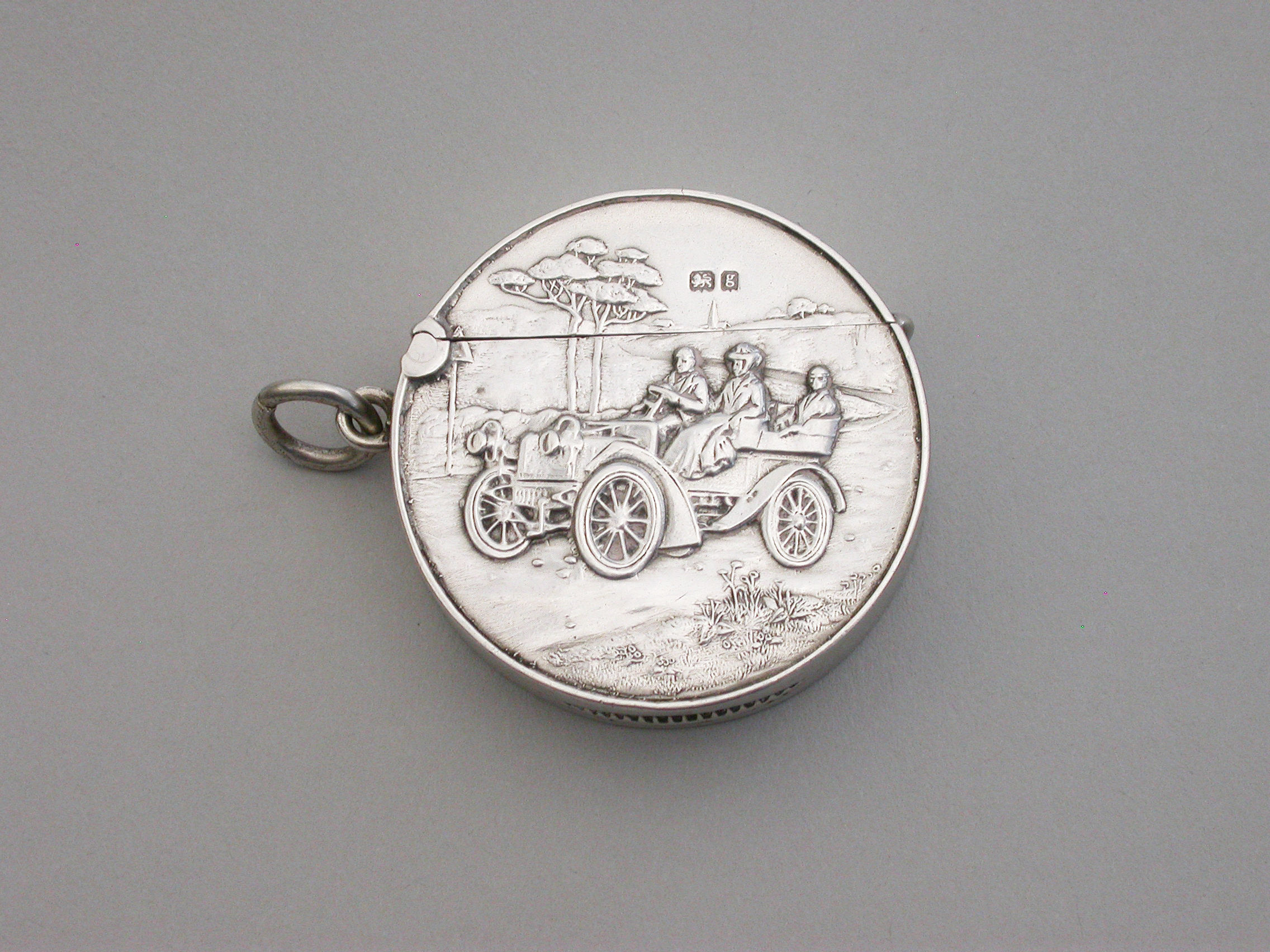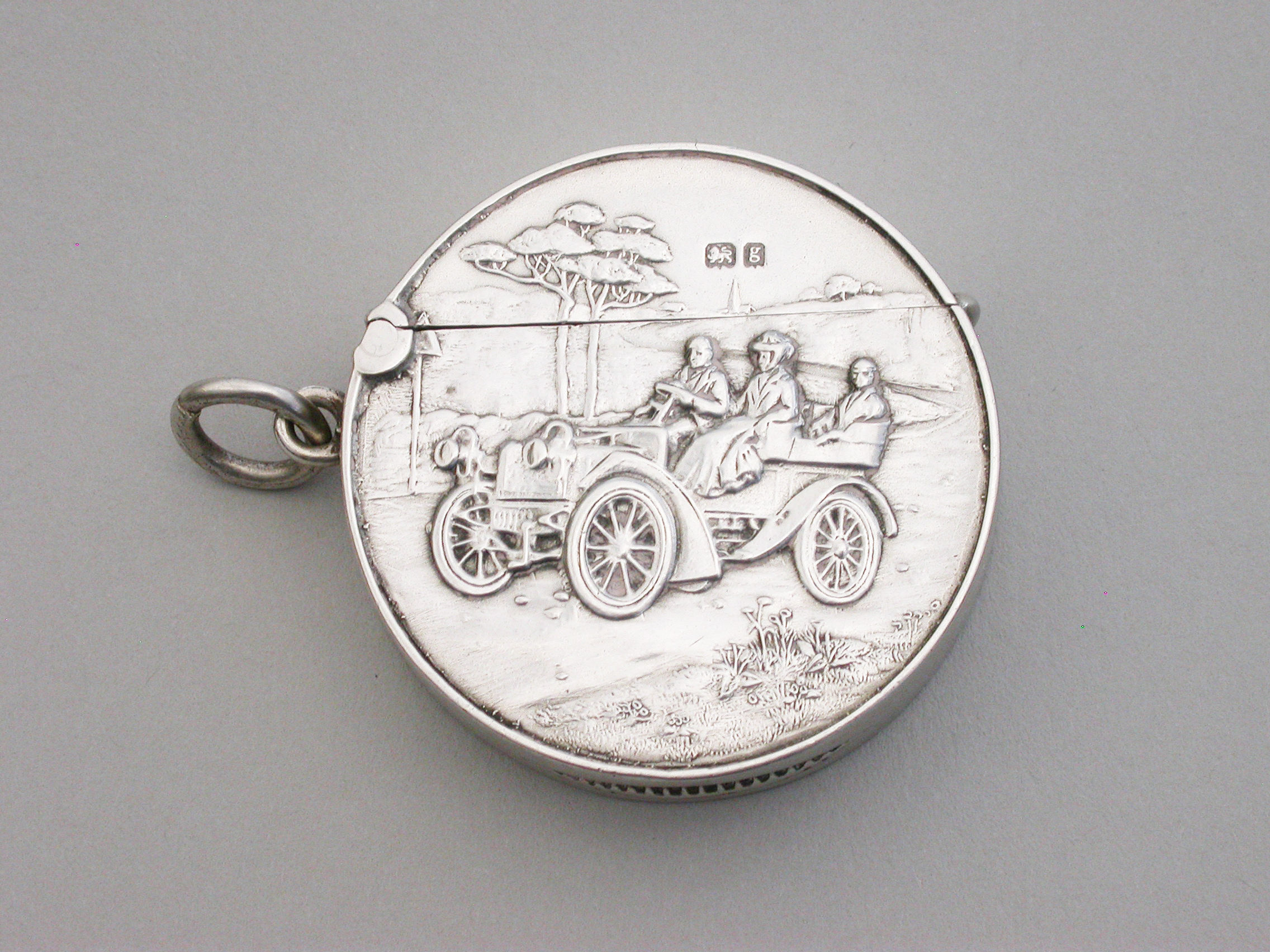 A rare Edwardian circular silver Vesta Case with hinged flip-top lid, the face die-struck with a scene depicting three people in a vintage car. A striker to the base and attached suspension ring.