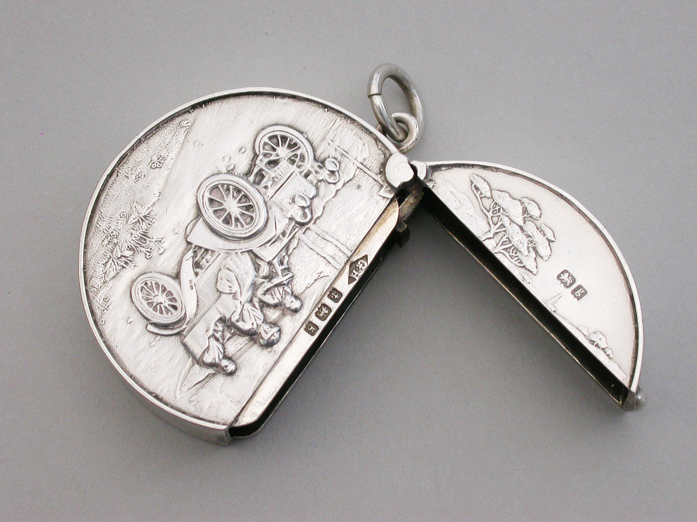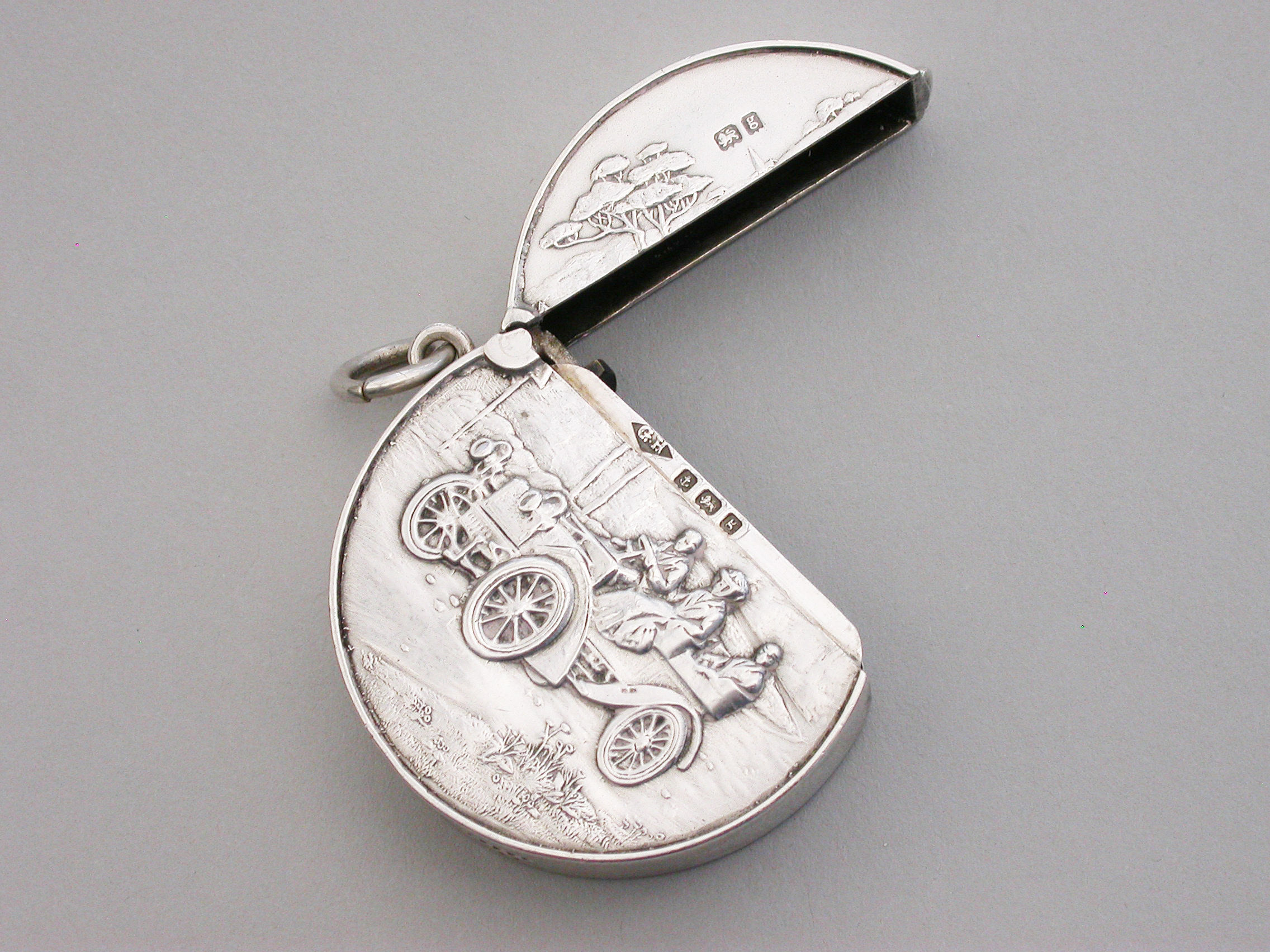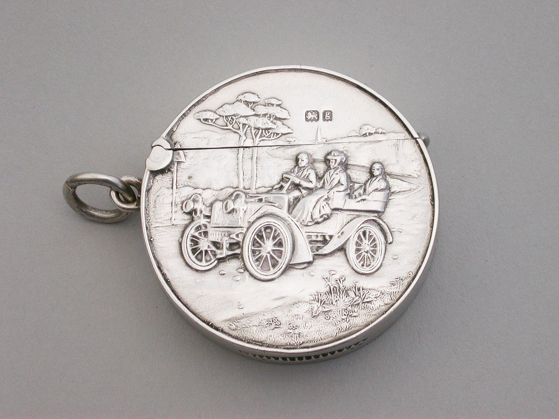 A rare Edwardian circular silver Vesta Case with hinged flip-top lid, the face die-struck with a scene depicting three people in a vintage car. A striker to the base and attached suspension ring.