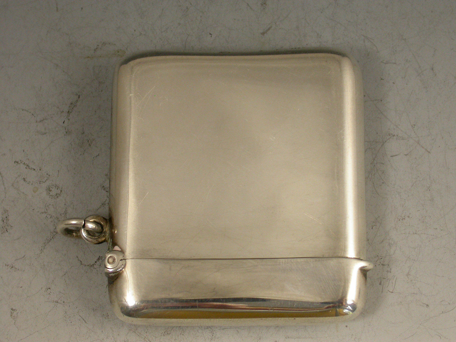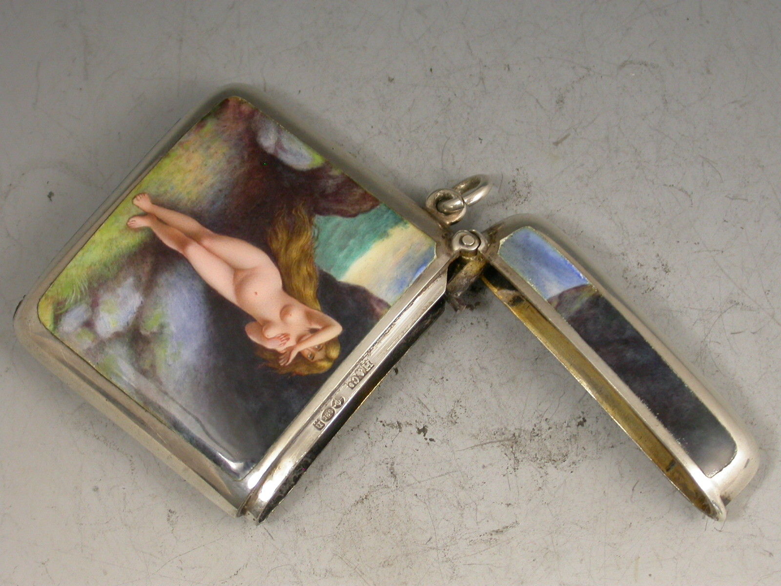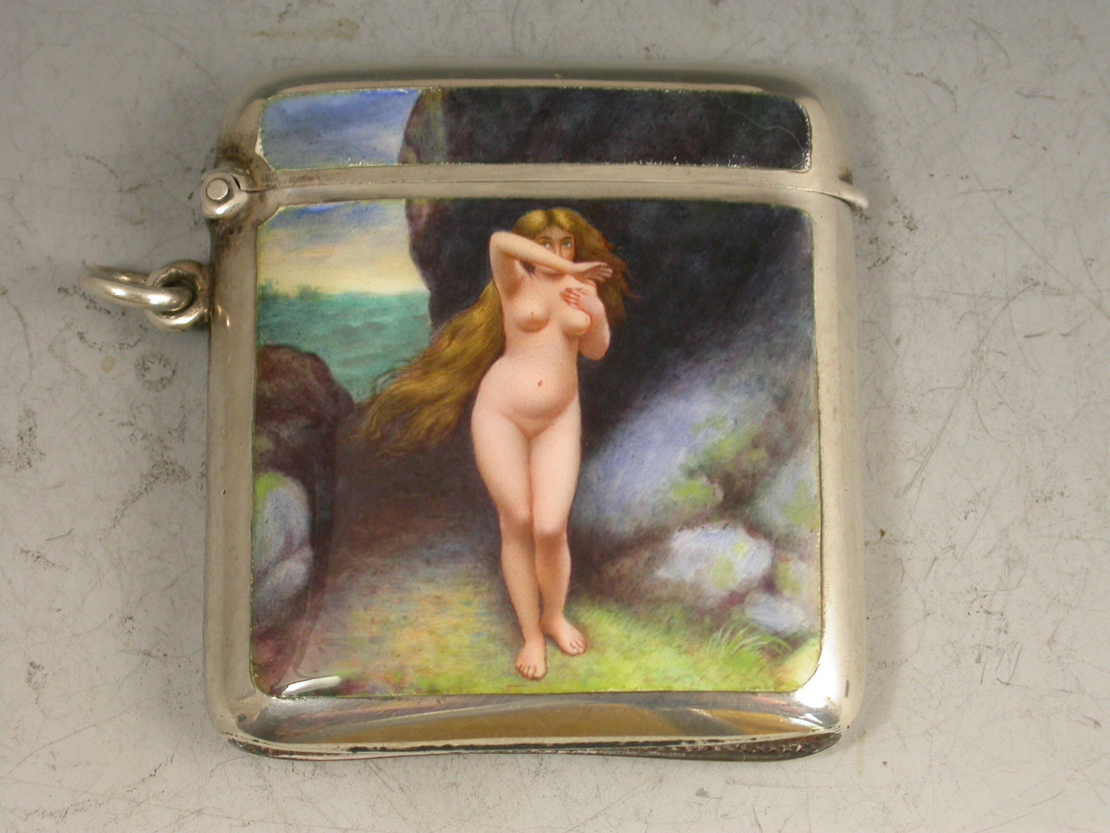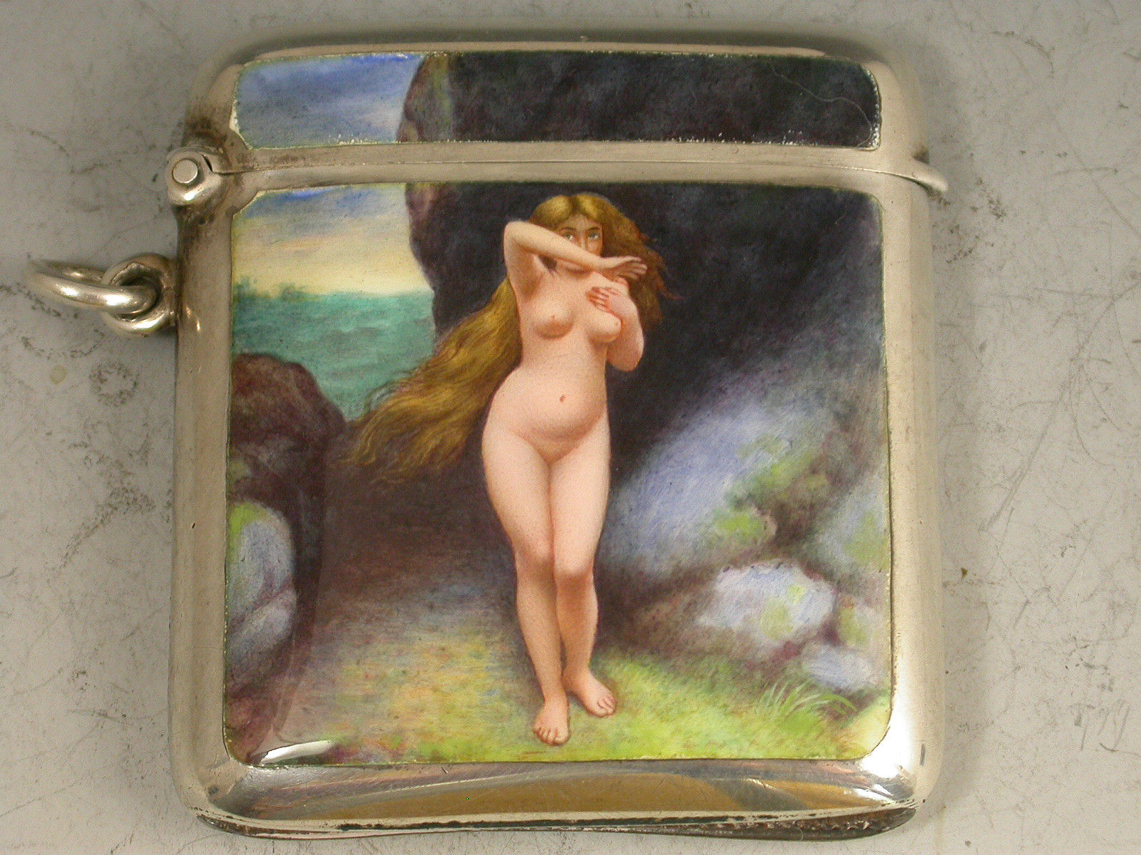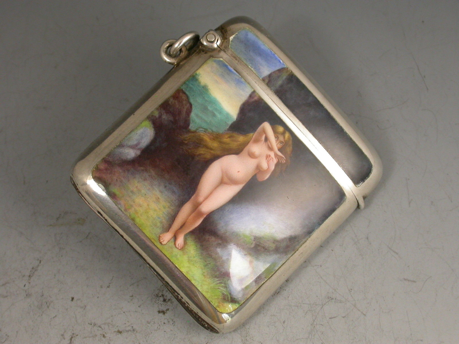 A fine quality early 20th century silver Vesta Case of curved rounded rectangular form with hinged flip-top lid and attached suspension ring. The cover with enameled scene depicting Andromeda.