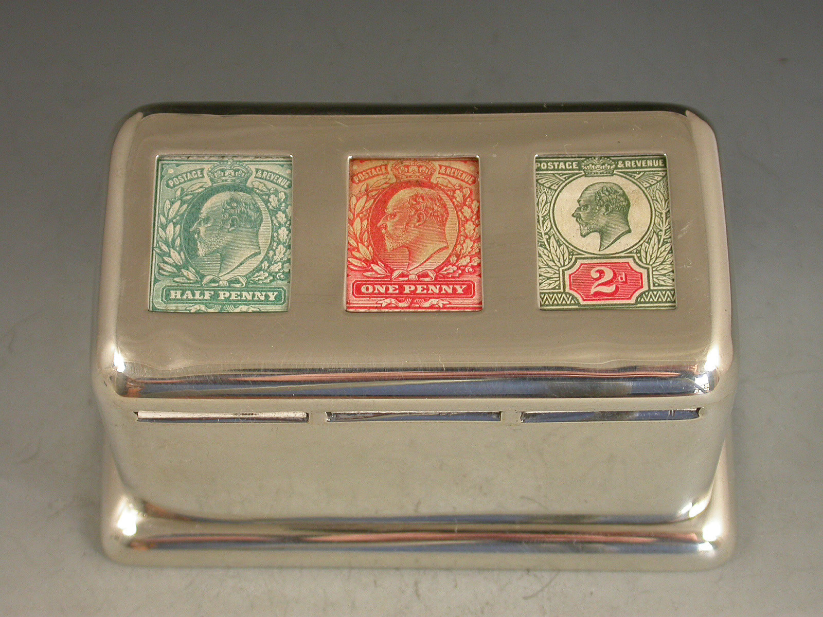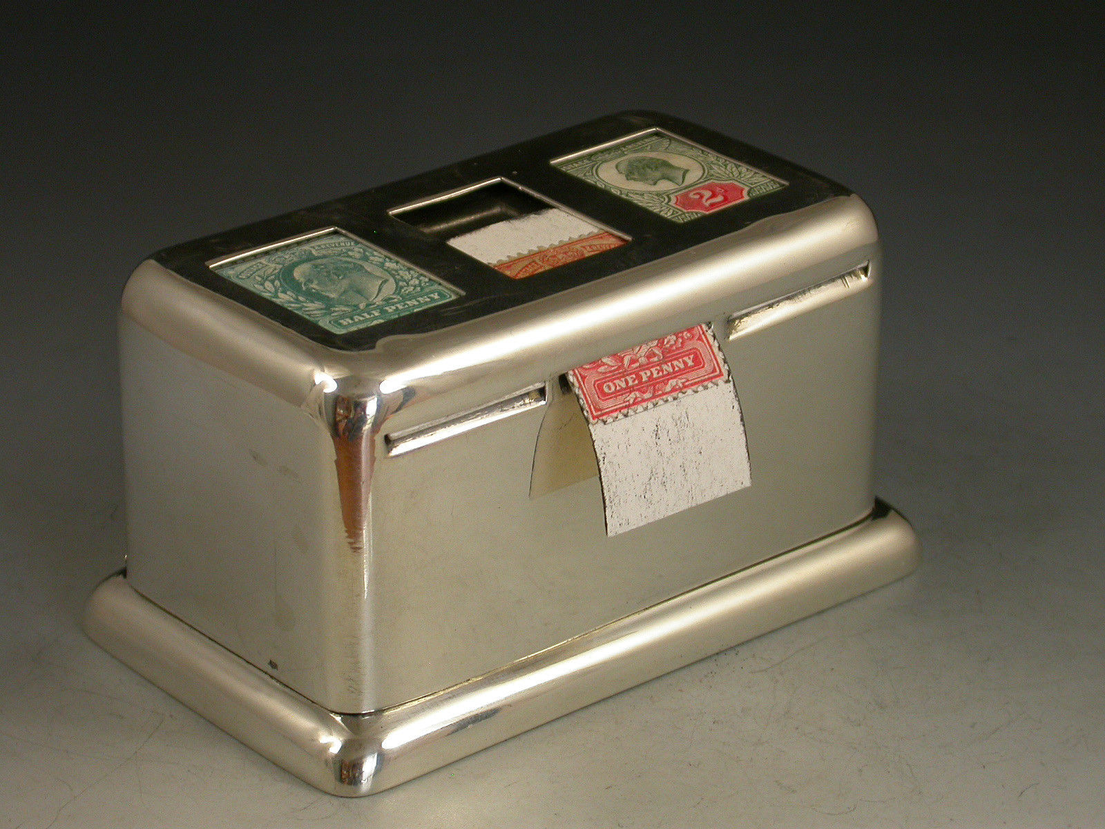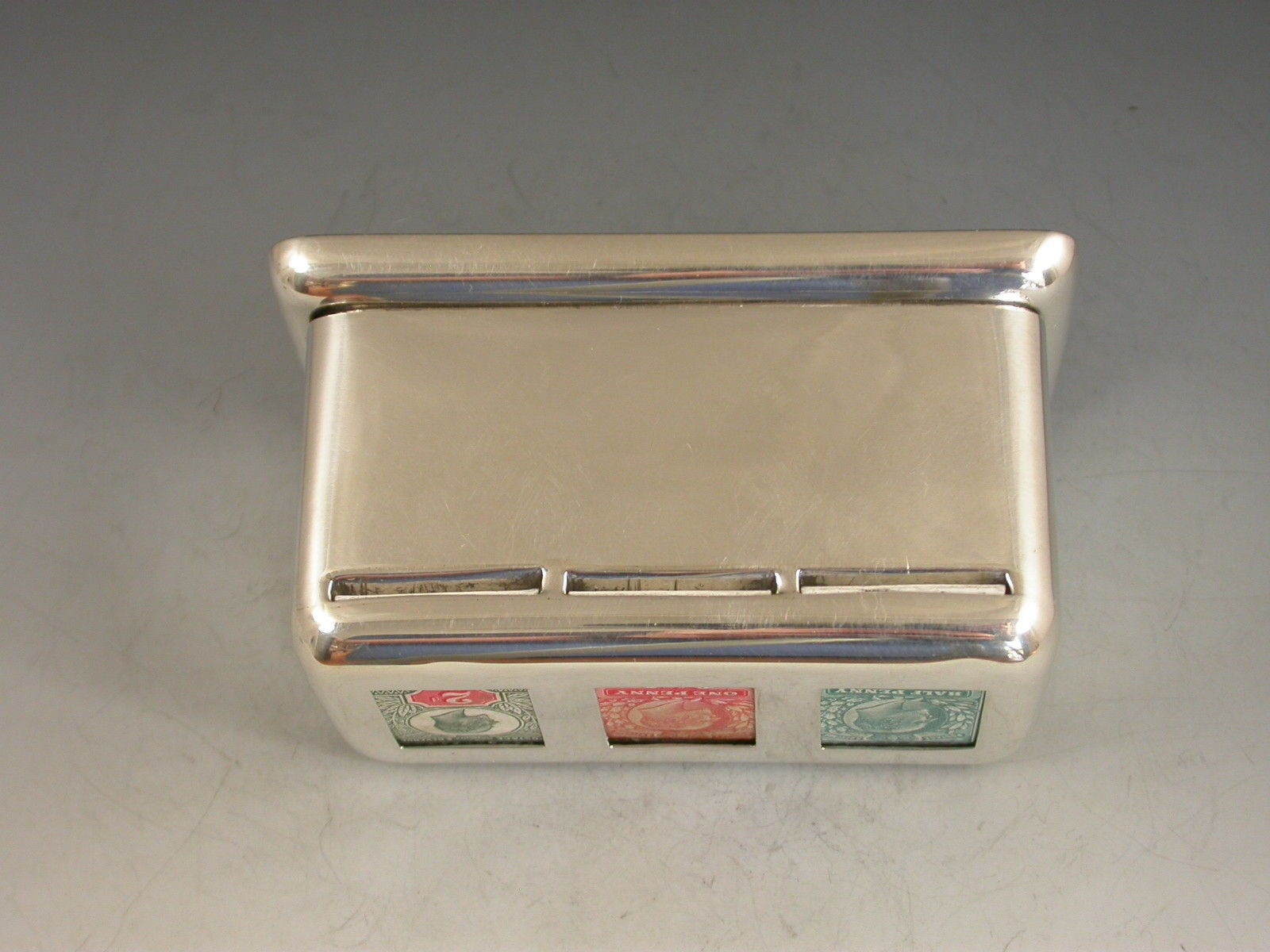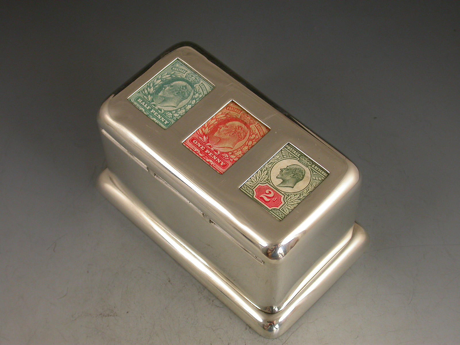 A rare large Edwardian silver triple coil dispenser Stamp Box of curved rectangualr form on pedestal base, the hinged box opening to reveal three gilded compartments that would of held coils of stamps dispensed through slots in the lid. The three windows to the lid now holding single Edwardian half penny, one penny and two penny stamps.
