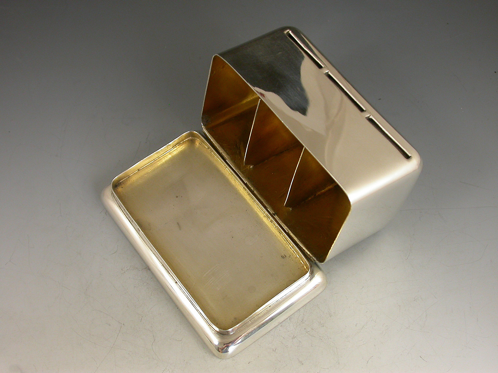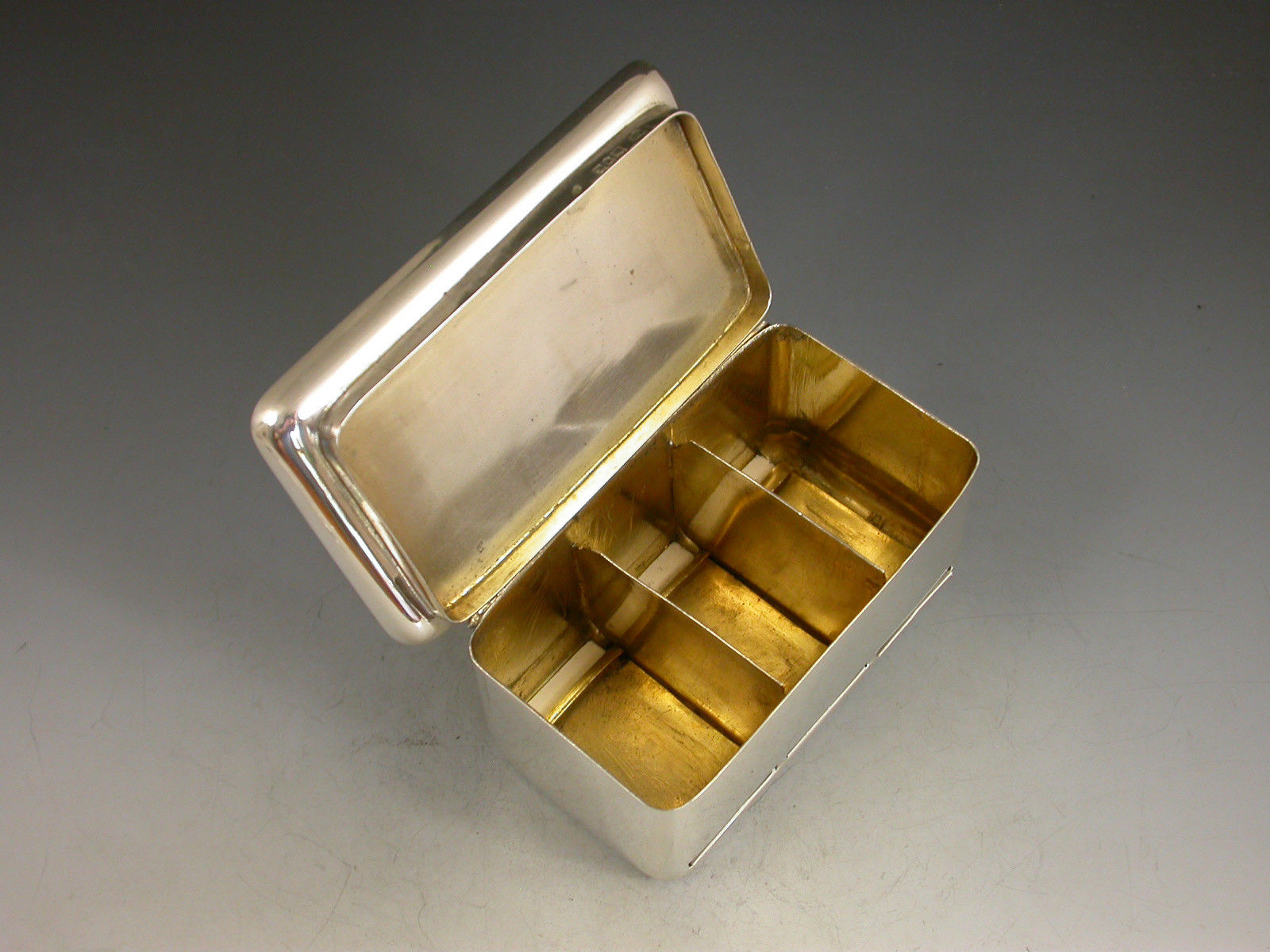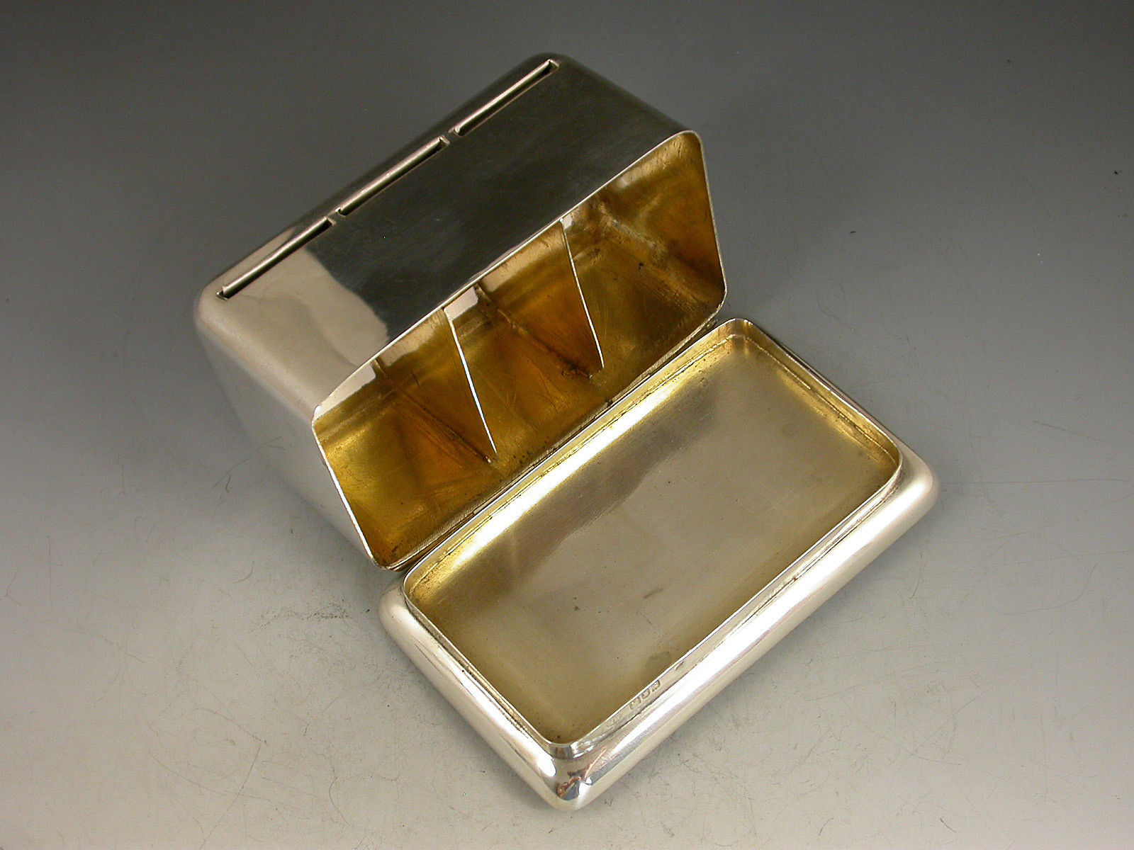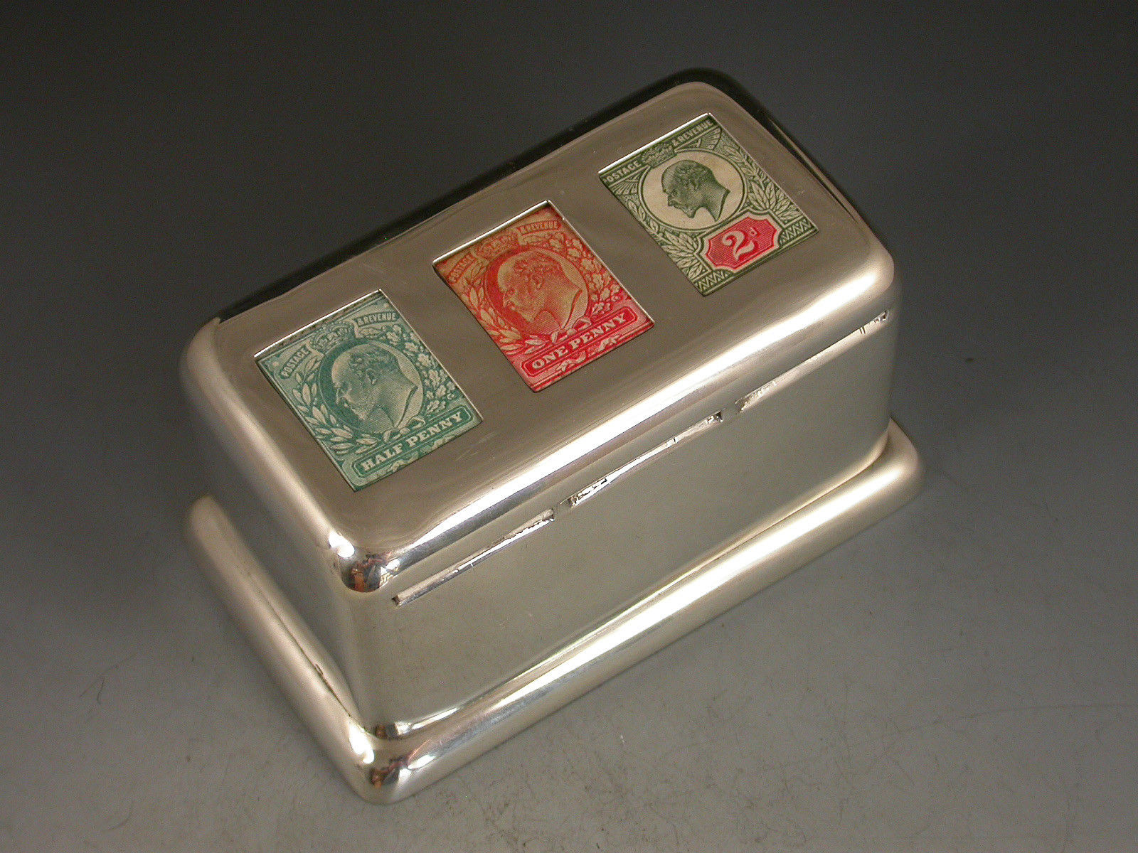 A rare large Edwardian silver triple coil dispenser Stamp Box of curved rectangualr form on pedestal base, the hinged box opening to reveal three gilded compartments that would of held coils of stamps dispensed through slots in the lid. The three windows to the lid now holding single Edwardian half penny, one penny and two penny stamps.