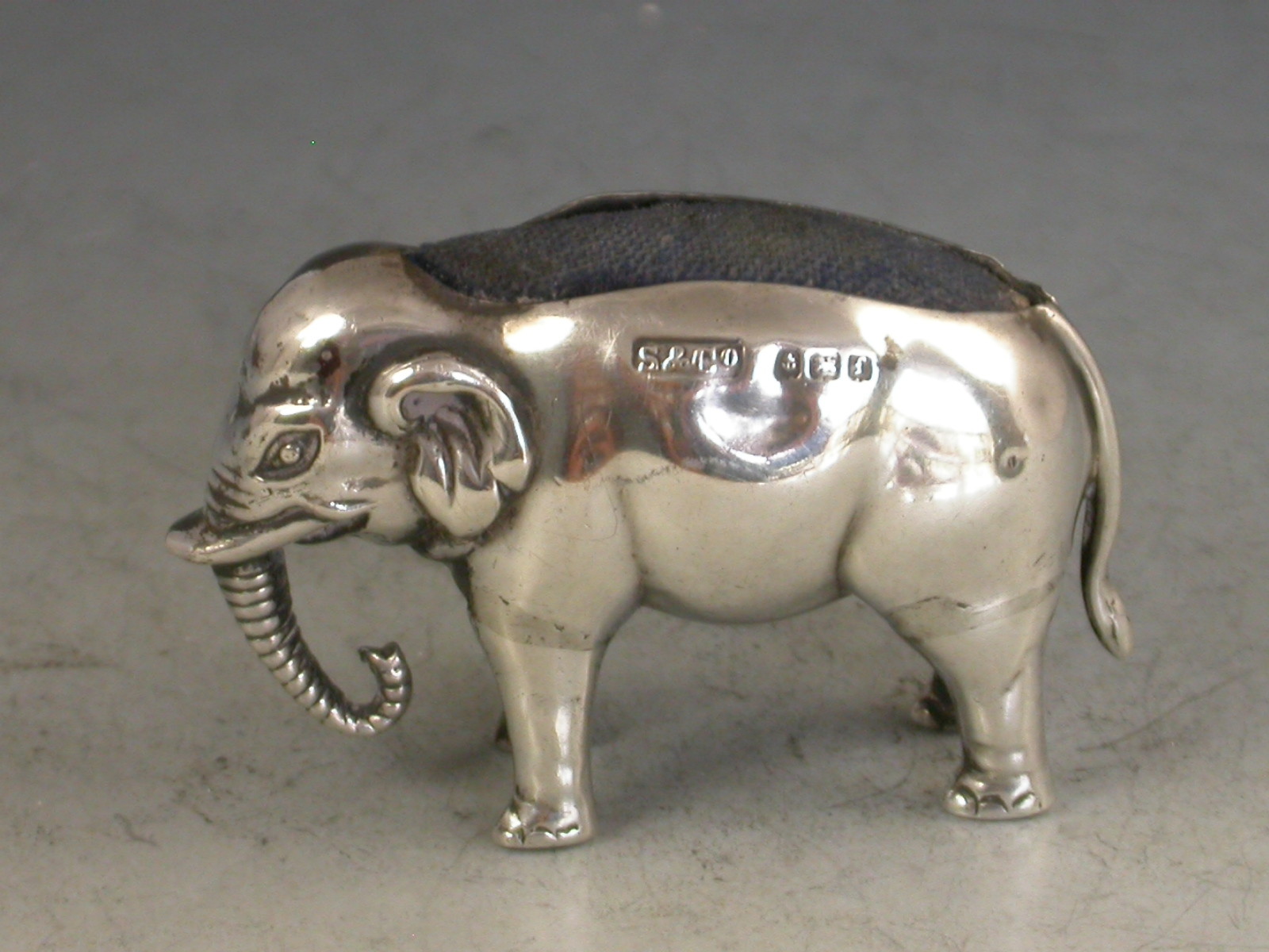 A good Edwardian novelty silver Pin Cushion made in the form of an Elephant.