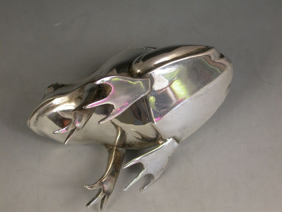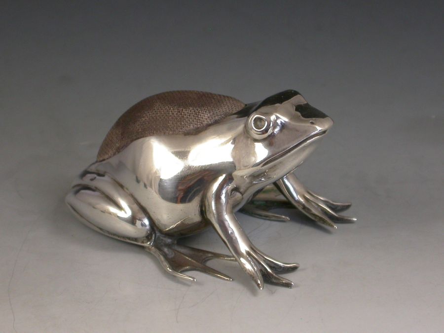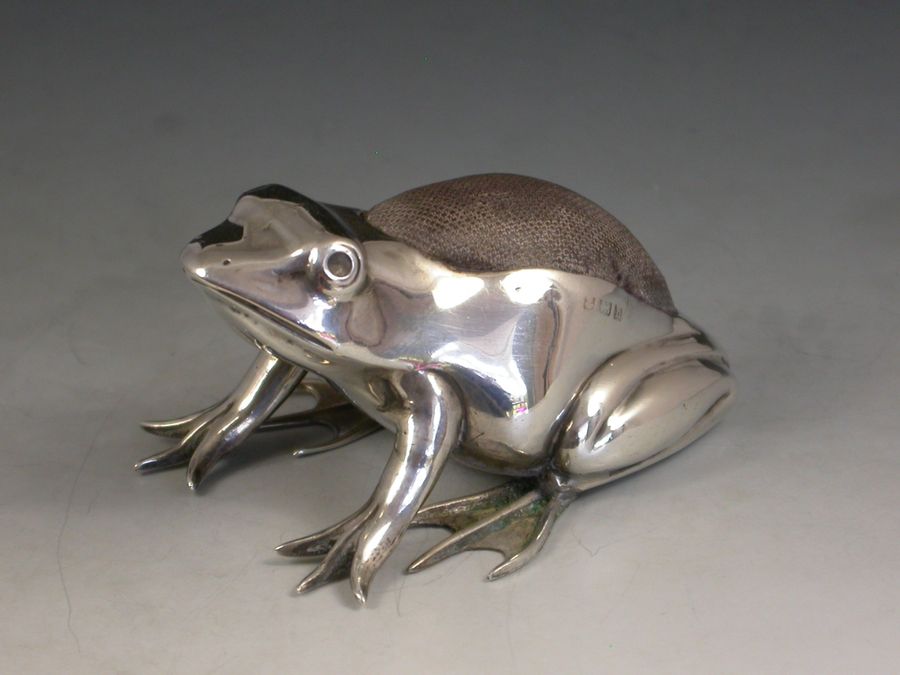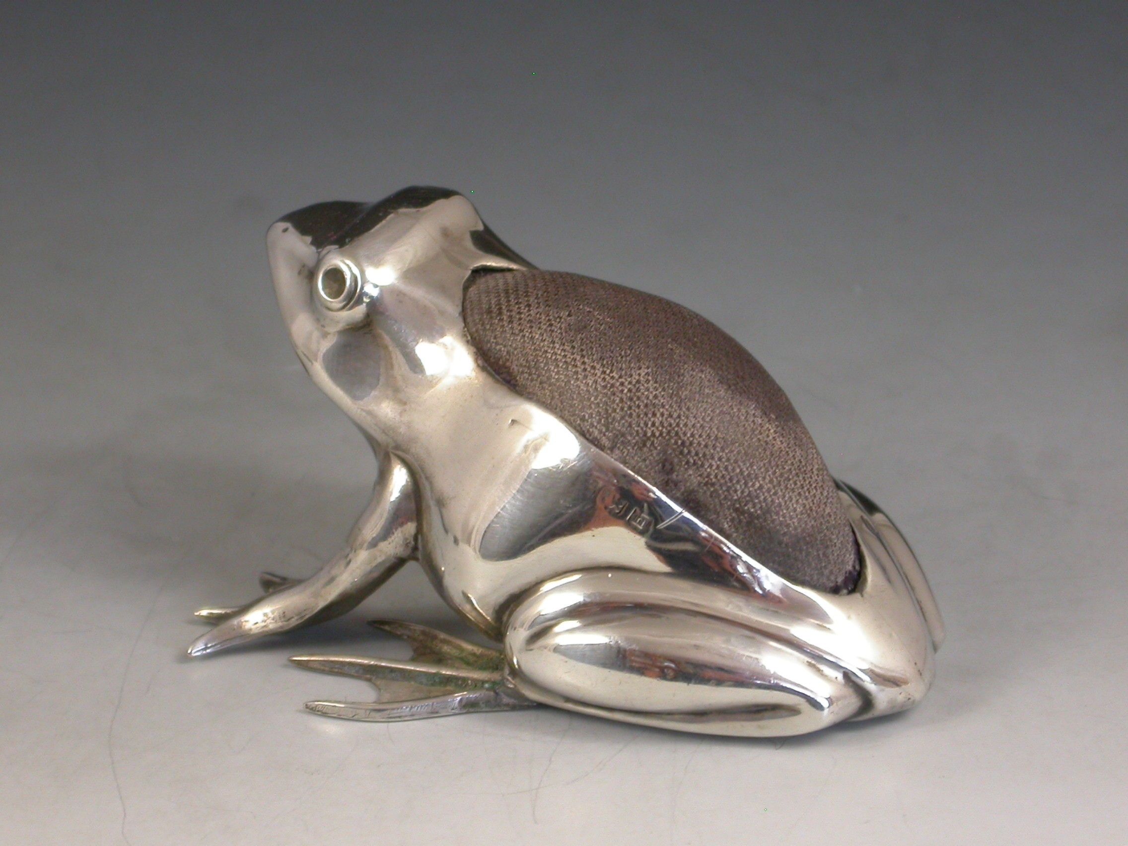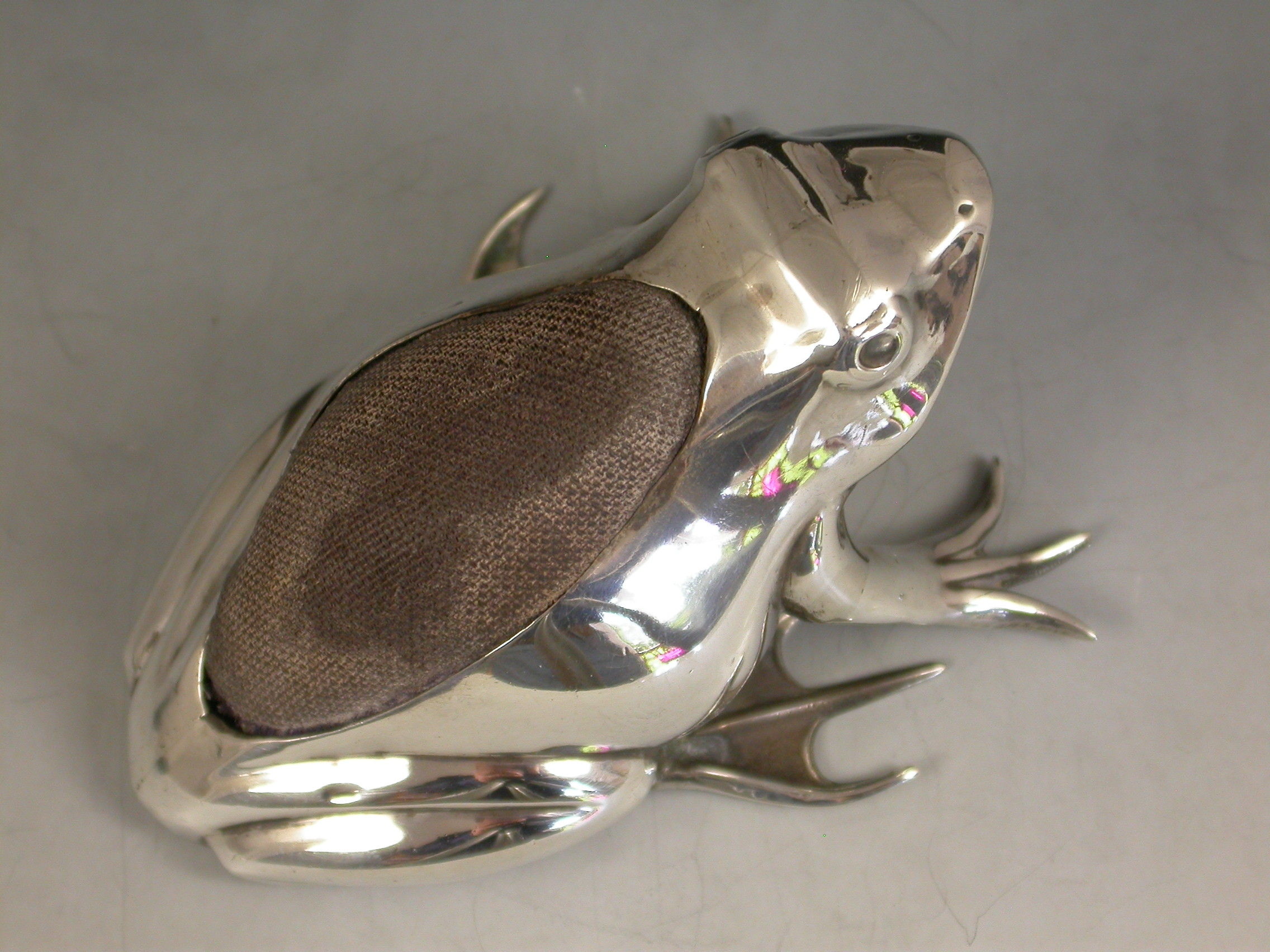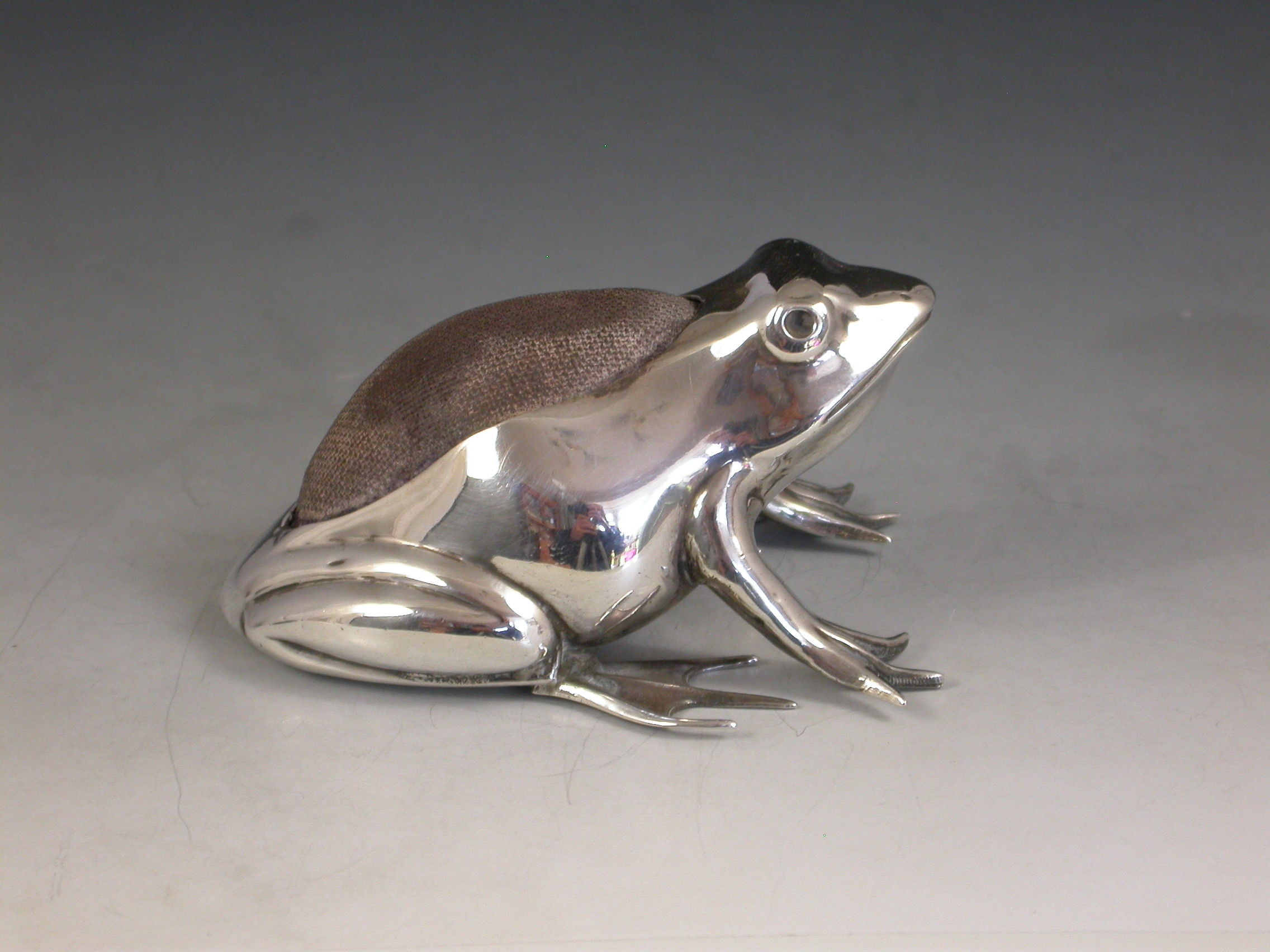 A good Edwardian novelty silver Pin Cushion made in the form of a crouching frog.