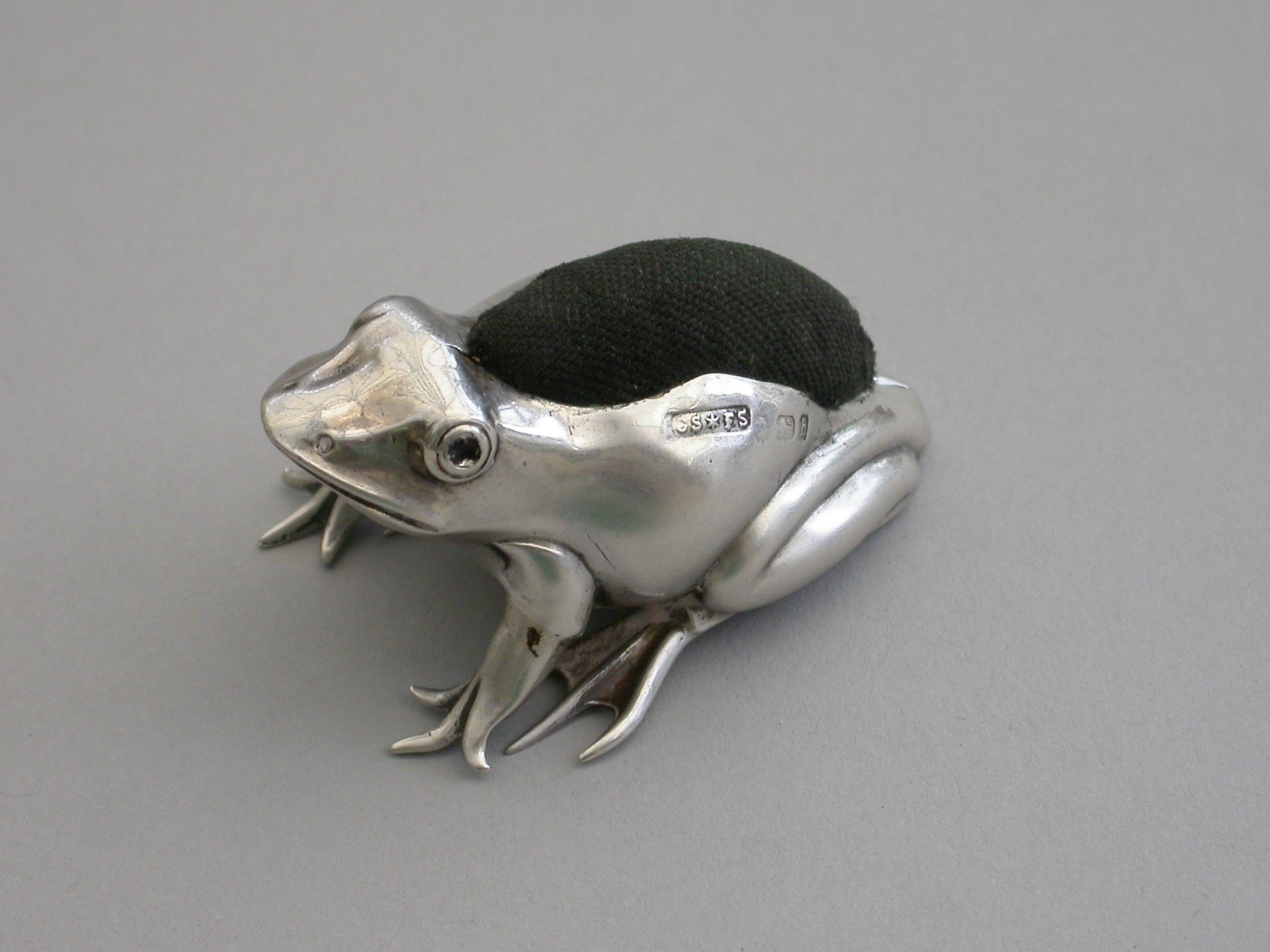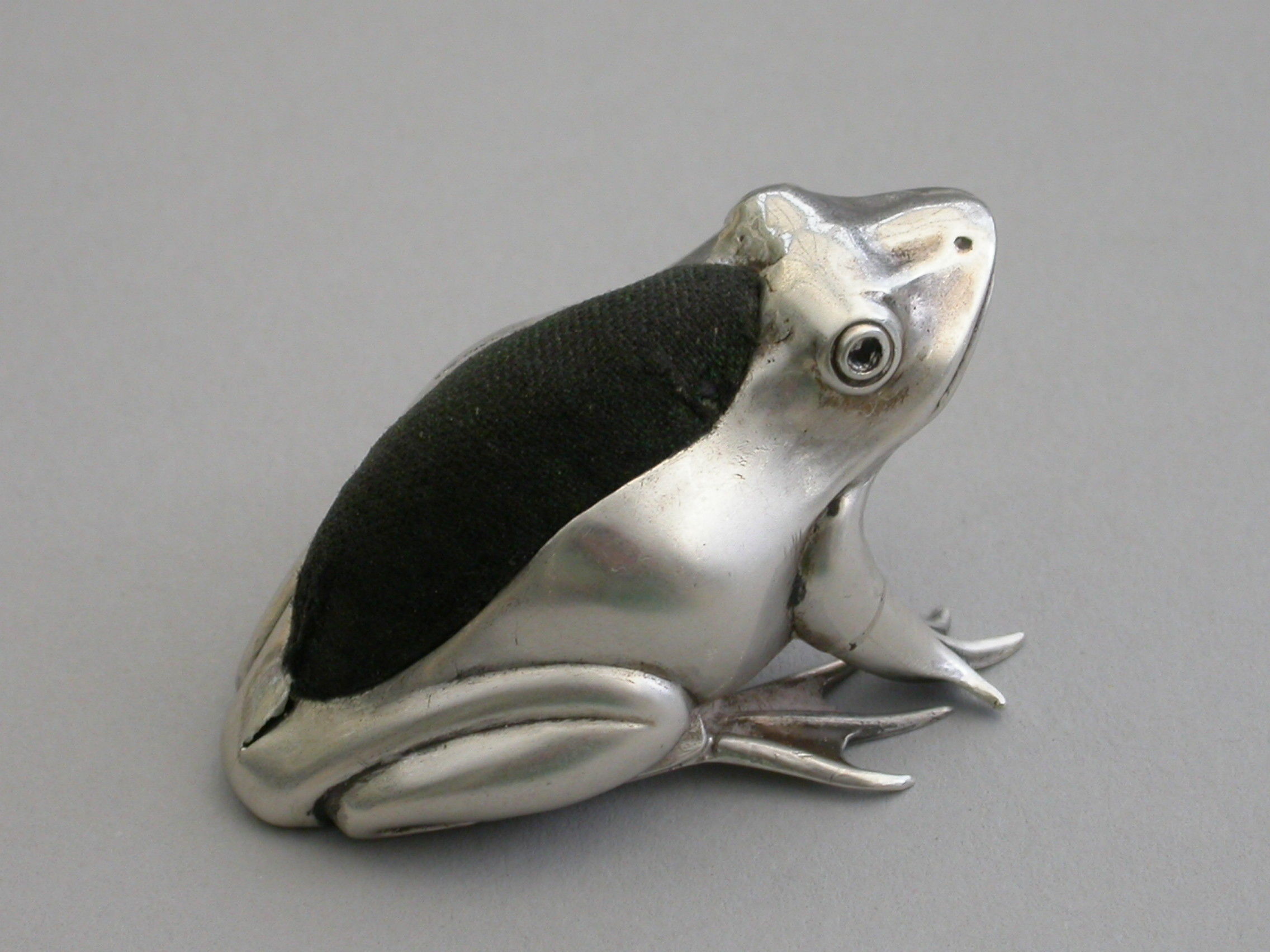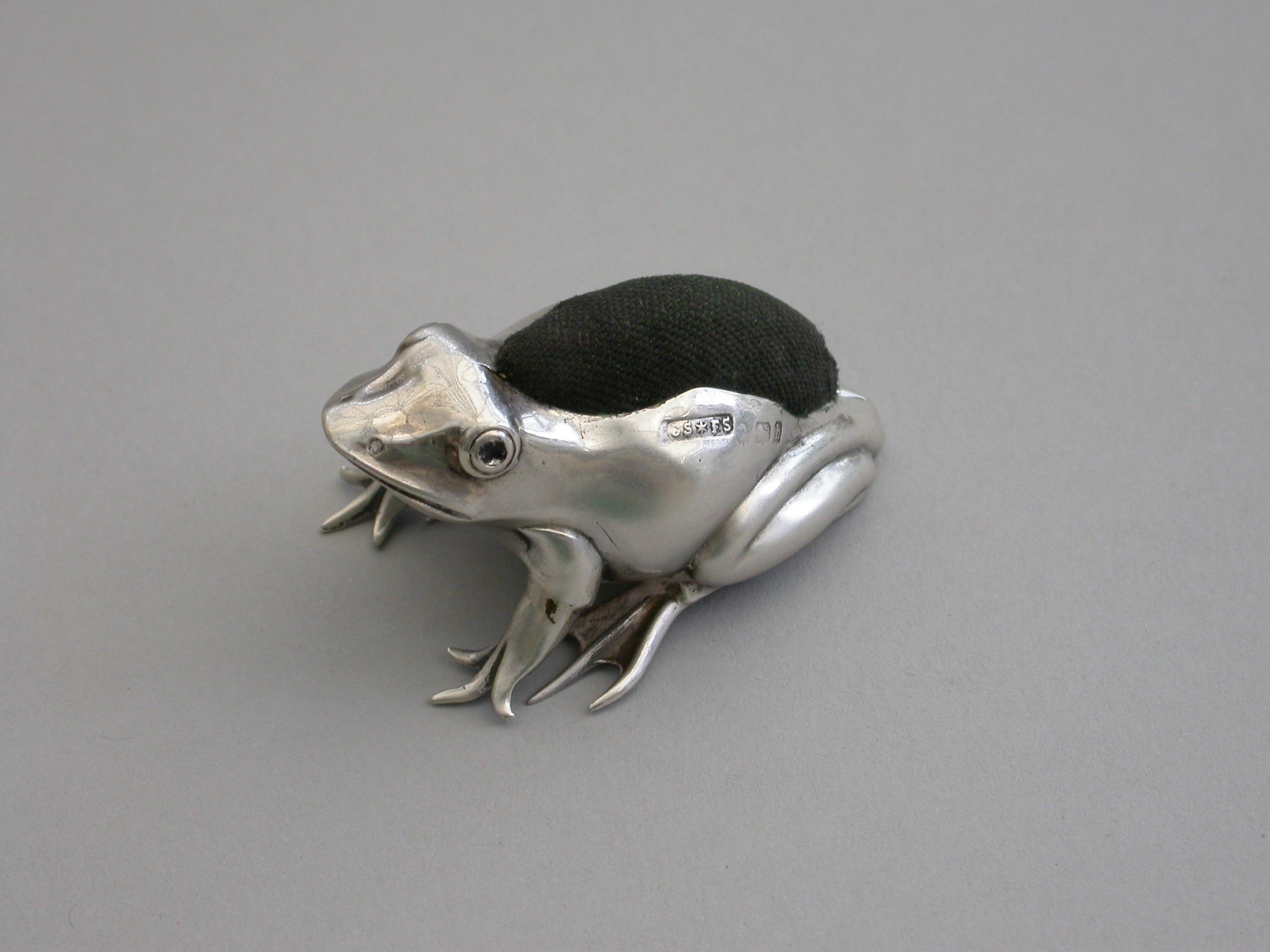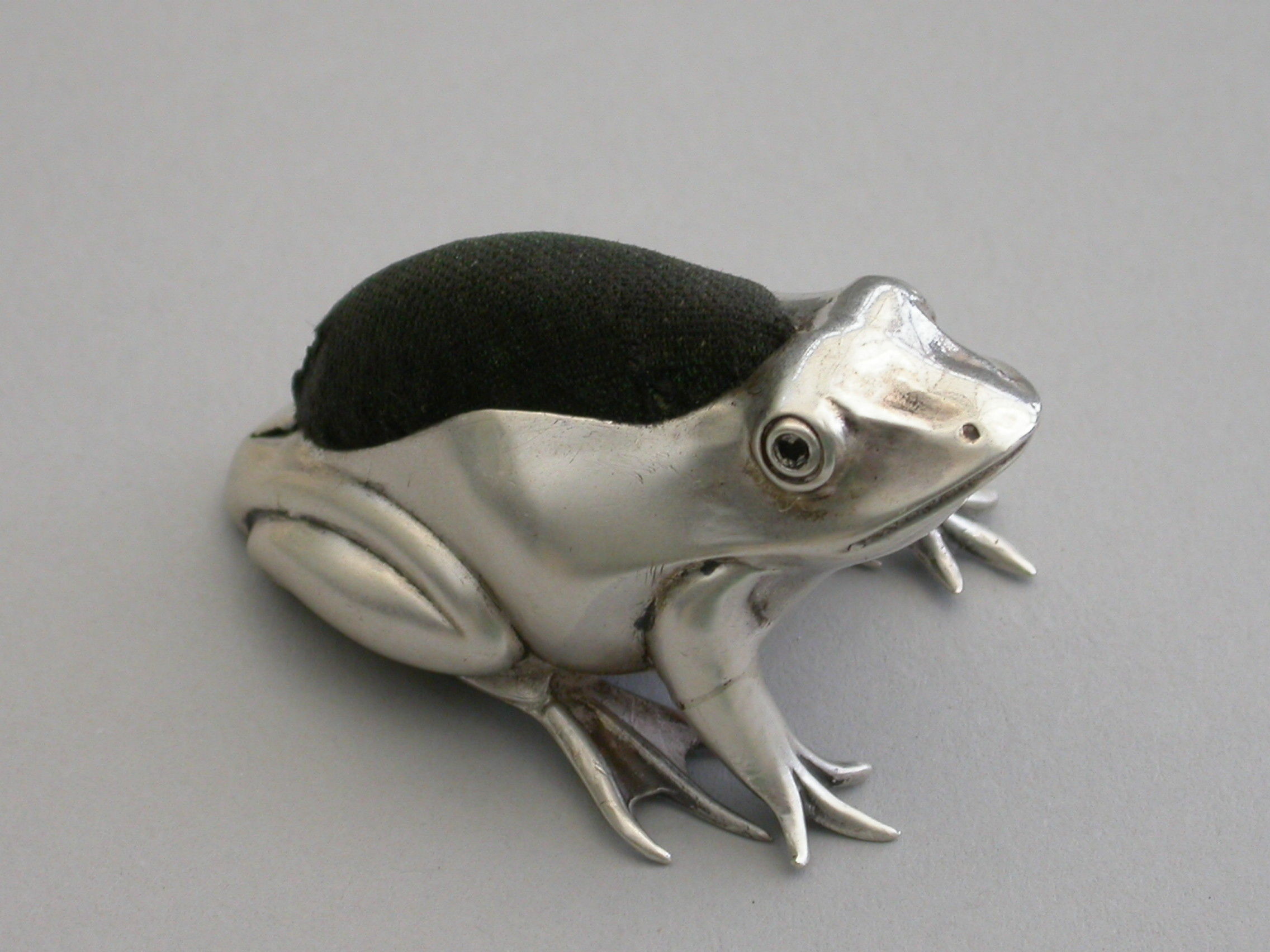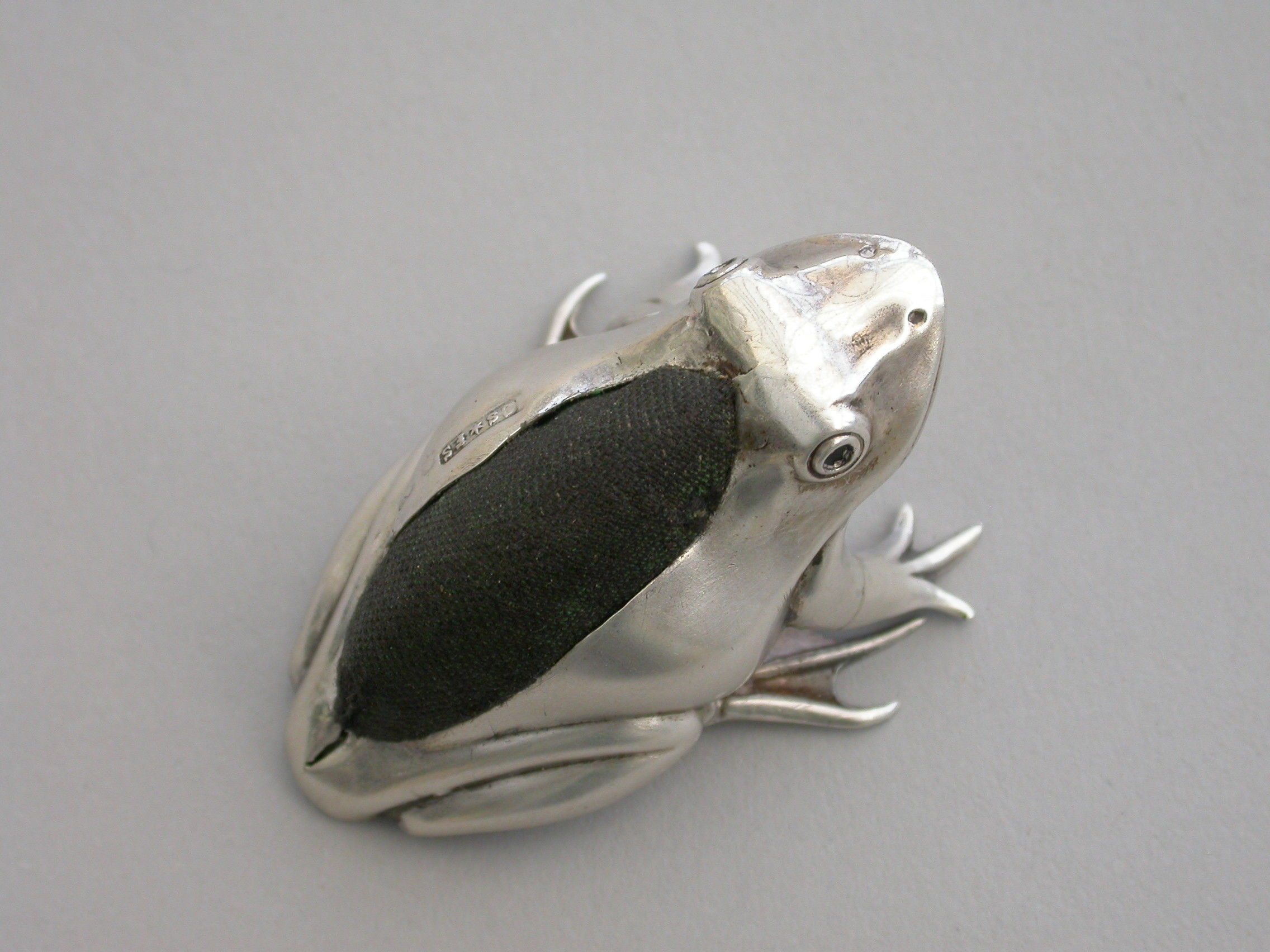 A good Edwardian novelty silver Pin Cushion made in the form of a crouching frog, with original green velvet cushion.