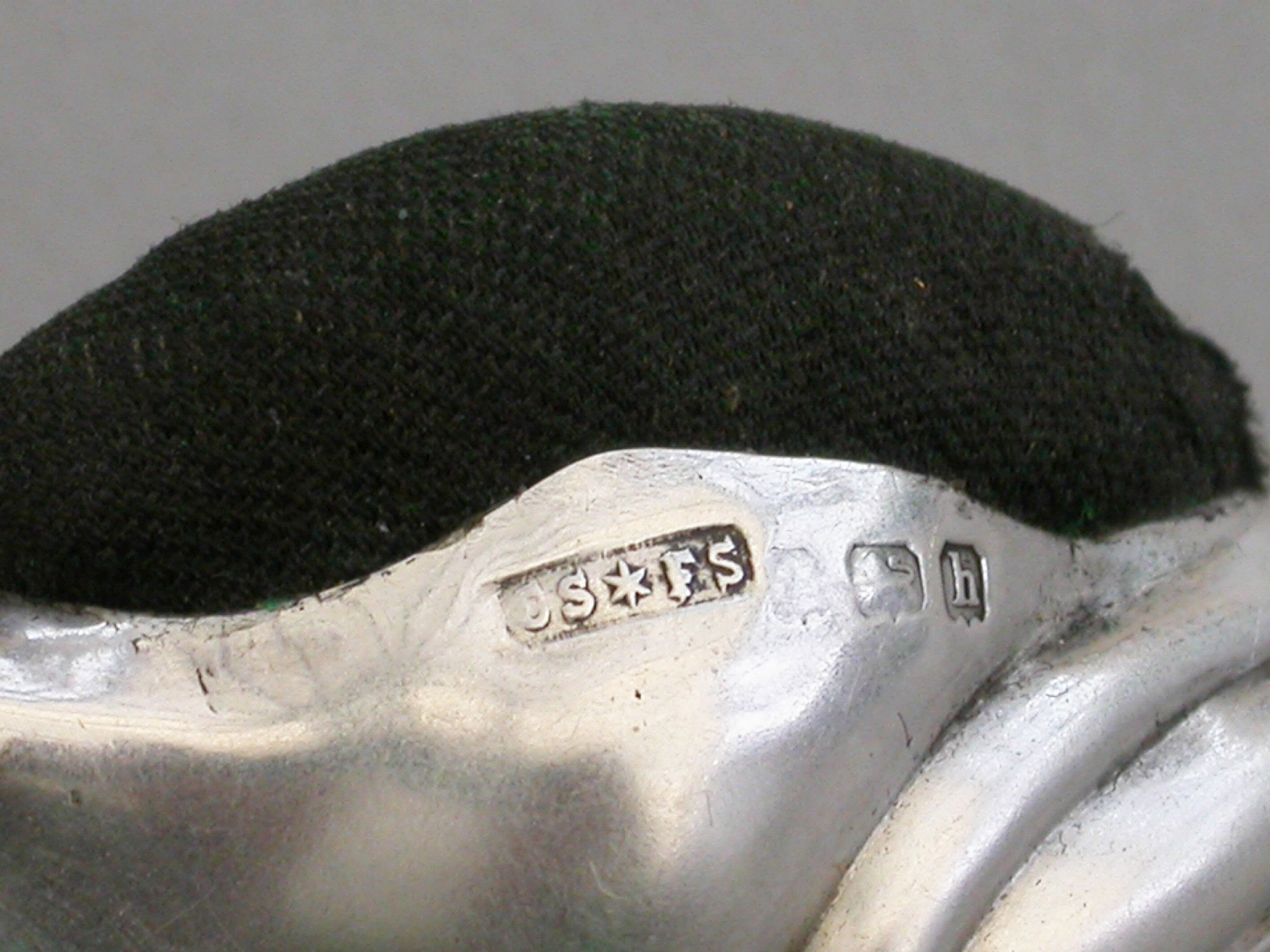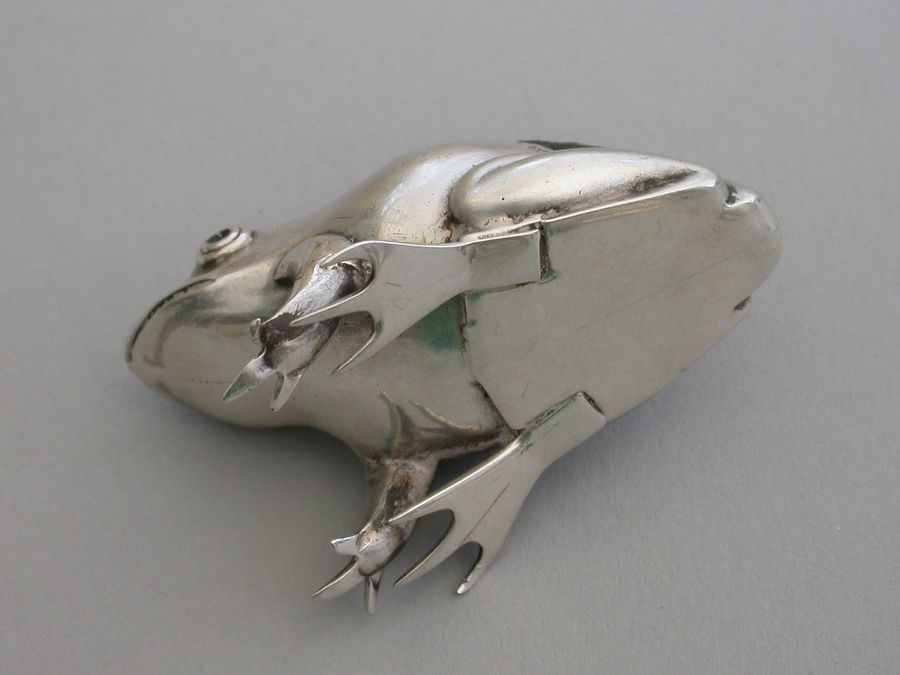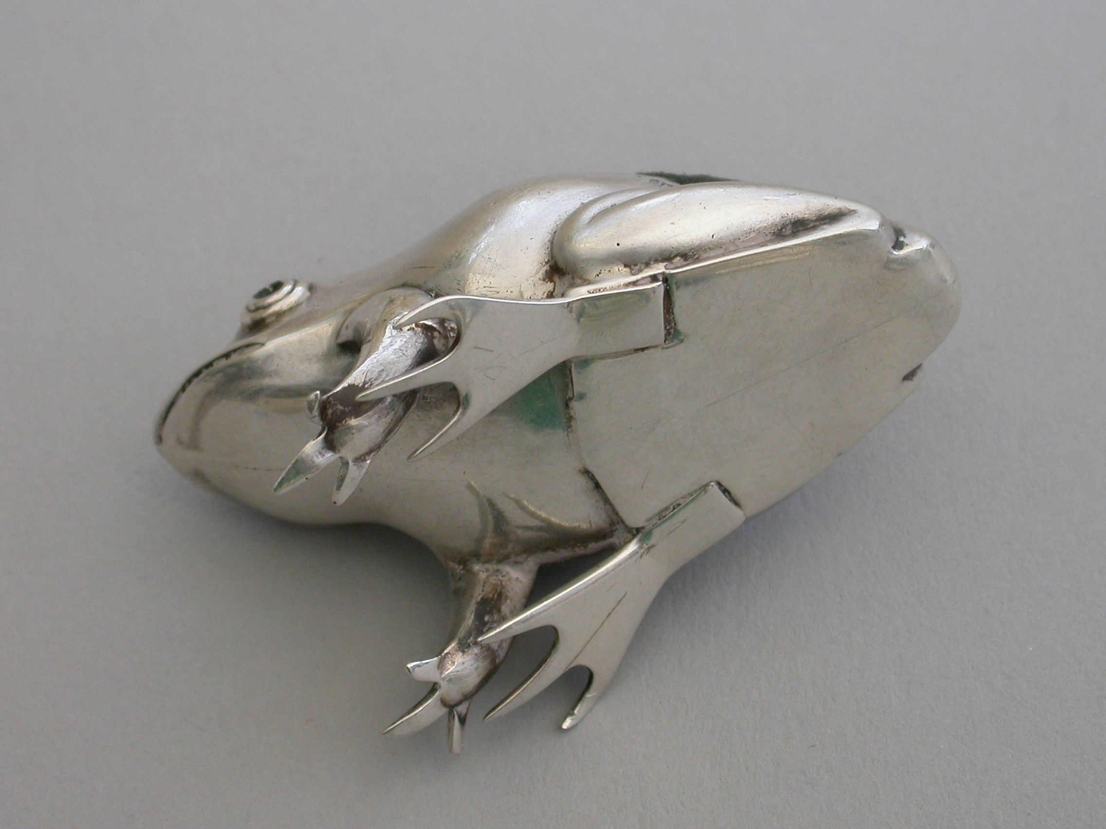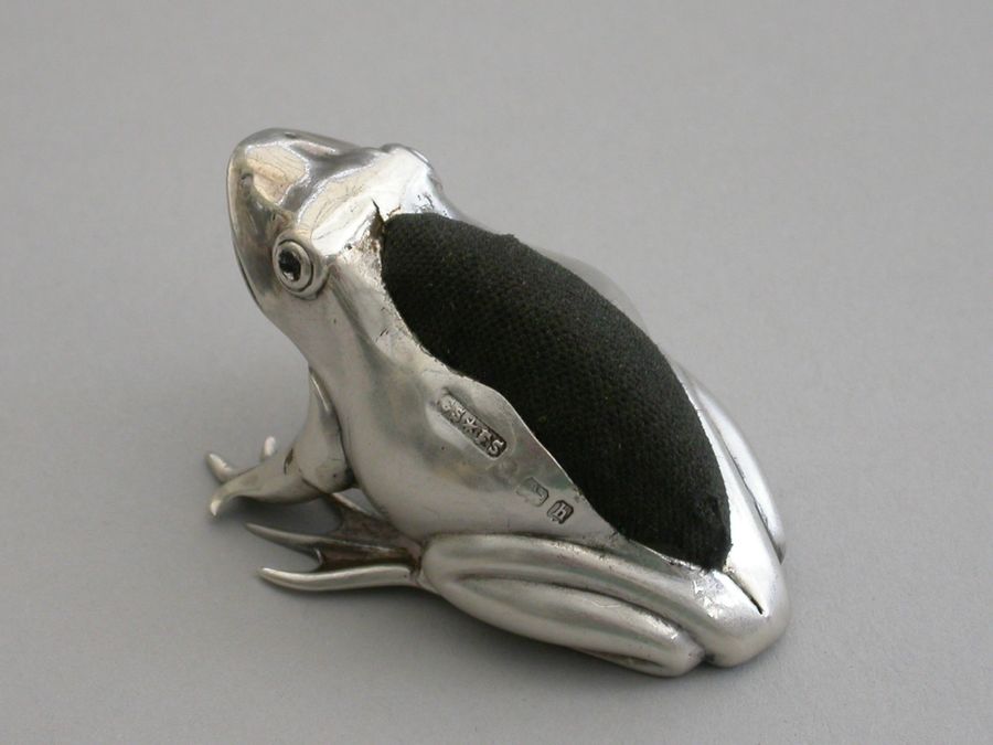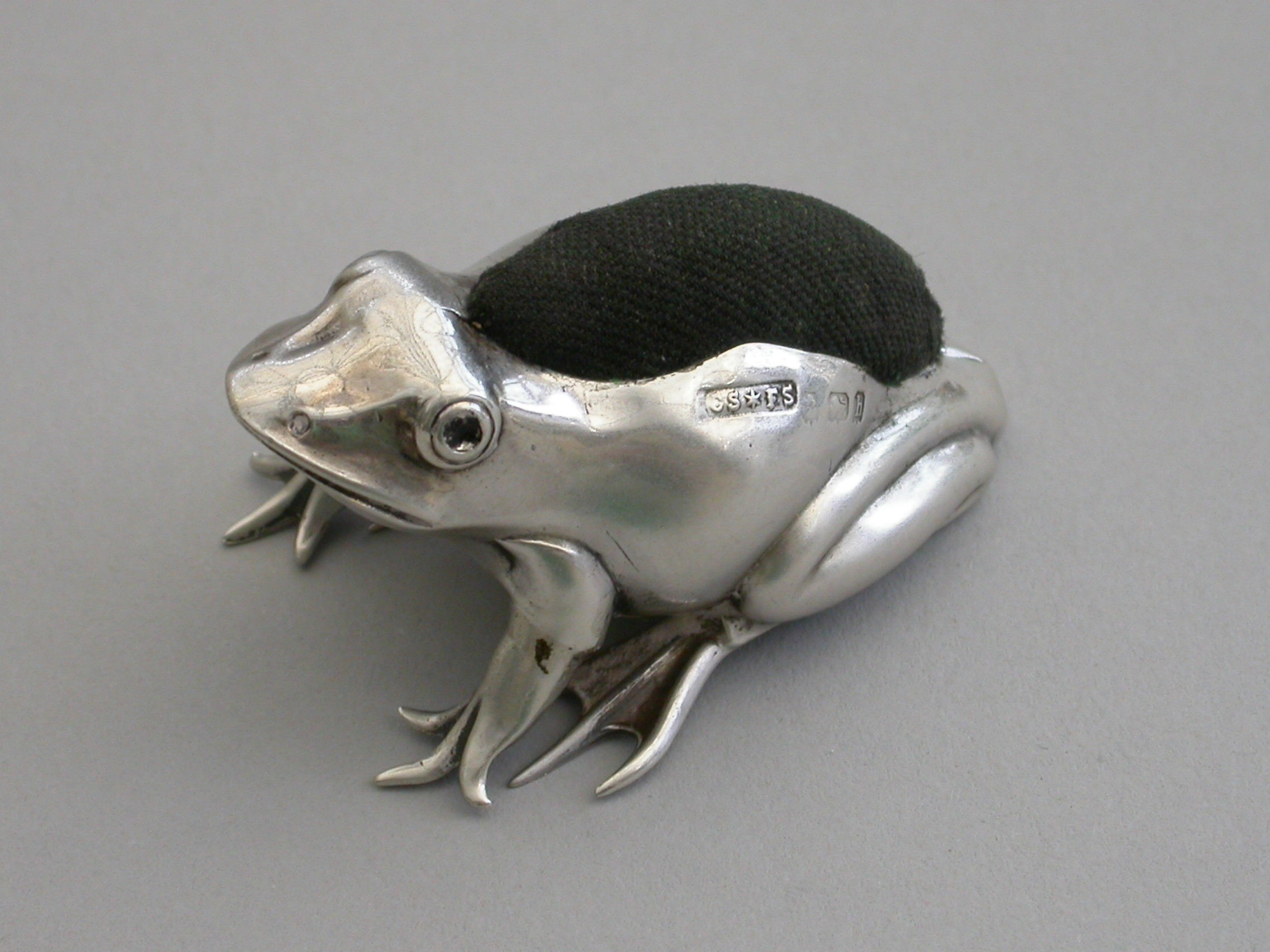 A good Edwardian novelty silver Pin Cushion made in the form of a crouching frog, with original green velvet cushion.