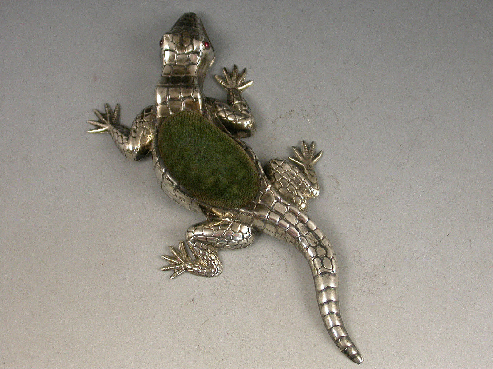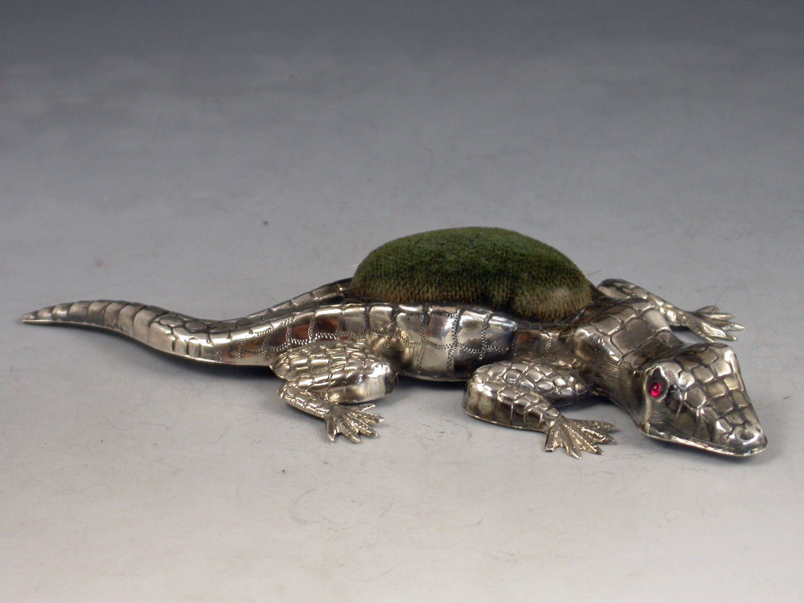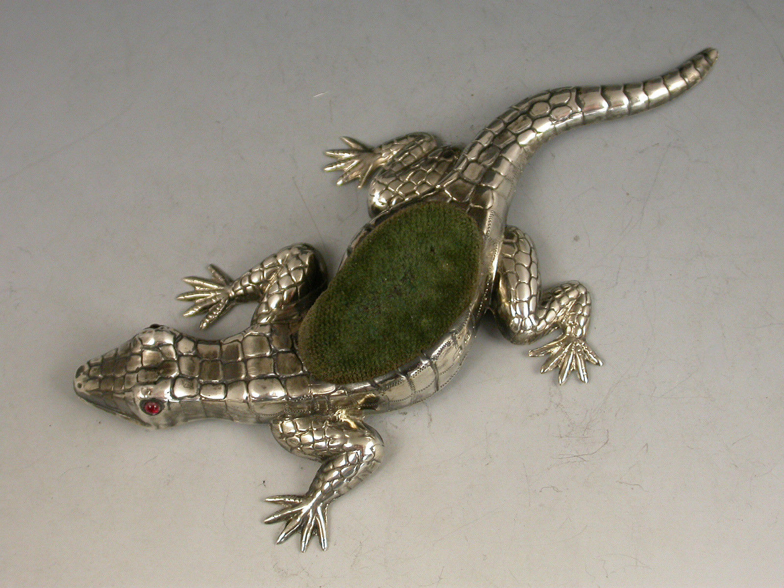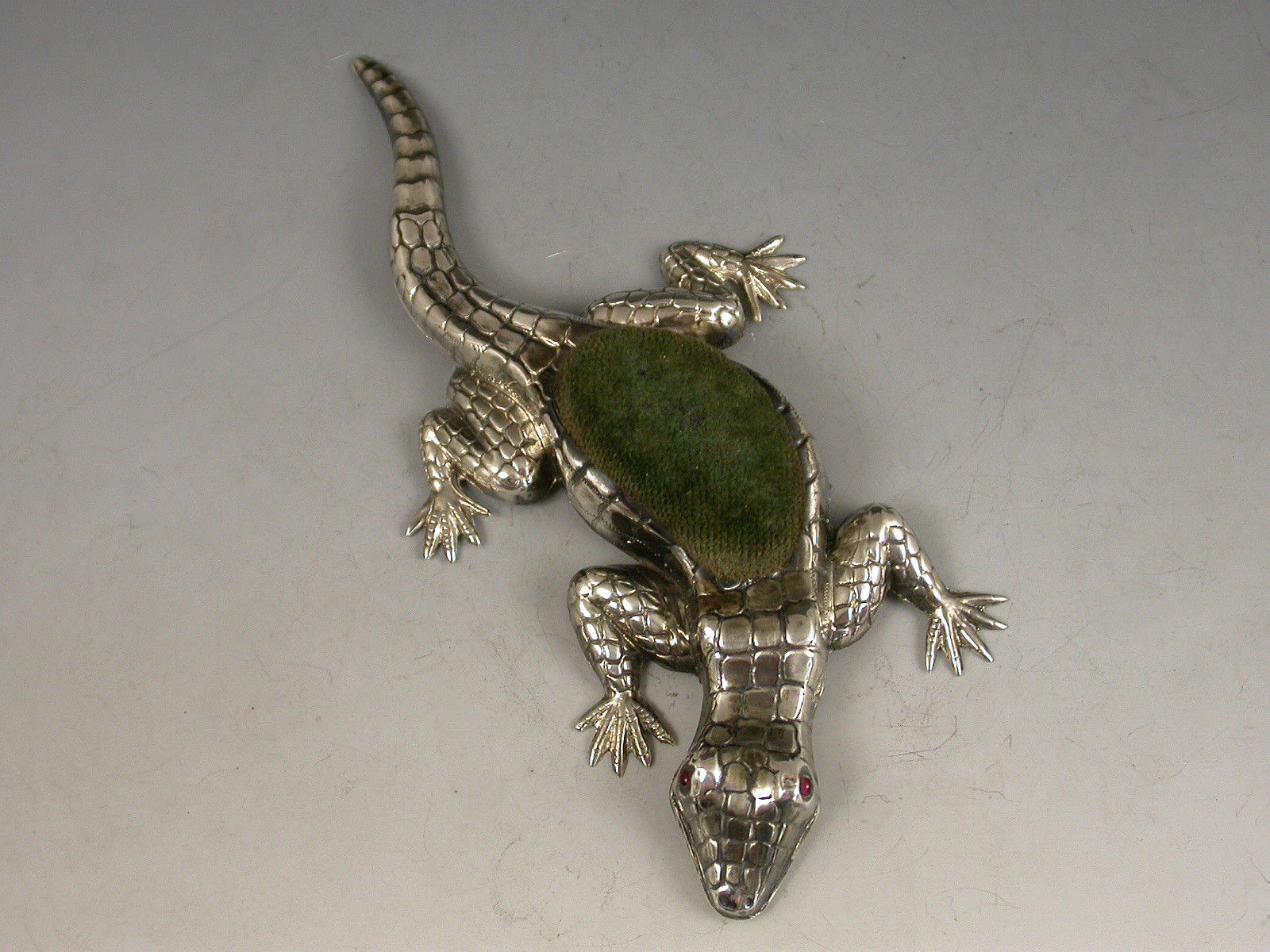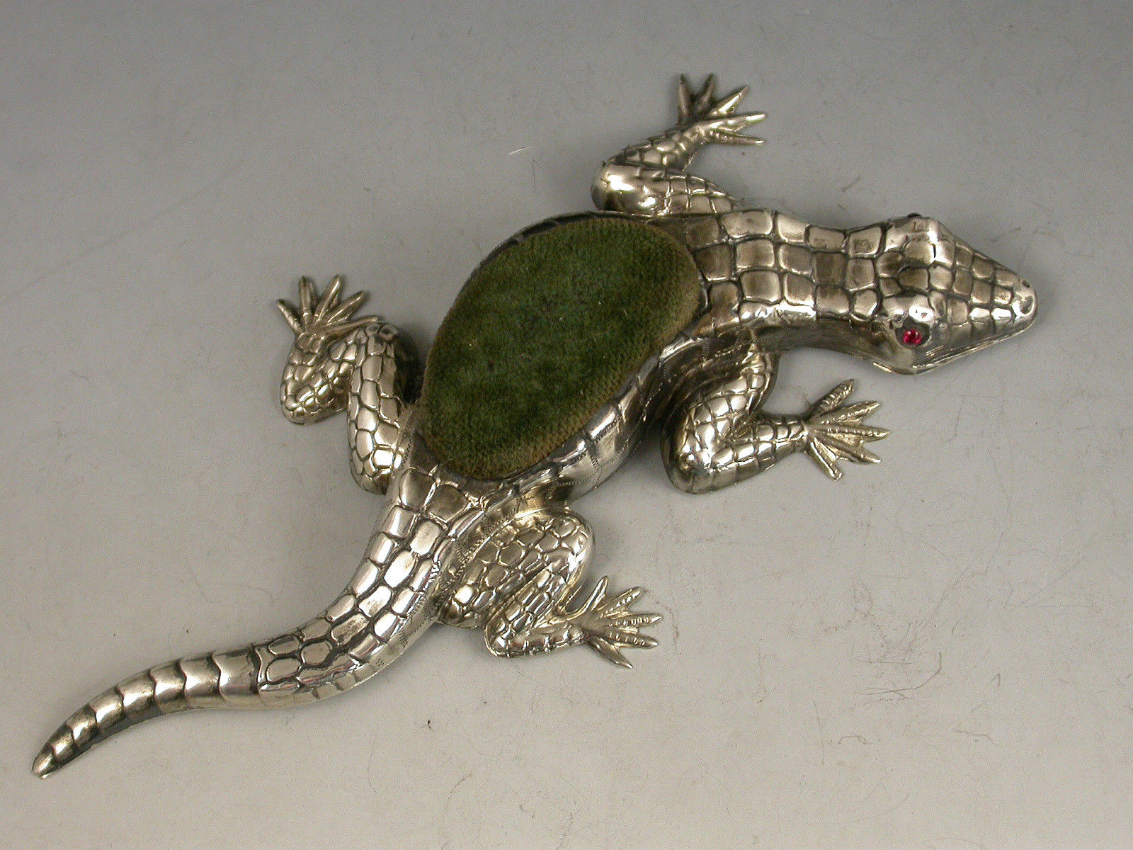 A rare Edwardian novelty silver Pin Cushion made in the form of a Lizard, with ruby red glass eyes and original green velvet cushion.