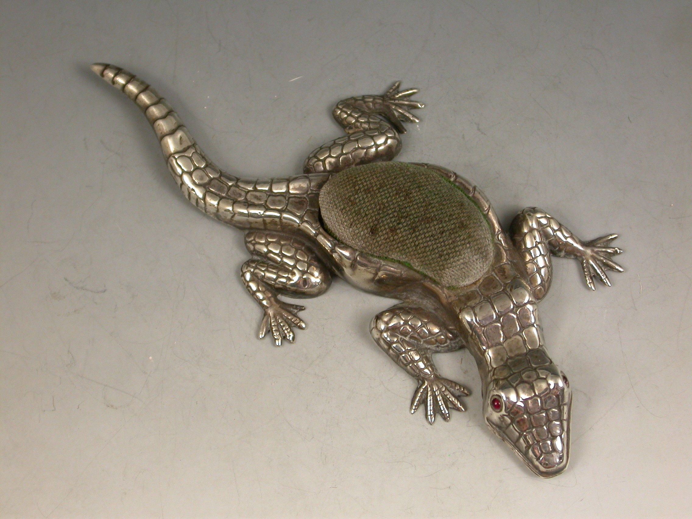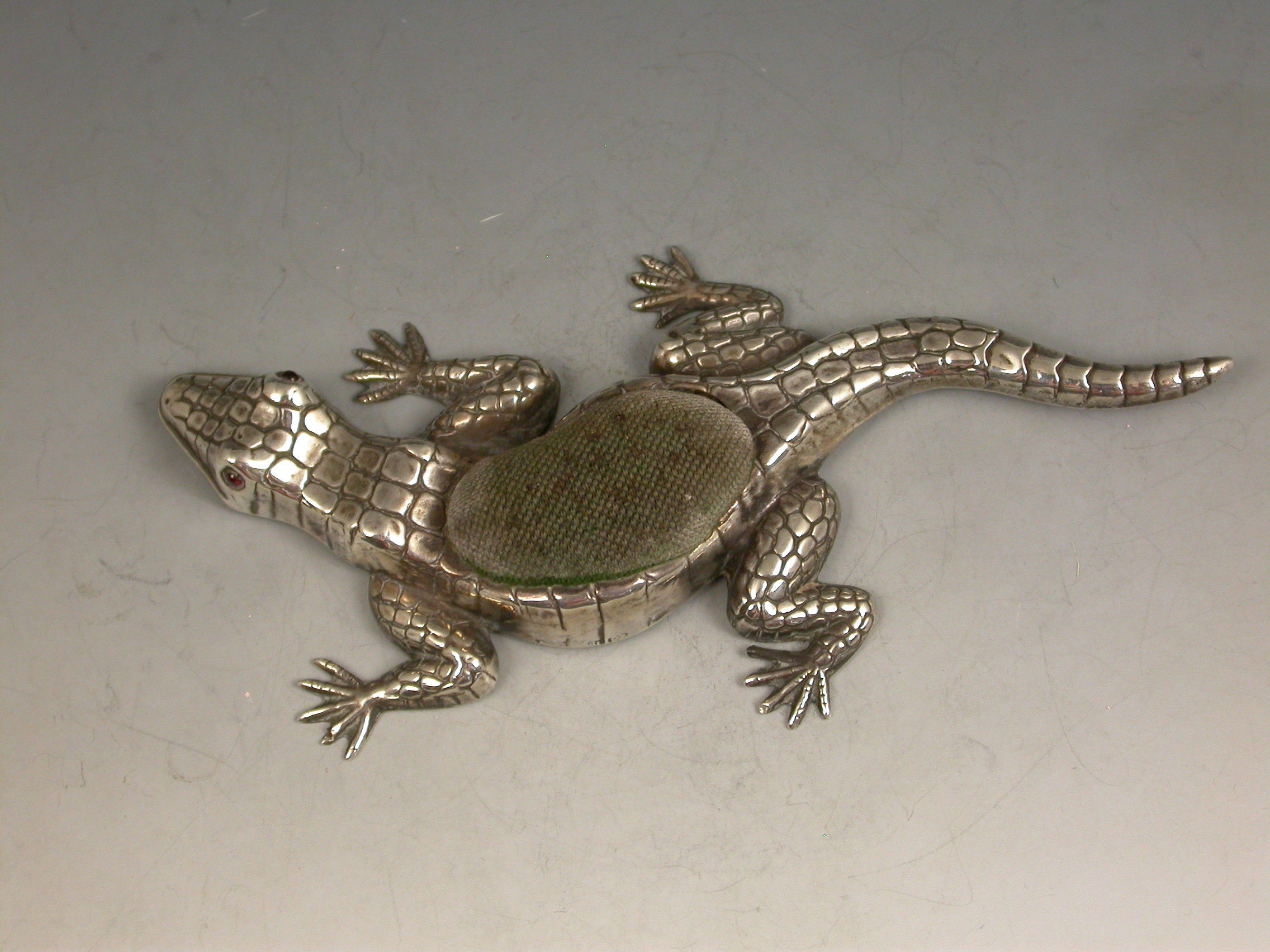 A rare Edwardian novelty silver Pin Cushion made in the form of a Lizard, with ruby red glass eyes and original green velvet cushion (faded).