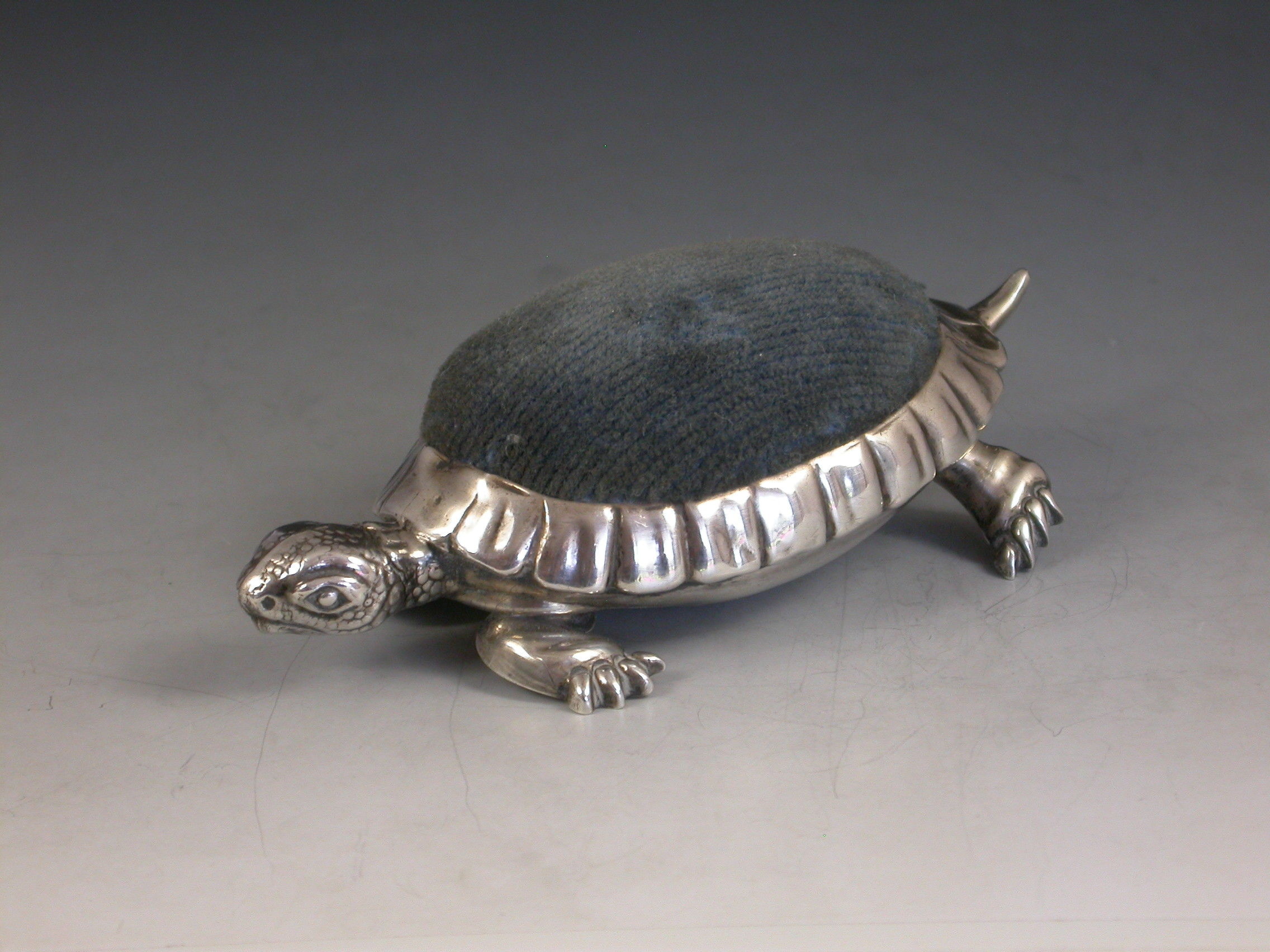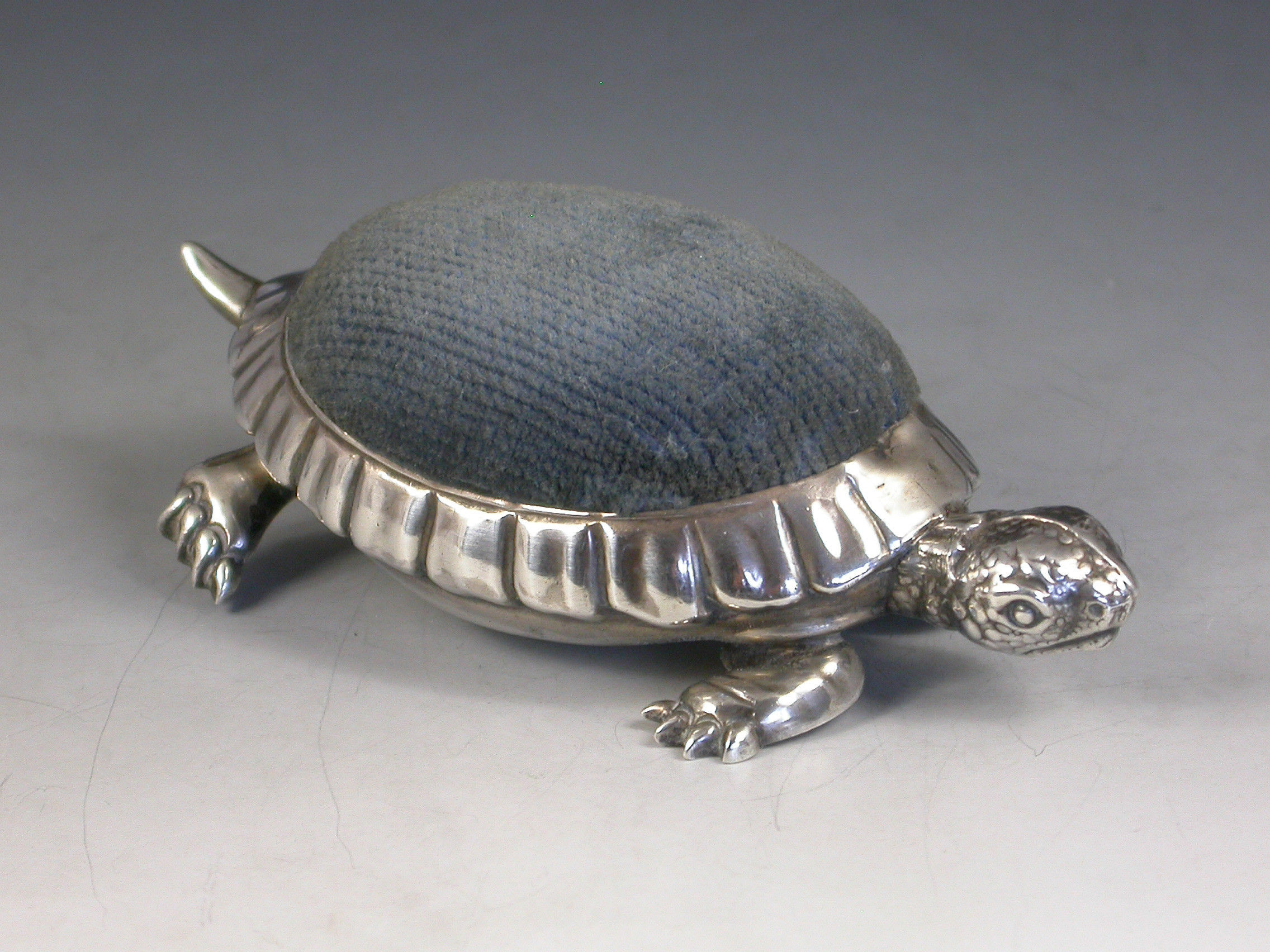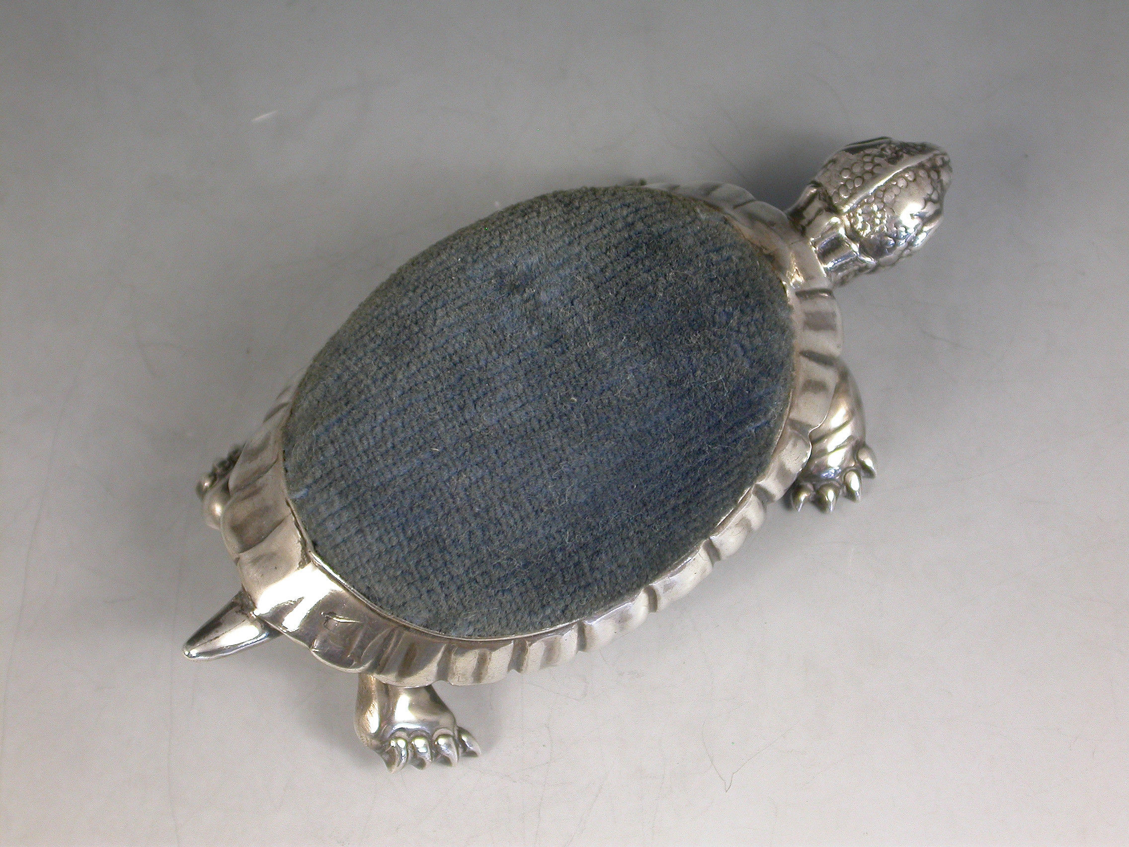A rare Edwardian novelty silver Pin Cushion made in the form of a Tortoise with blue velvet cushion.