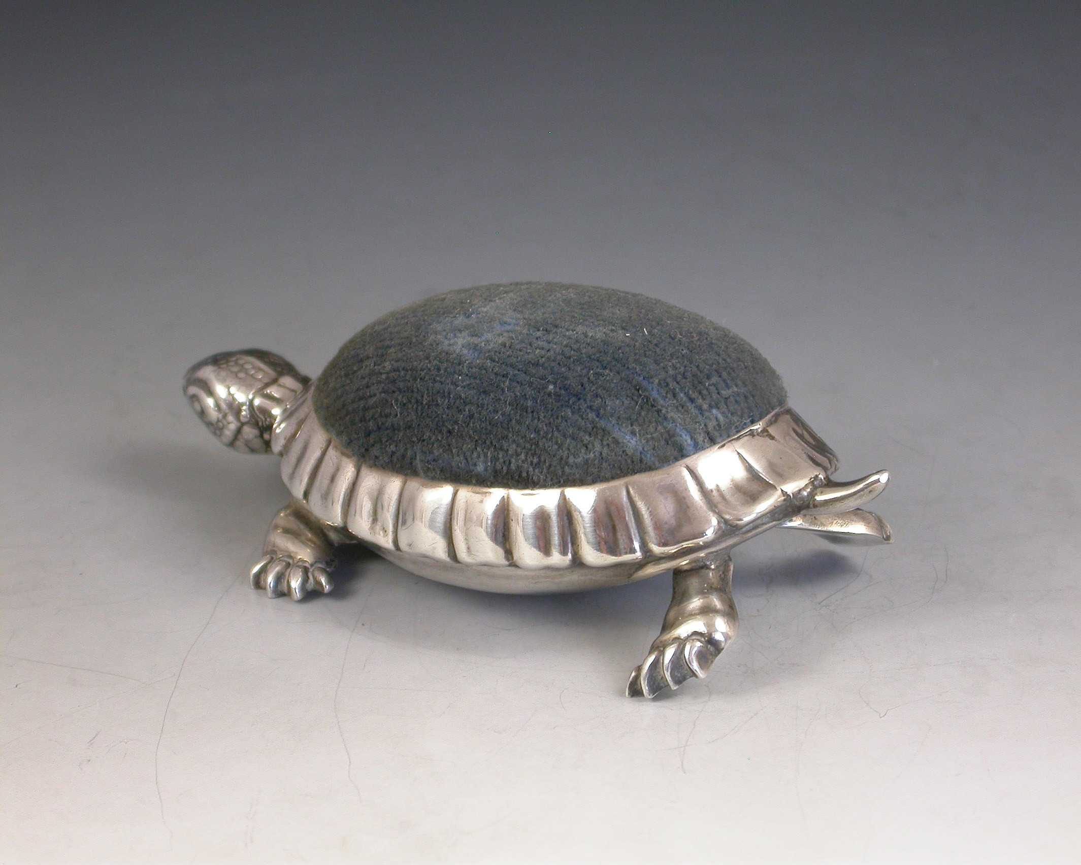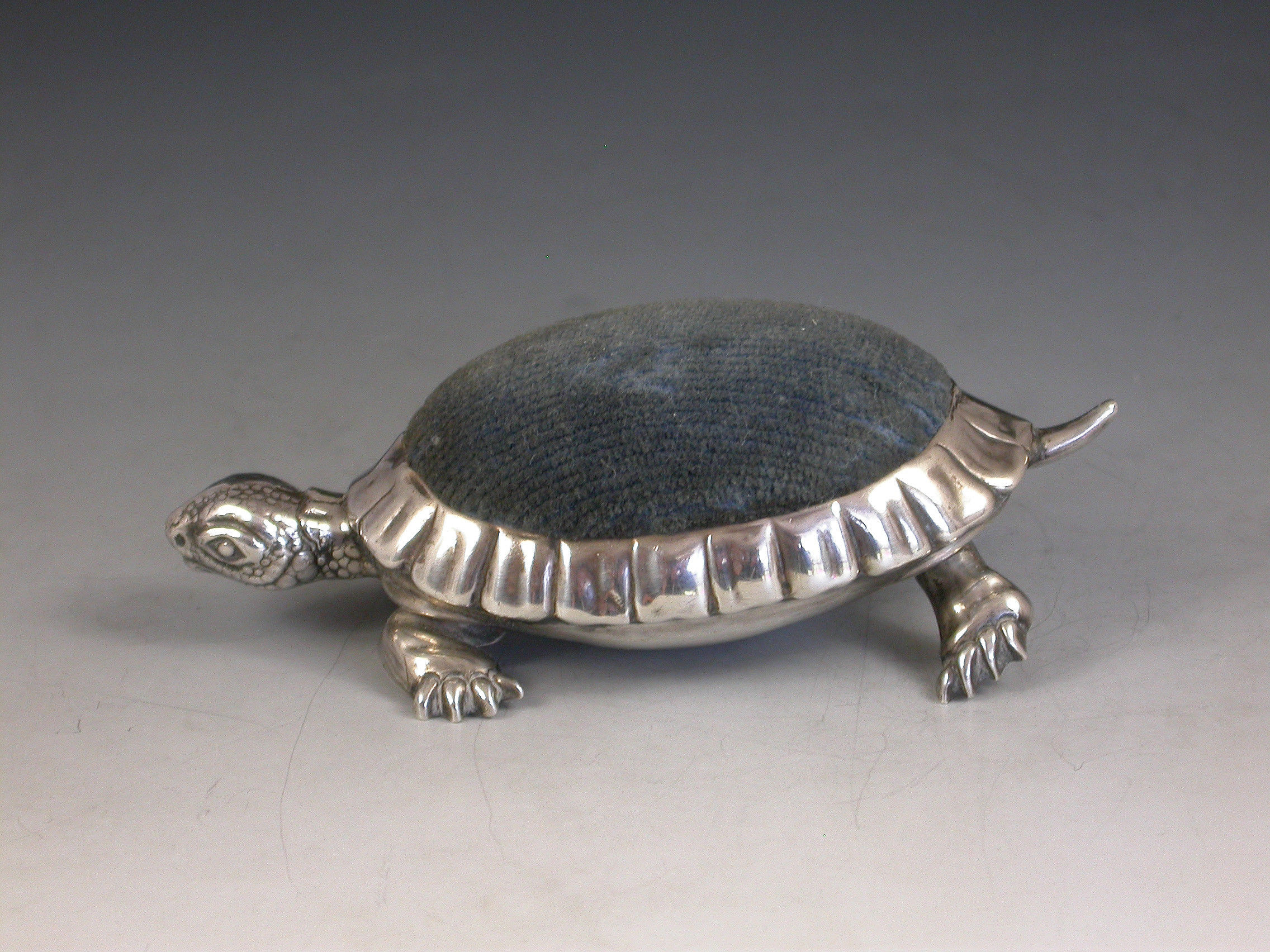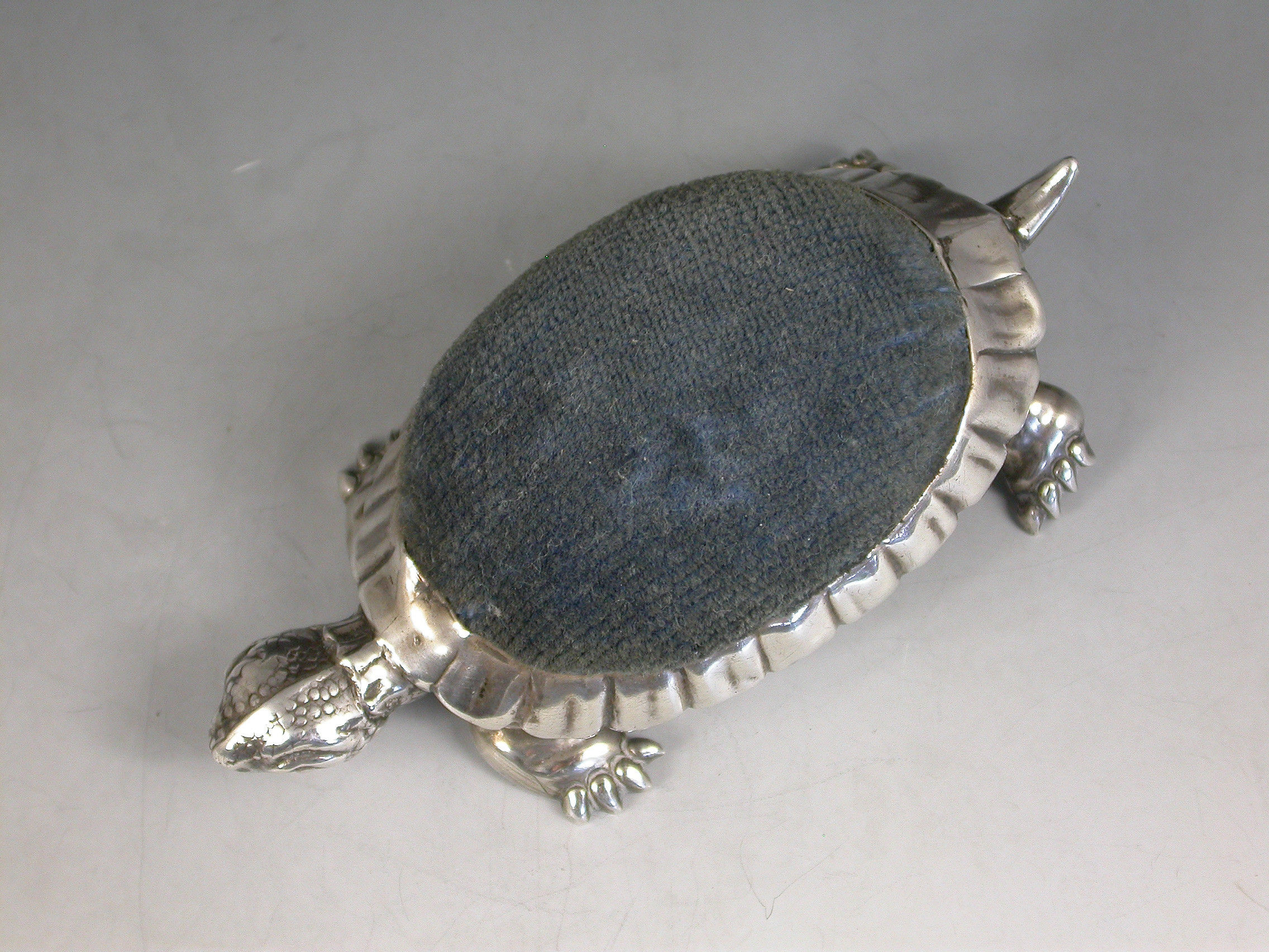 A rare Edwardian novelty silver Pin Cushion made in the form of a Tortoise with blue velvet cushion.