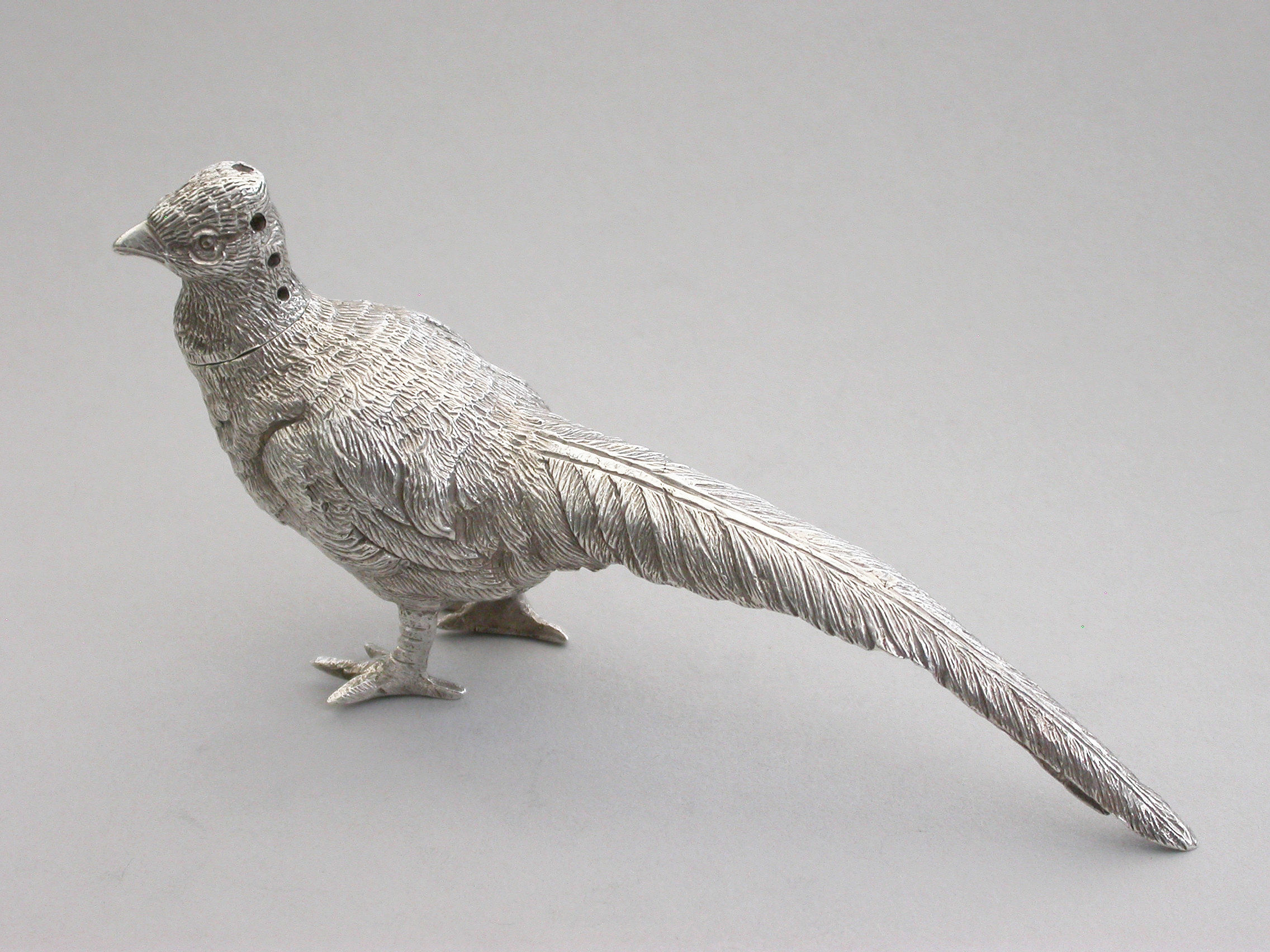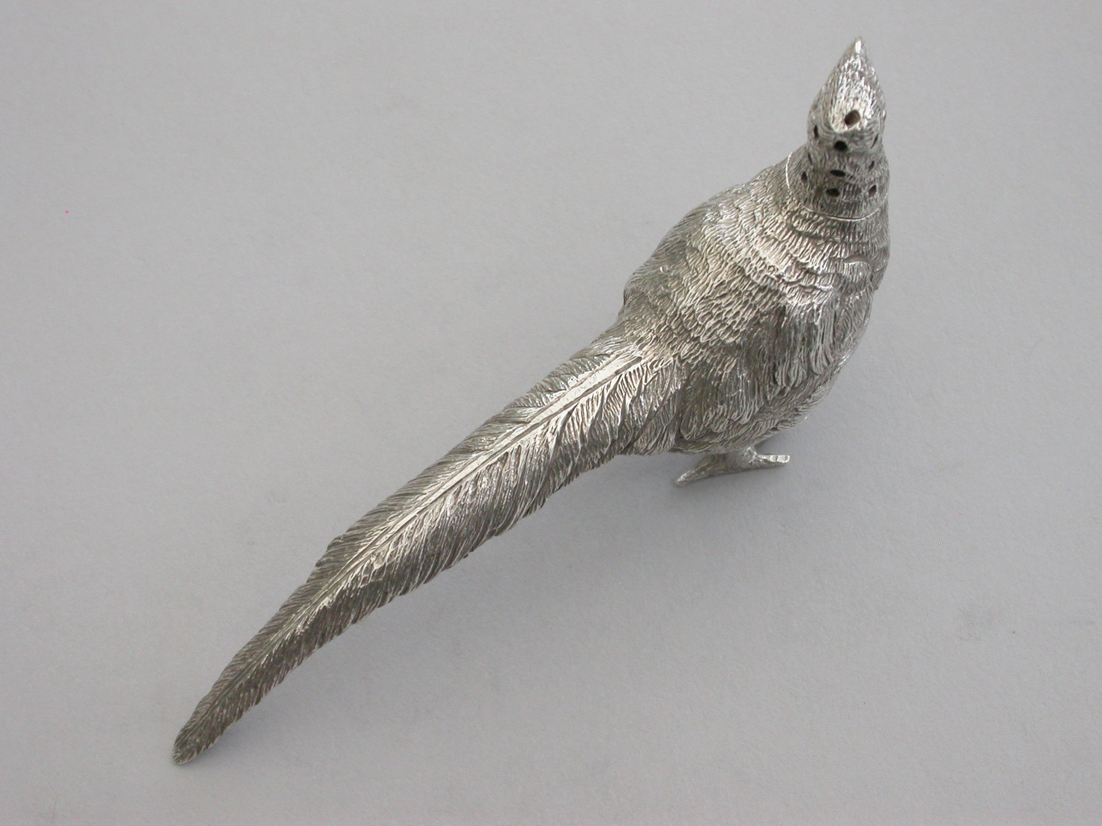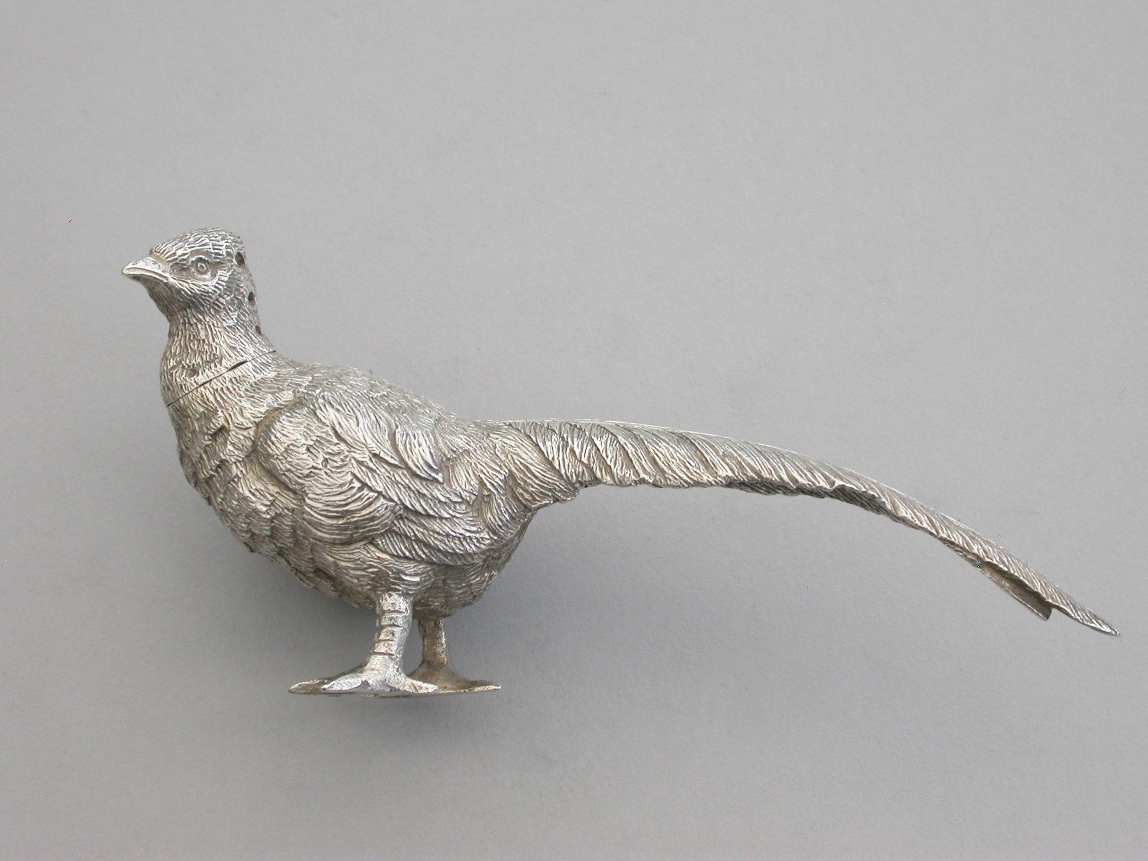 A good quality Edwardian novelty cast silver Pepper, made in the form of a Cock Pheasant, with pull-off pierced head.