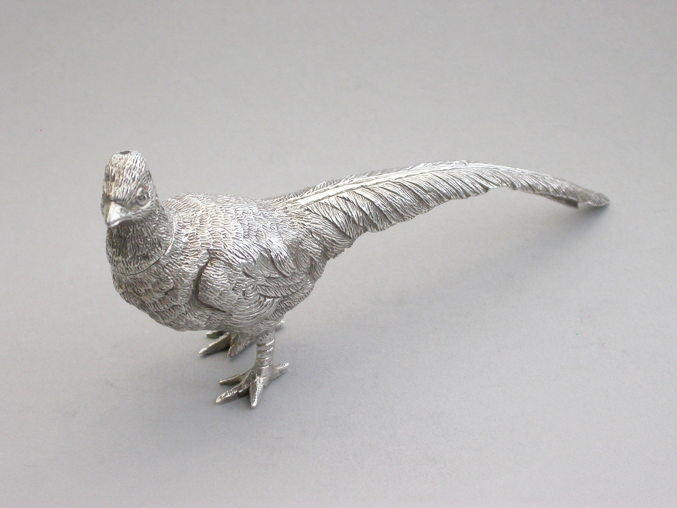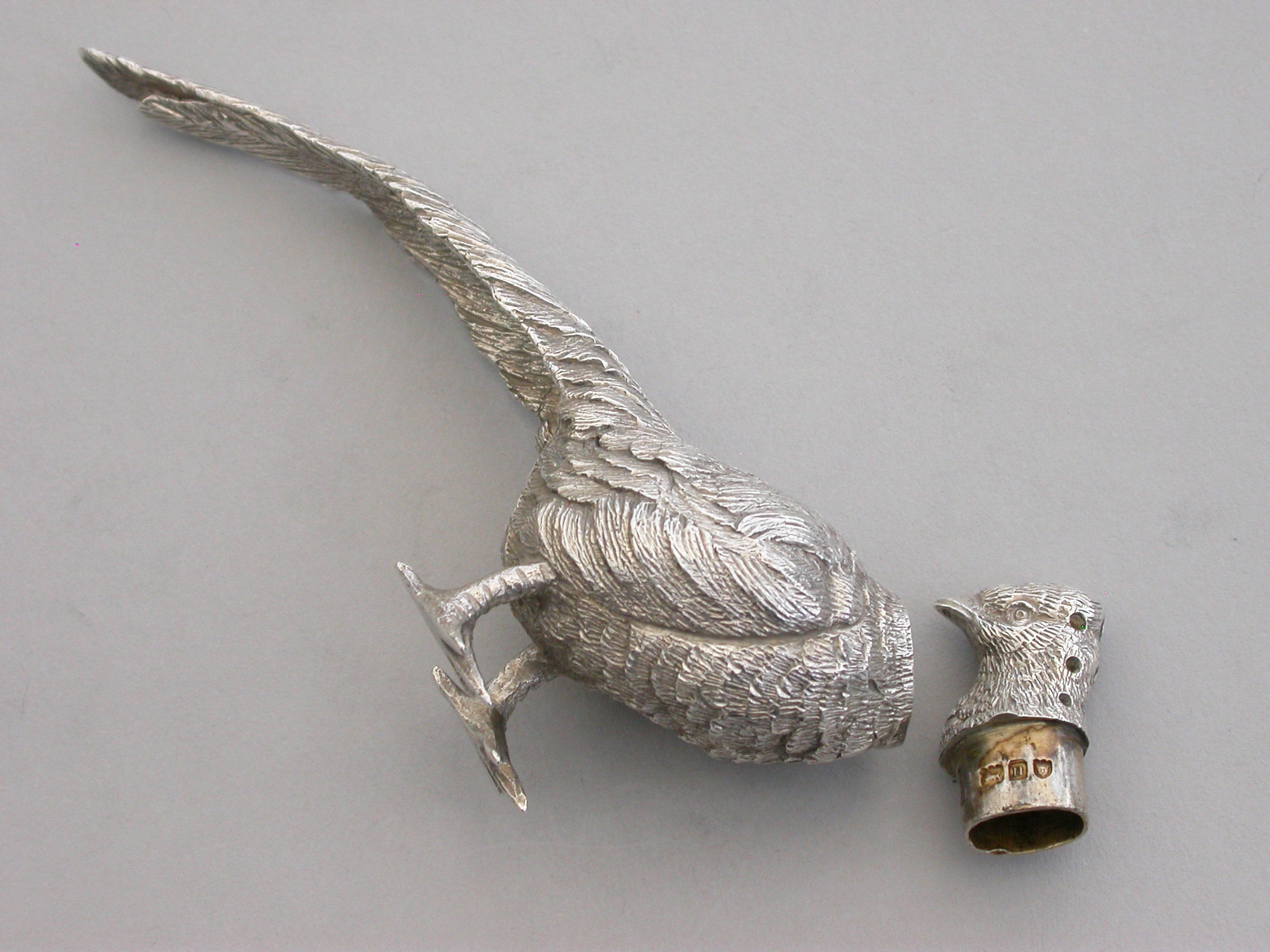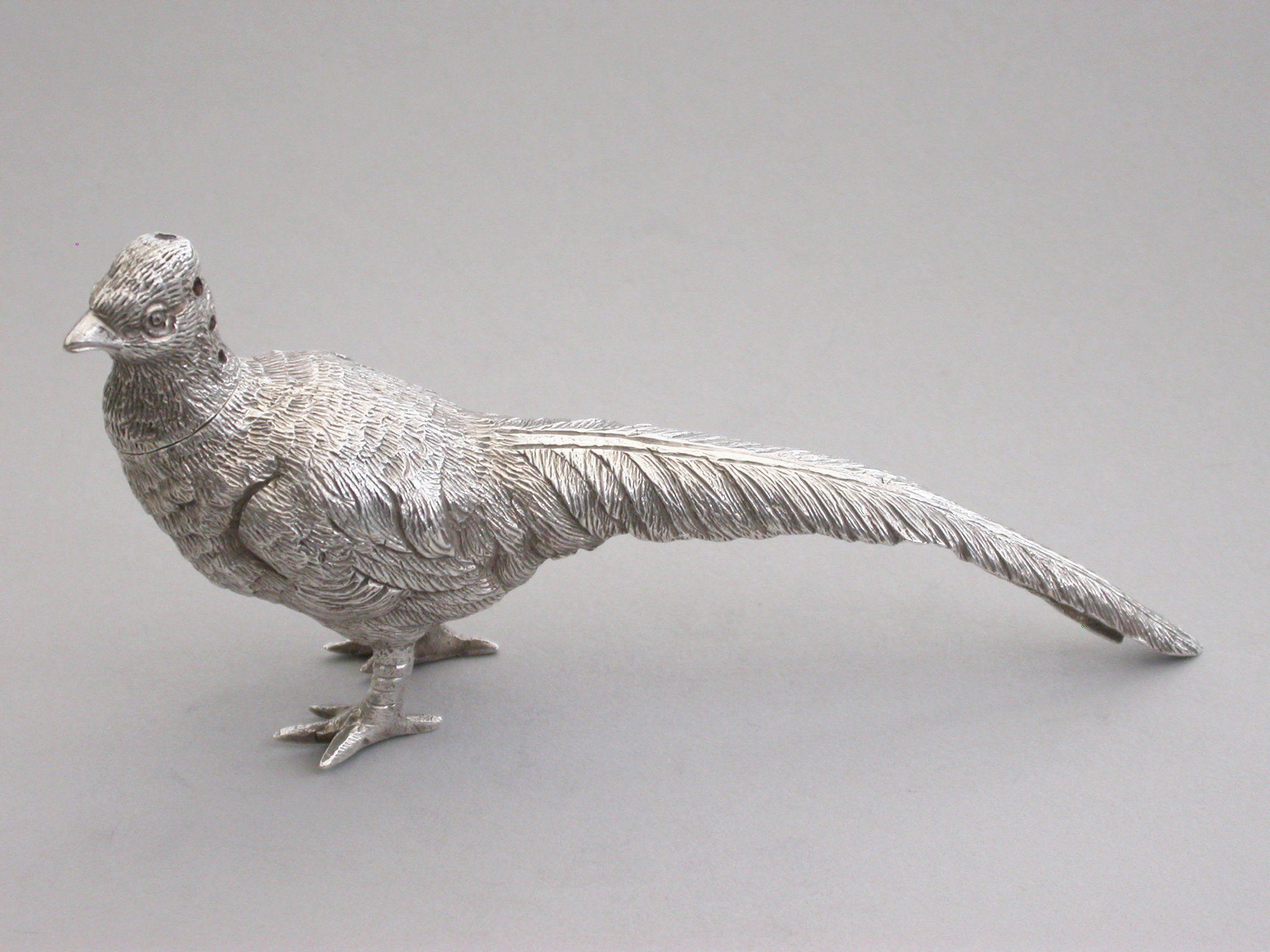 A good quality Edwardian novelty cast silver Pepper, made in the form of a Cock Pheasant, with pull-off pierced head.